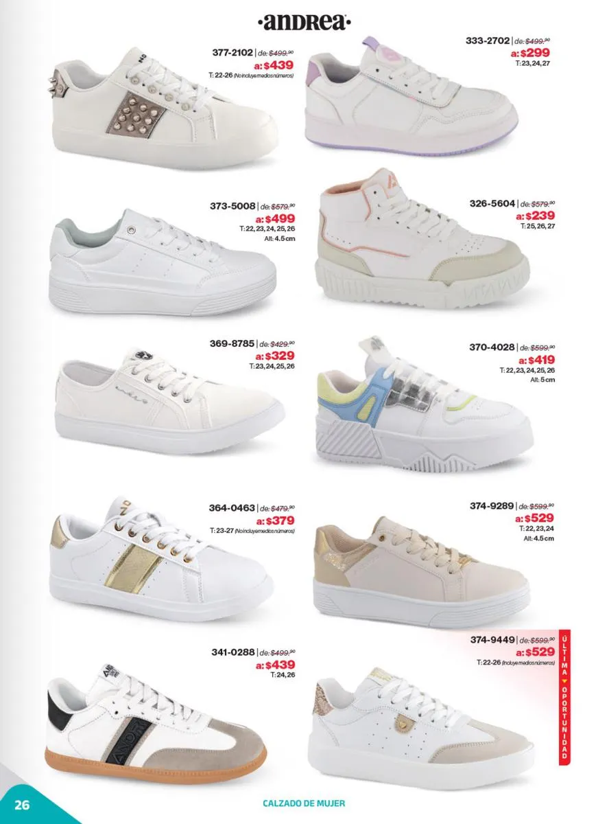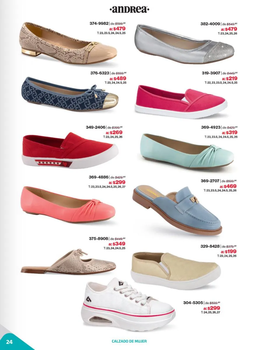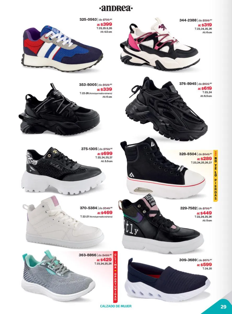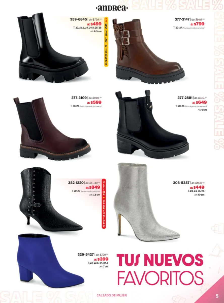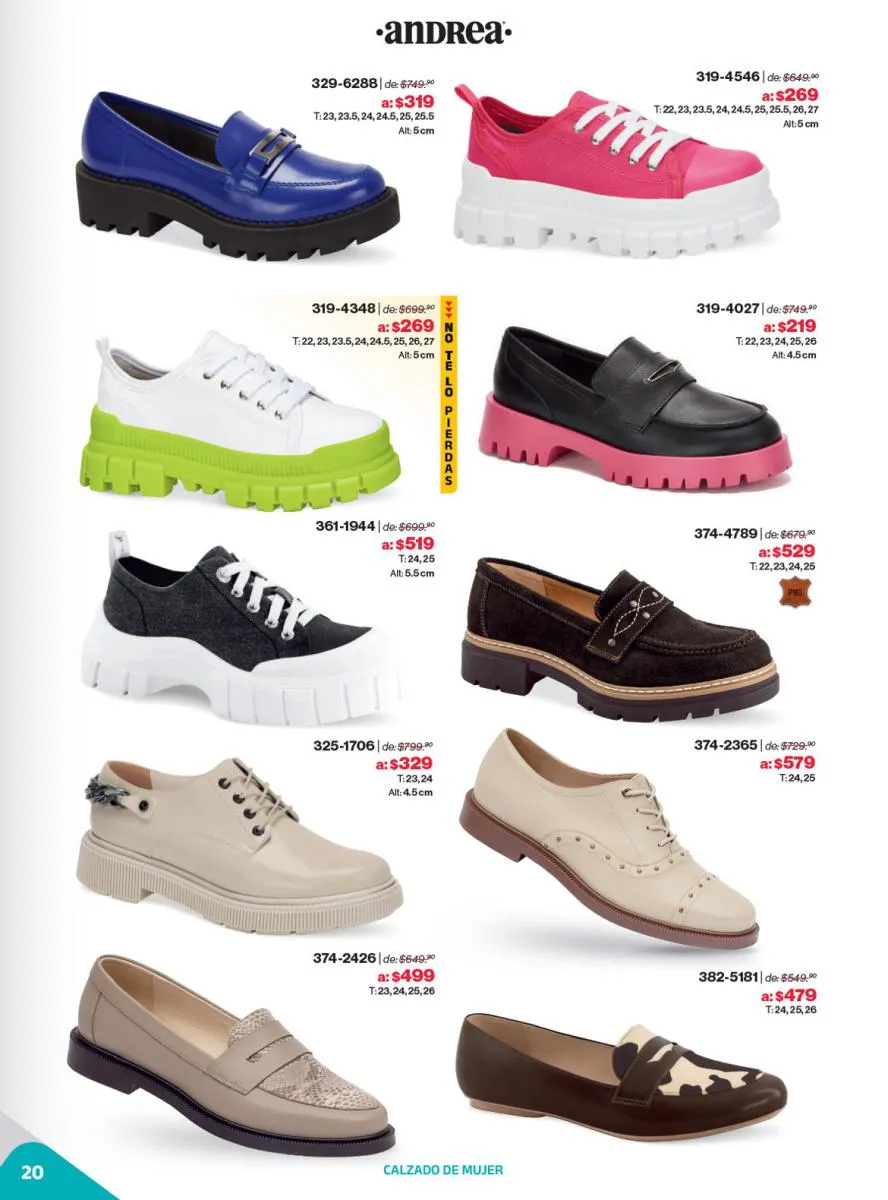 Las sandalias son un elemento esencial en cualquier guardarropa, y Andrea lo sabe muy bien. Este catálogo presenta una selección de sandalias con tacón que combinan comodidad y estilo. Destacan las sandalias en tonos vibrantes como el fucsia y el verde limón, perfectas para darle un toque de color a tus outfits veraniegos. Con detalles de correas ajustables y tacones de diferentes alturas, estas sandalias aseguran un ajuste perfecto y un look sofisticado.