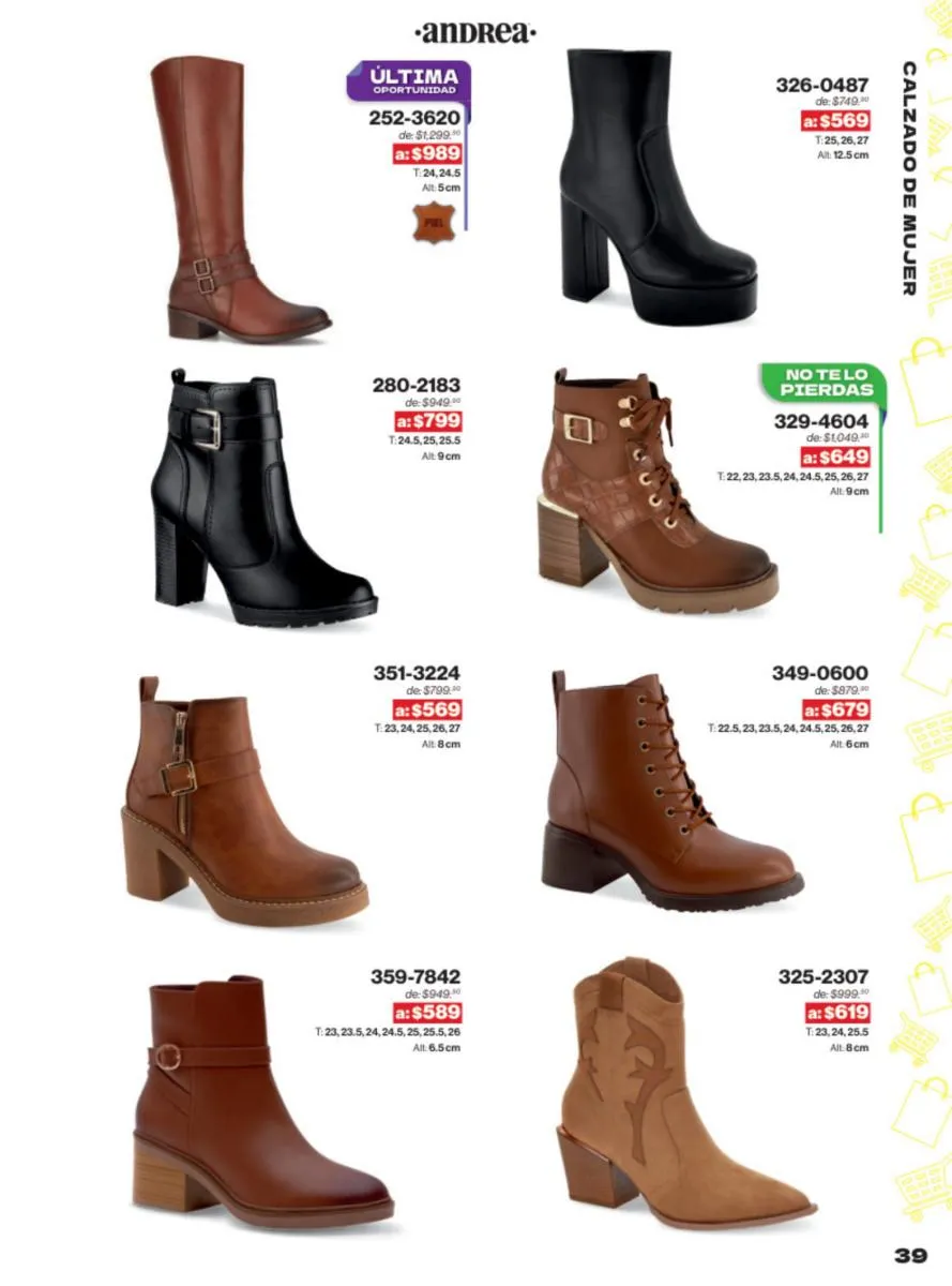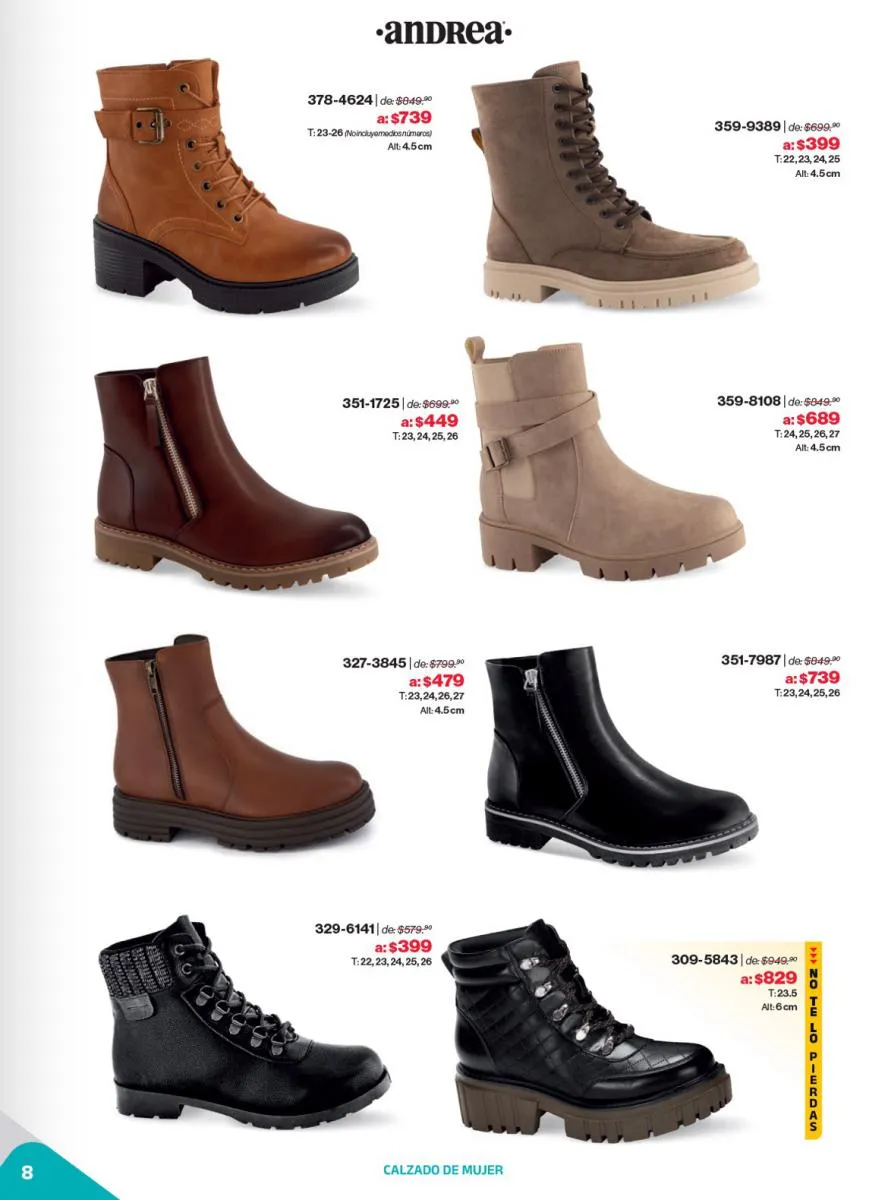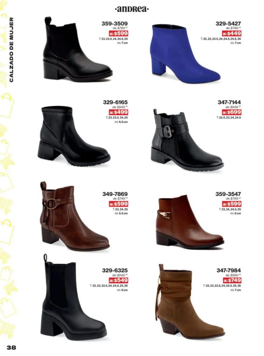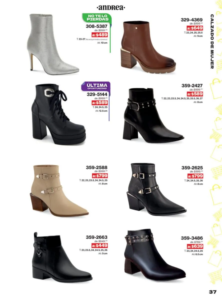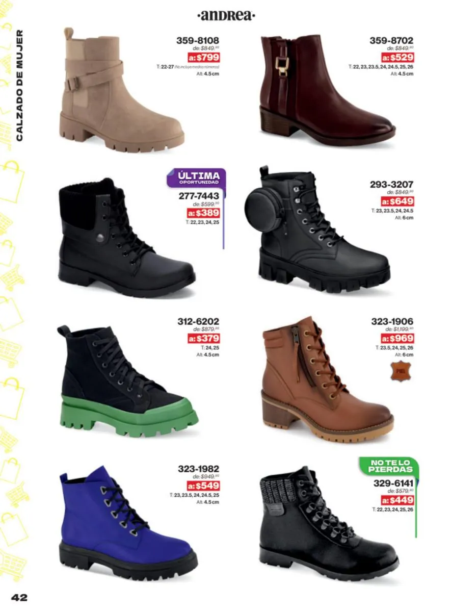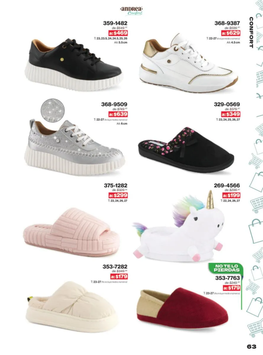 Las sandalias son un elemento esencial en cualquier guardarropa, y Andrea lo sabe muy bien. Este catálogo presenta una selección de sandalias con tacón que combinan comodidad y estilo. Destacan las sandalias en tonos vibrantes como el fucsia y el verde limón, perfectas para darle un toque de color a tus outfits veraniegos. Con detalles de correas ajustables y tacones de diferentes alturas, estas sandalias aseguran un ajuste perfecto y un look sofisticado.