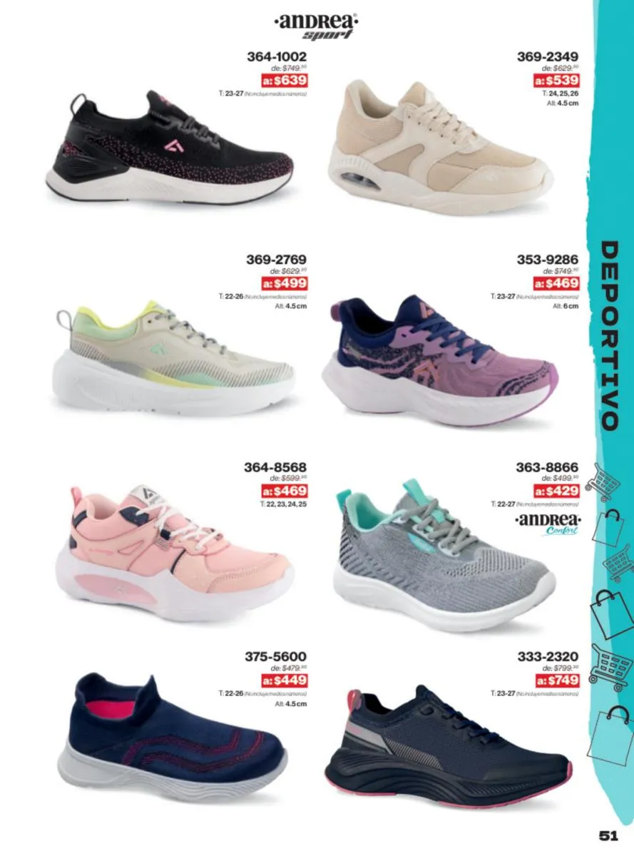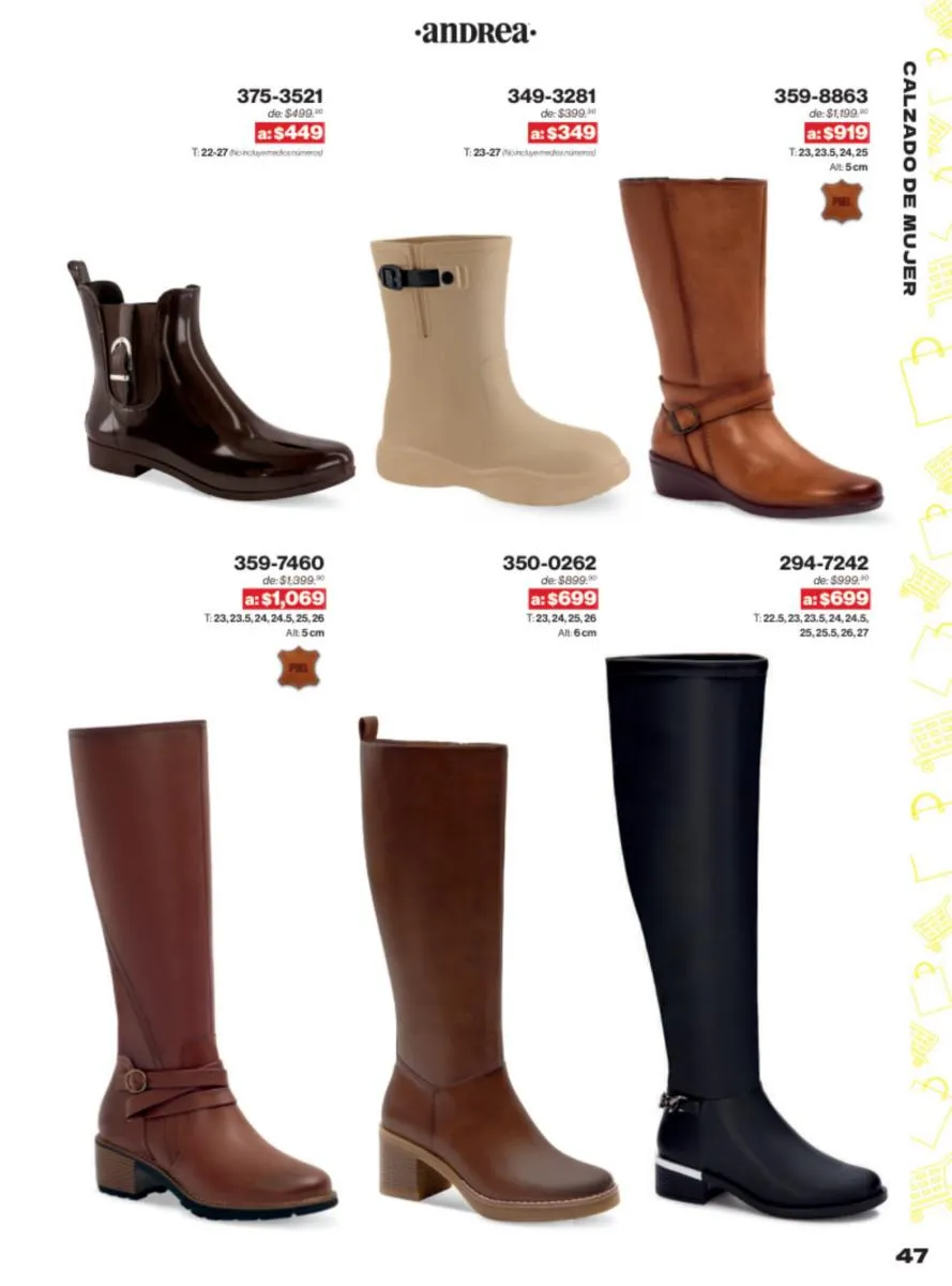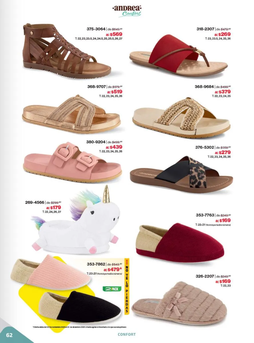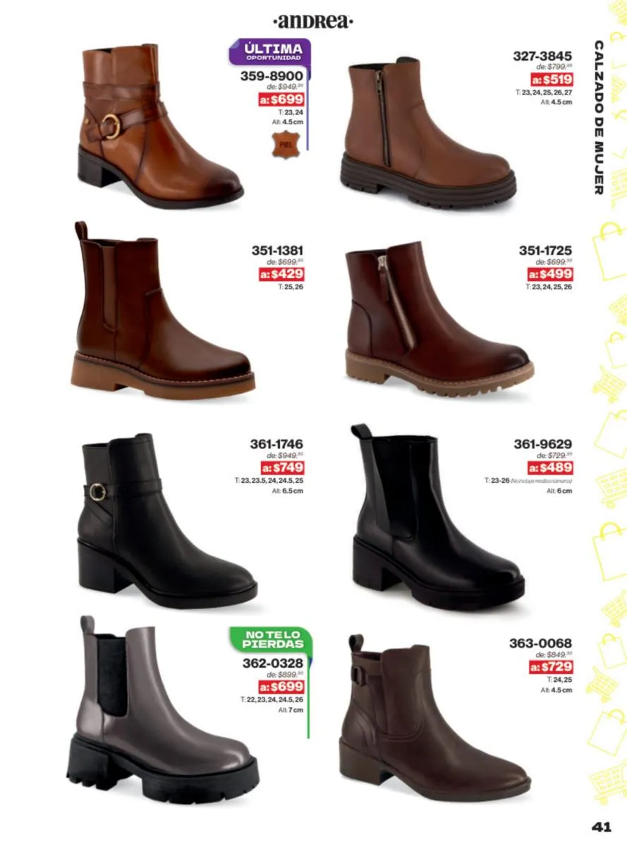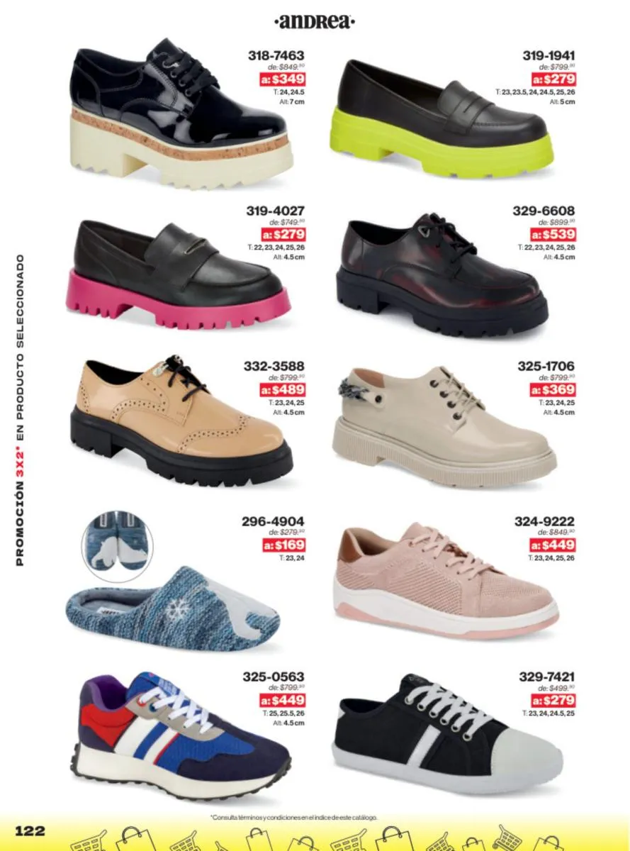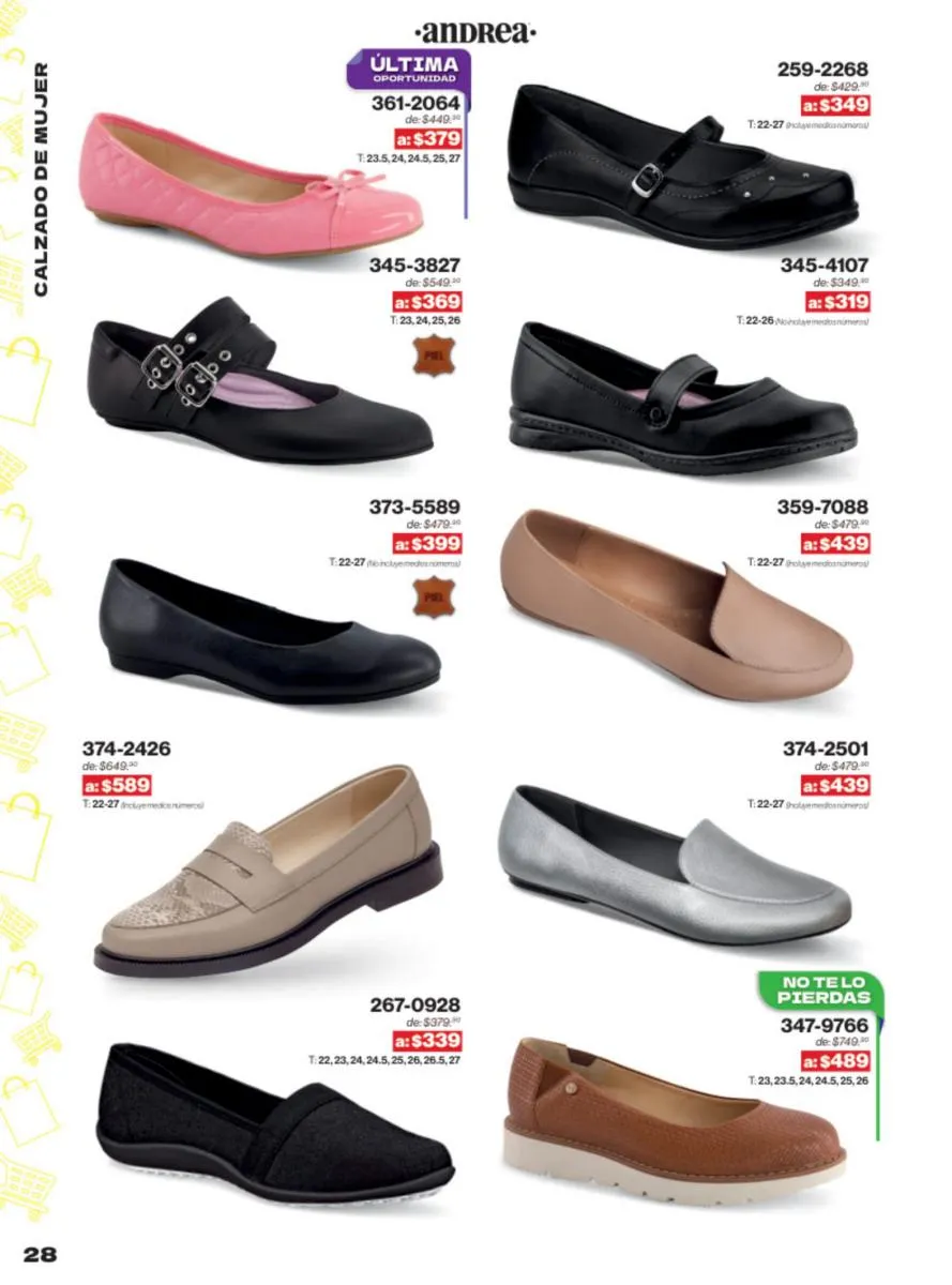 Las sandalias son un elemento esencial en cualquier guardarropa, y Andrea lo sabe muy bien. Este catálogo presenta una selección de sandalias con tacón que combinan comodidad y estilo. Destacan las sandalias en tonos vibrantes como el fucsia y el verde limón, perfectas para darle un toque de color a tus outfits veraniegos. Con detalles de correas ajustables y tacones de diferentes alturas, estas sandalias aseguran un ajuste perfecto y un look sofisticado.