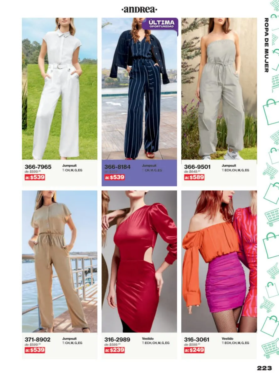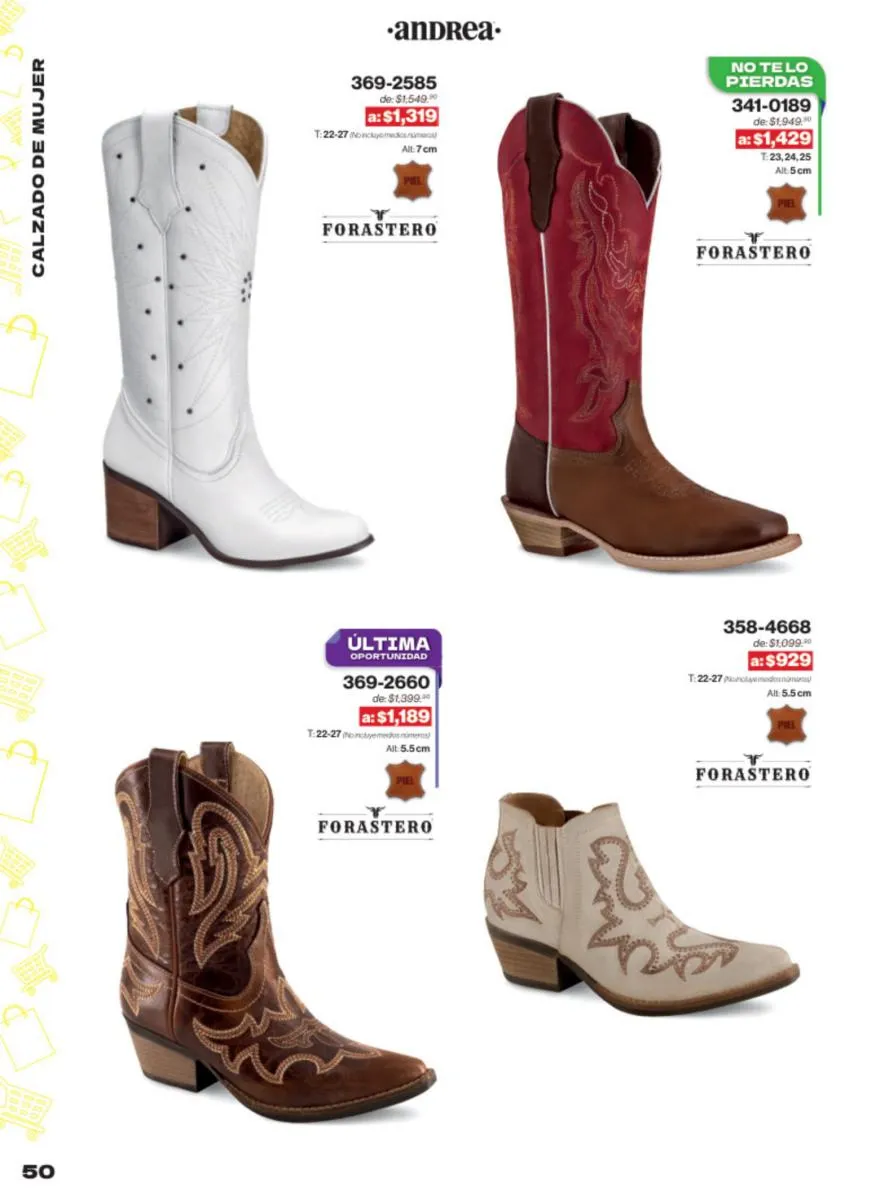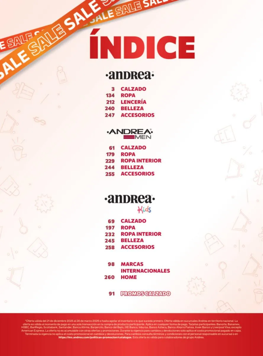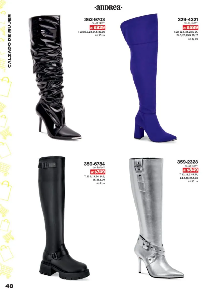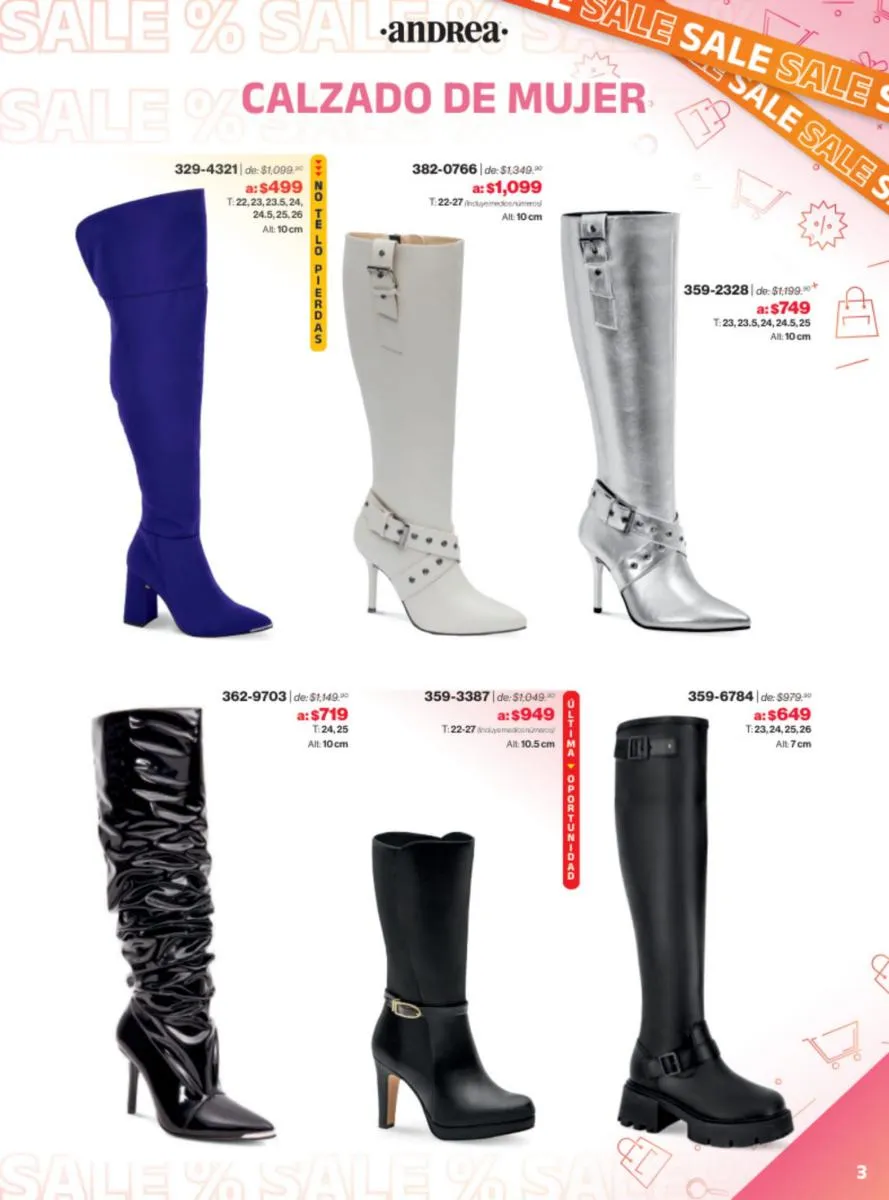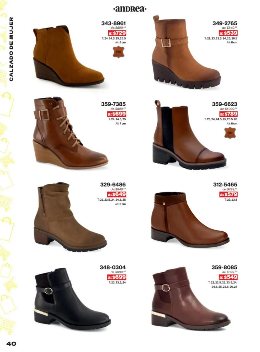 Las sandalias son un elemento esencial en cualquier guardarropa, y Andrea lo sabe muy bien. Este catálogo presenta una selección de sandalias con tacón que combinan comodidad y estilo. Destacan las sandalias en tonos vibrantes como el fucsia y el verde limón, perfectas para darle un toque de color a tus outfits veraniegos. Con detalles de correas ajustables y tacones de diferentes alturas, estas sandalias aseguran un ajuste perfecto y un look sofisticado.