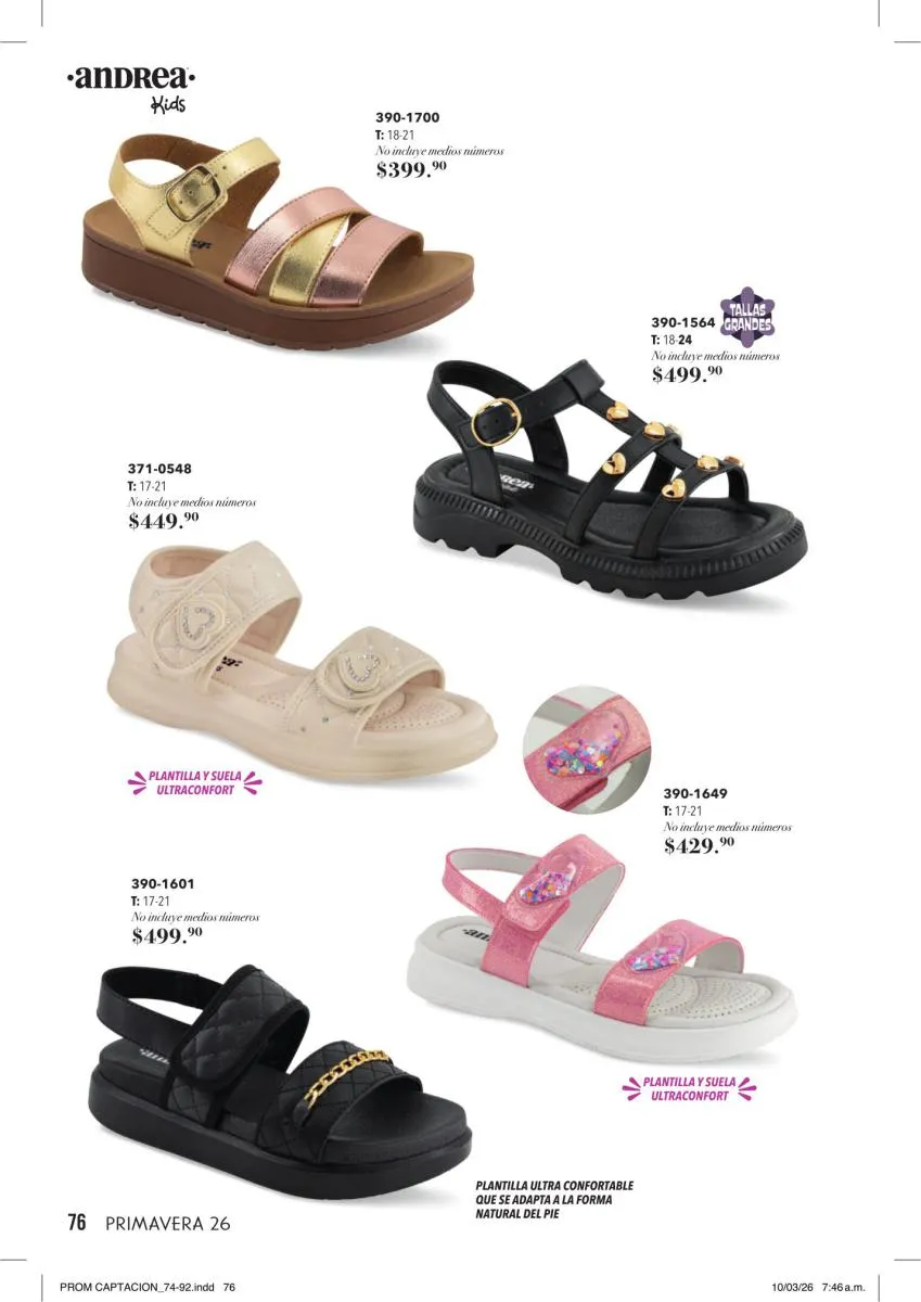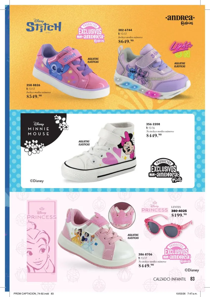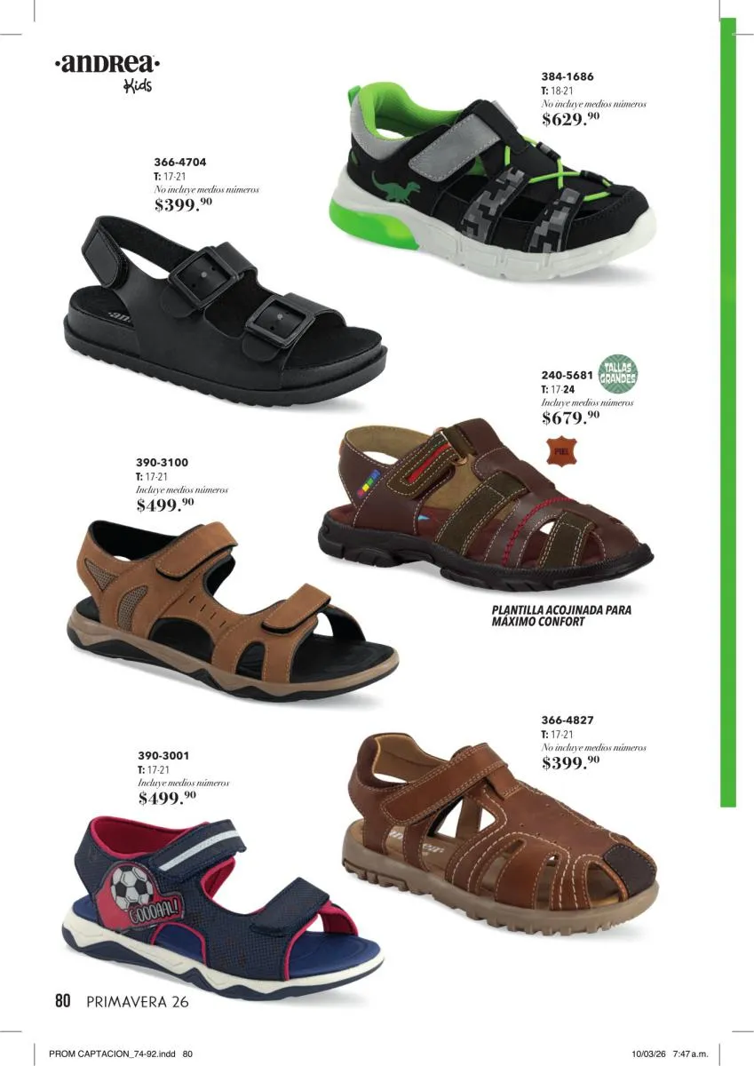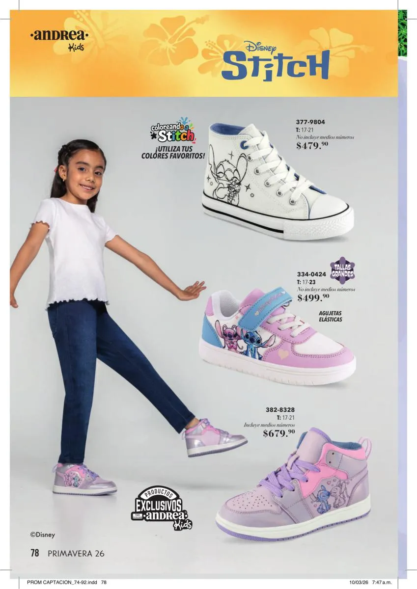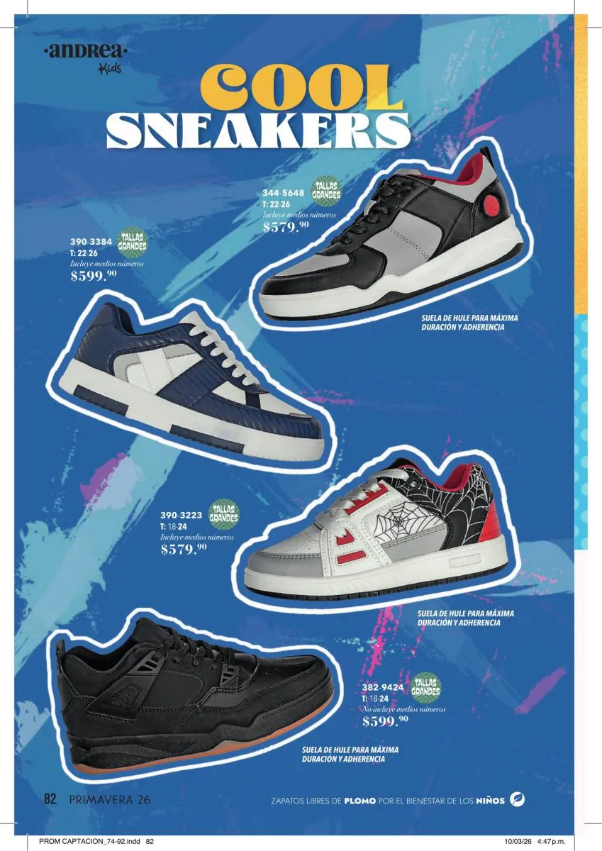 ¡También los niños pueden sentirse super cool con las ofertas de Andrea Kids! Todo lo necesario para tener un Primavera divertido y lleno de nuevas experiencias lo tienes aquí. Comenzando por el calzado, tienes un montón de opciones de sandalias ligeras para una salida en la playa o para realizar aventuras con los aqua shoes de lindos diseños para descubrir nuevos lugares, estar ligeros, y pasar un buen momento con amigos o familia. Para salidas en la ciudad y estar a tono con las tendencias, campaña Andrea 2026 te recomienda los calzados con luces o los duo packs para tener más de una opción cuando estamos indecisos a la hora de lookearse. Para los babys puedes beneficiarte con un montón de diseños de zapatillas con luces de colores, y sandalias super lindas y totalmente lavables, ¡hasta las plantillas!