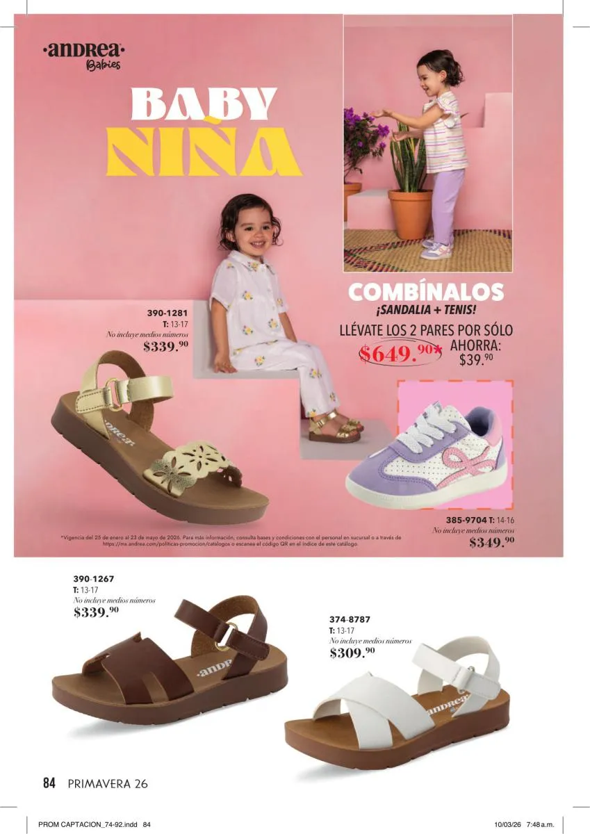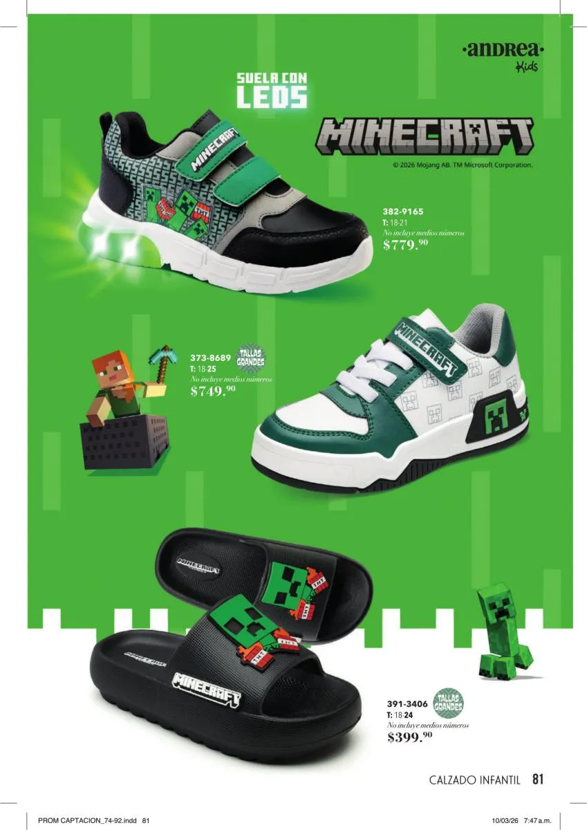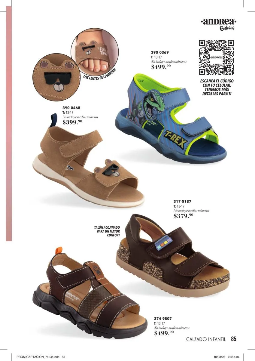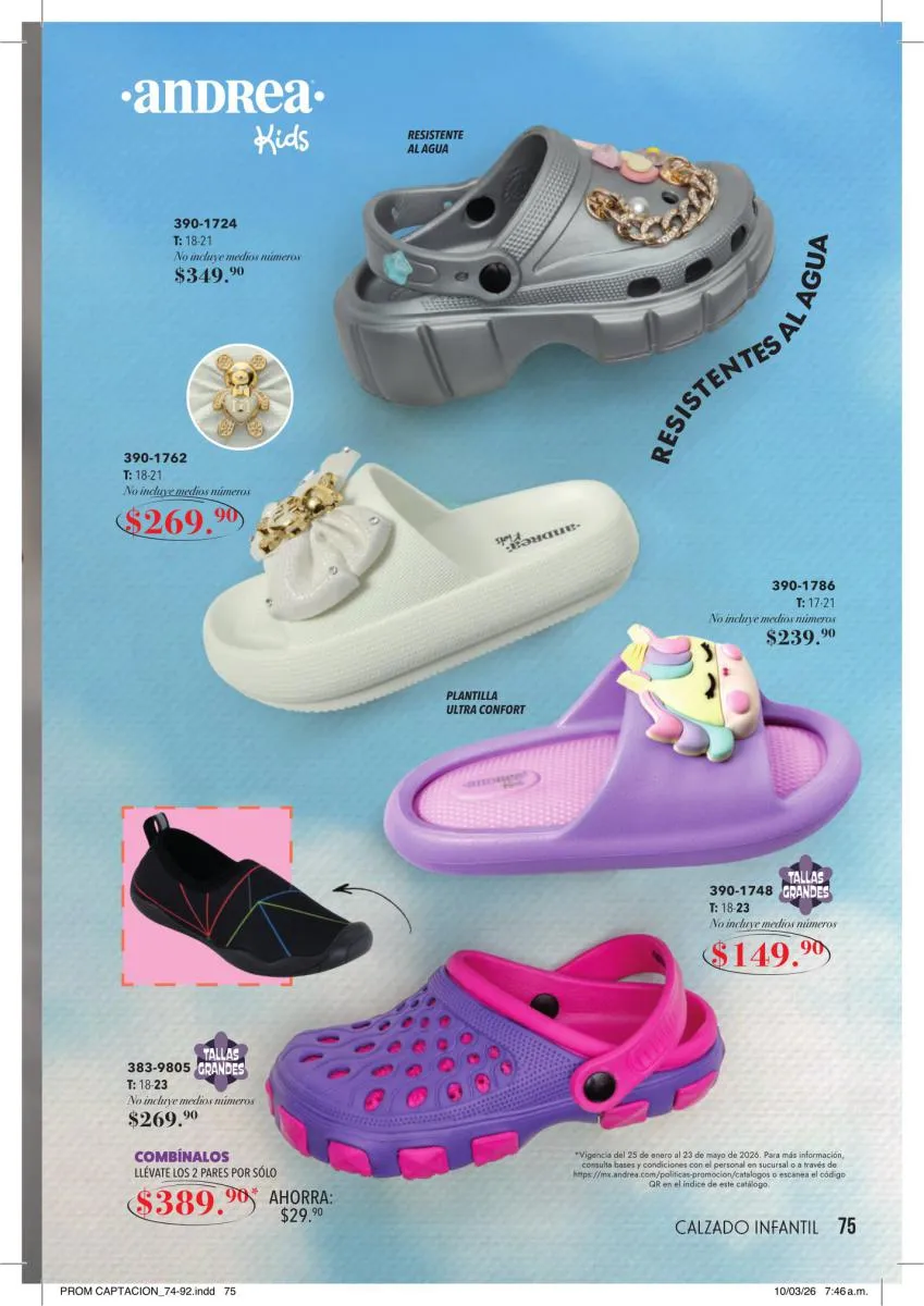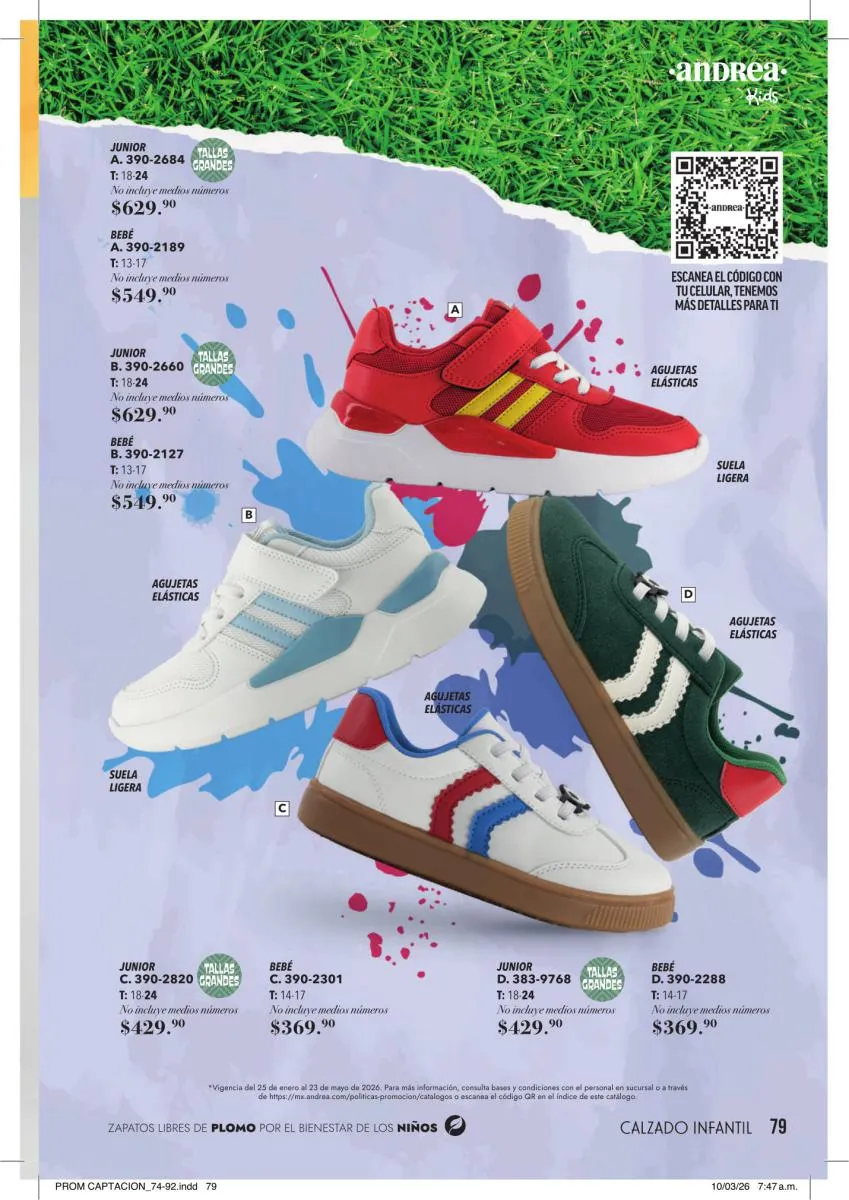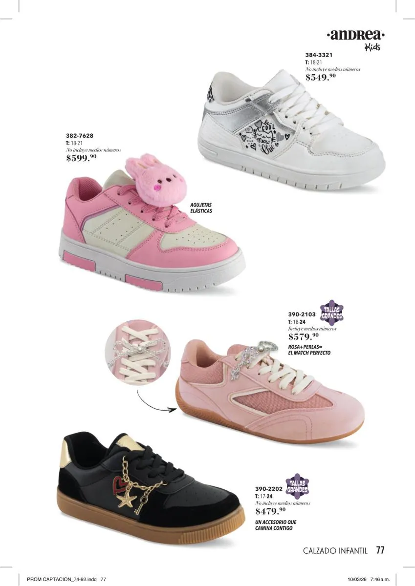 ¡También los niños pueden sentirse super cool con las ofertas de Andrea Kids! Todo lo necesario para tener un Primavera divertido y lleno de nuevas experiencias lo tienes aquí. Comenzando por el calzado, tienes un montón de opciones de sandalias ligeras para una salida en la playa o para realizar aventuras con los aqua shoes de lindos diseños para descubrir nuevos lugares, estar ligeros, y pasar un buen momento con amigos o familia. Para salidas en la ciudad y estar a tono con las tendencias, campaña Andrea 2026 te recomienda los calzados con luces o los duo packs para tener más de una opción cuando estamos indecisos a la hora de lookearse. Para los babys puedes beneficiarte con un montón de diseños de zapatillas con luces de colores, y sandalias super lindas y totalmente lavables, ¡hasta las plantillas!