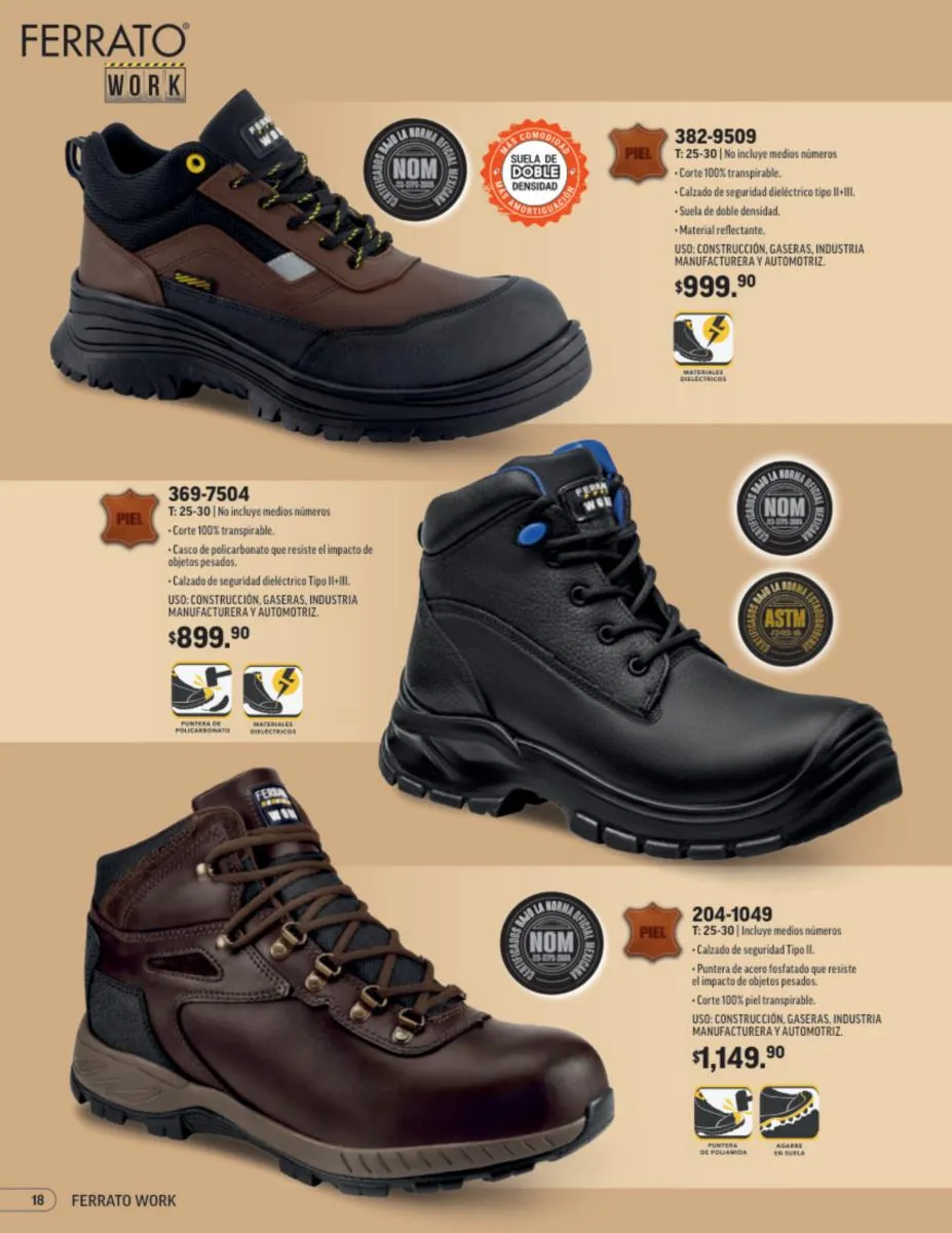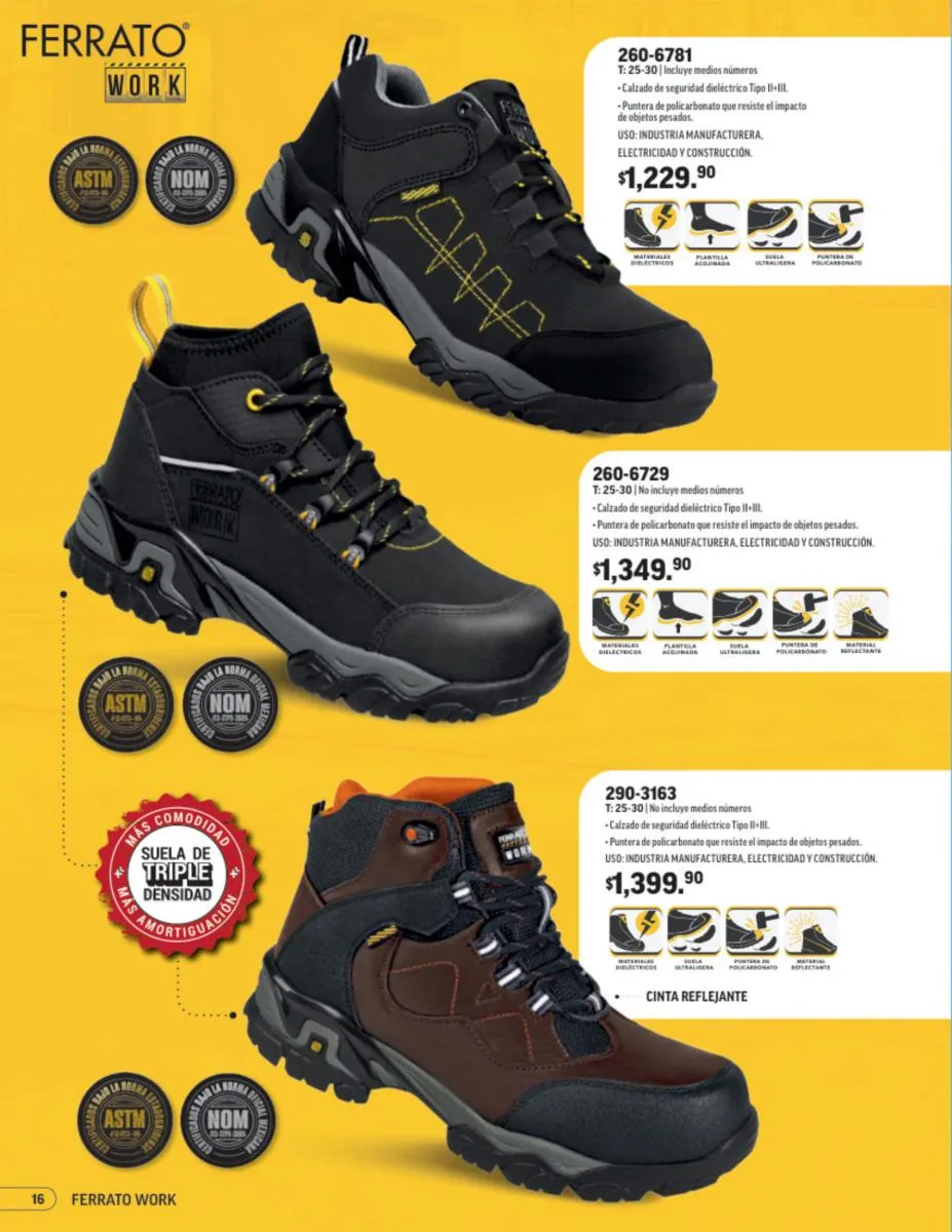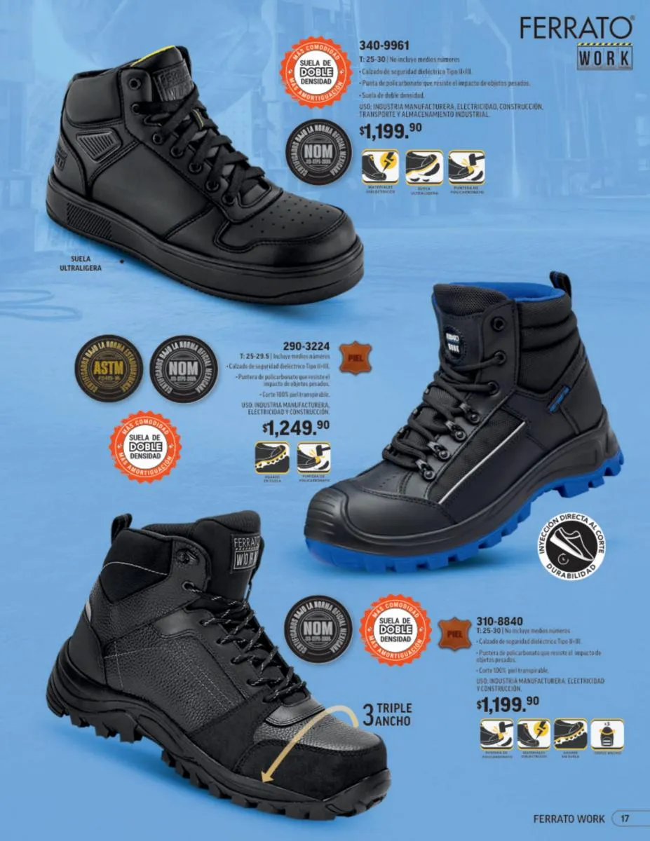 La línea Ferrato Work se destaca por su robustez y tecnología avanzada, diseñada específicamente para resistir las condiciones más extremas del entorno laboral. Un ejemplo es el modelo de botas de seguridad dieléctrica con puntera de poliamida, que protege contra impactos y ofrece un agarre excepcional gracias a su suela antideslizante. Estas botas están pensadas para industrias como la manufacturera, eléctrica y de construcción, garantizando seguridad y confort durante largas jornadas de trabajo.