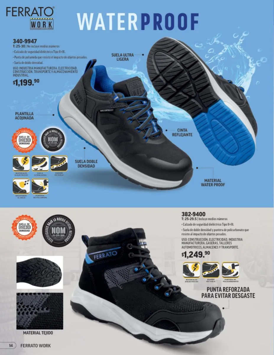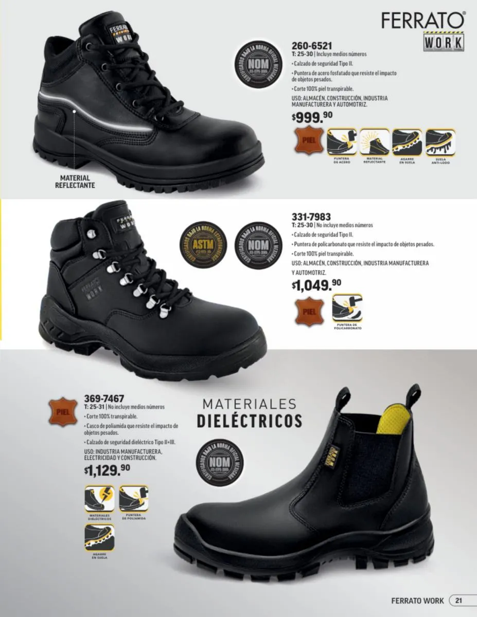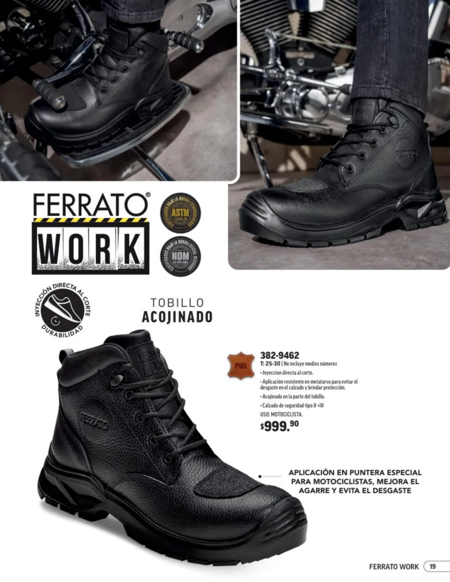 La línea Ferrato Work se destaca por su robustez y tecnología avanzada, diseñada específicamente para resistir las condiciones más extremas del entorno laboral. Un ejemplo es el modelo de botas de seguridad dieléctrica con puntera de poliamida, que protege contra impactos y ofrece un agarre excepcional gracias a su suela antideslizante. Estas botas están pensadas para industrias como la manufacturera, eléctrica y de construcción, garantizando seguridad y confort durante largas jornadas de trabajo.