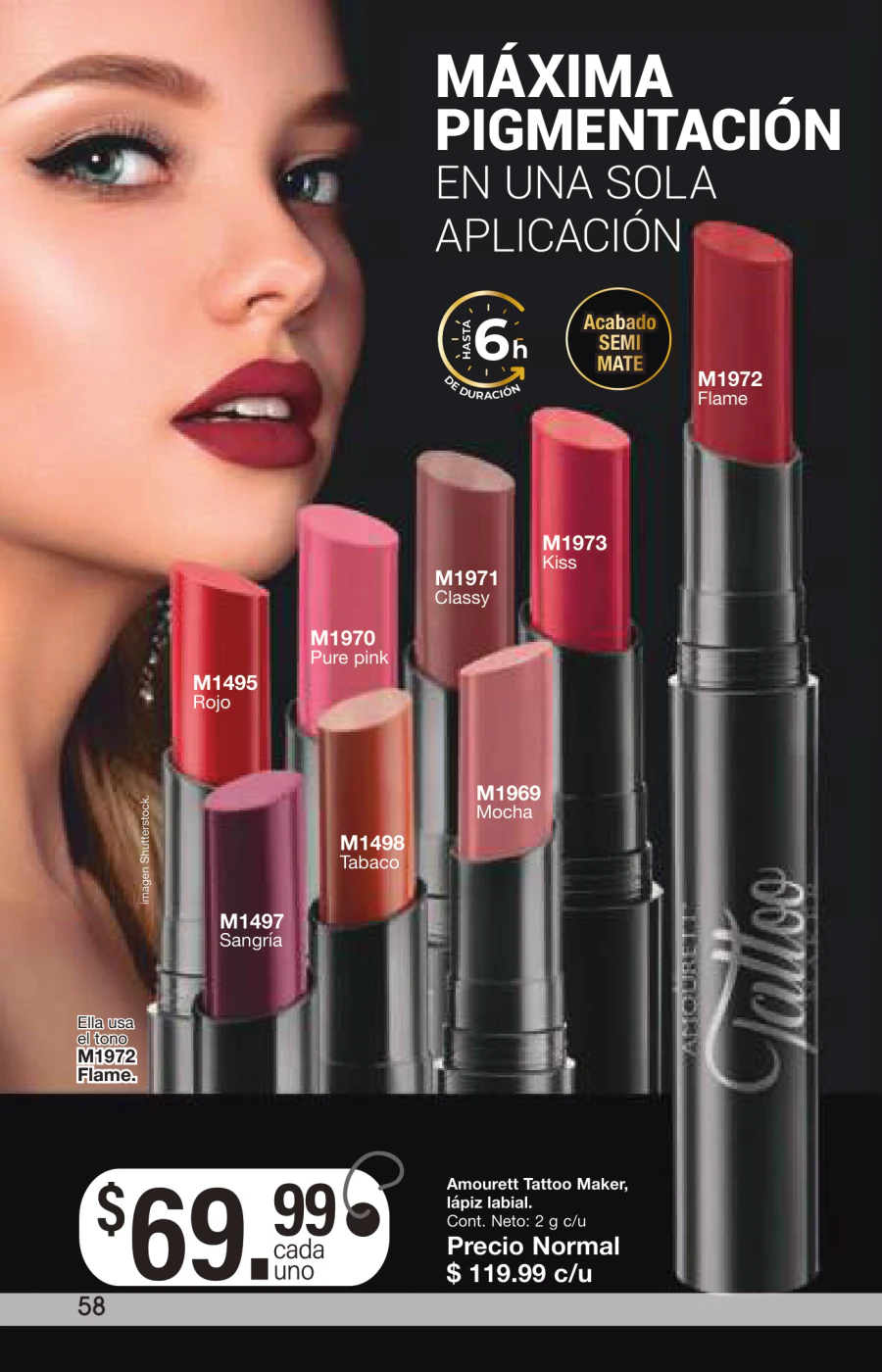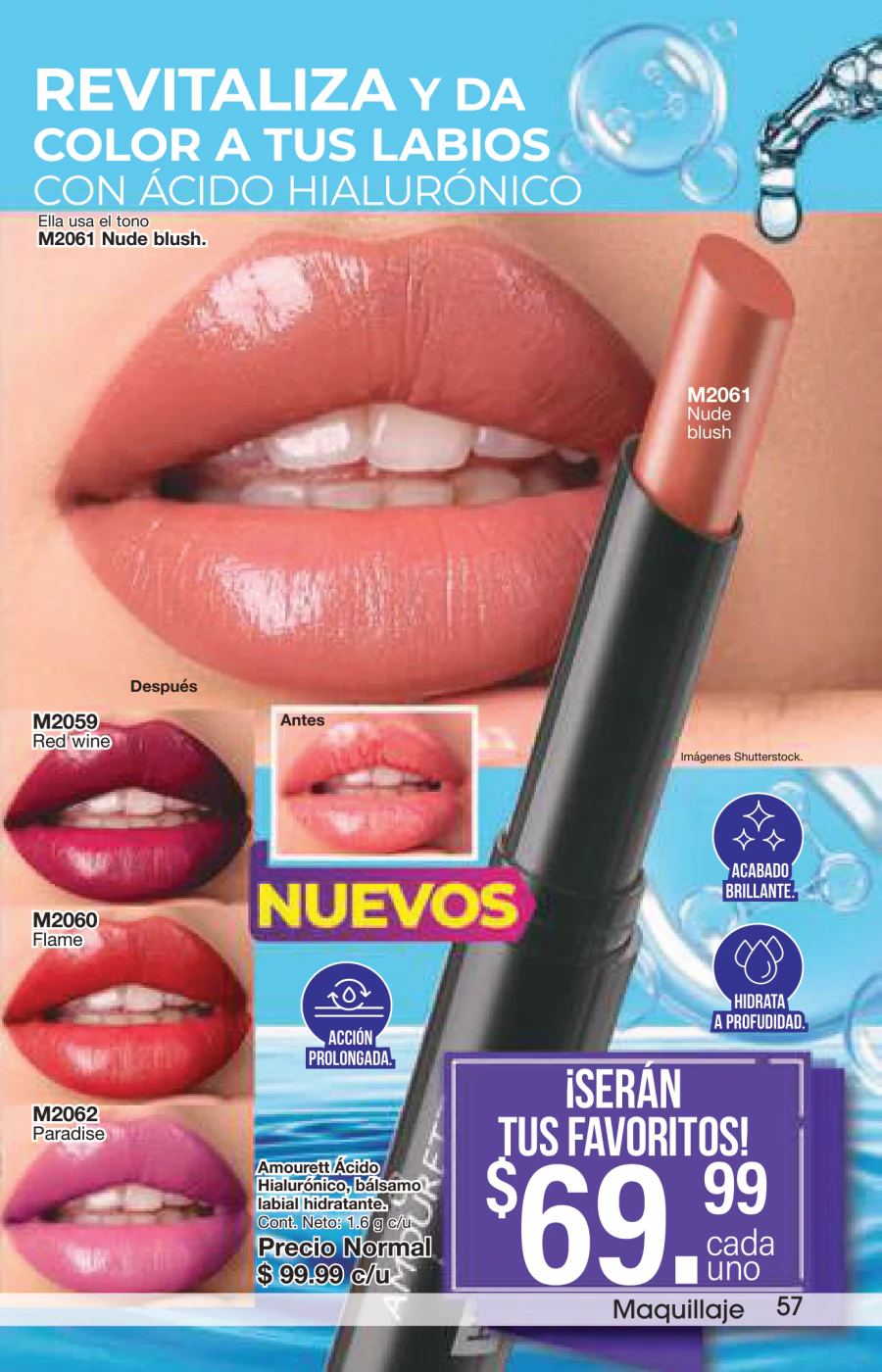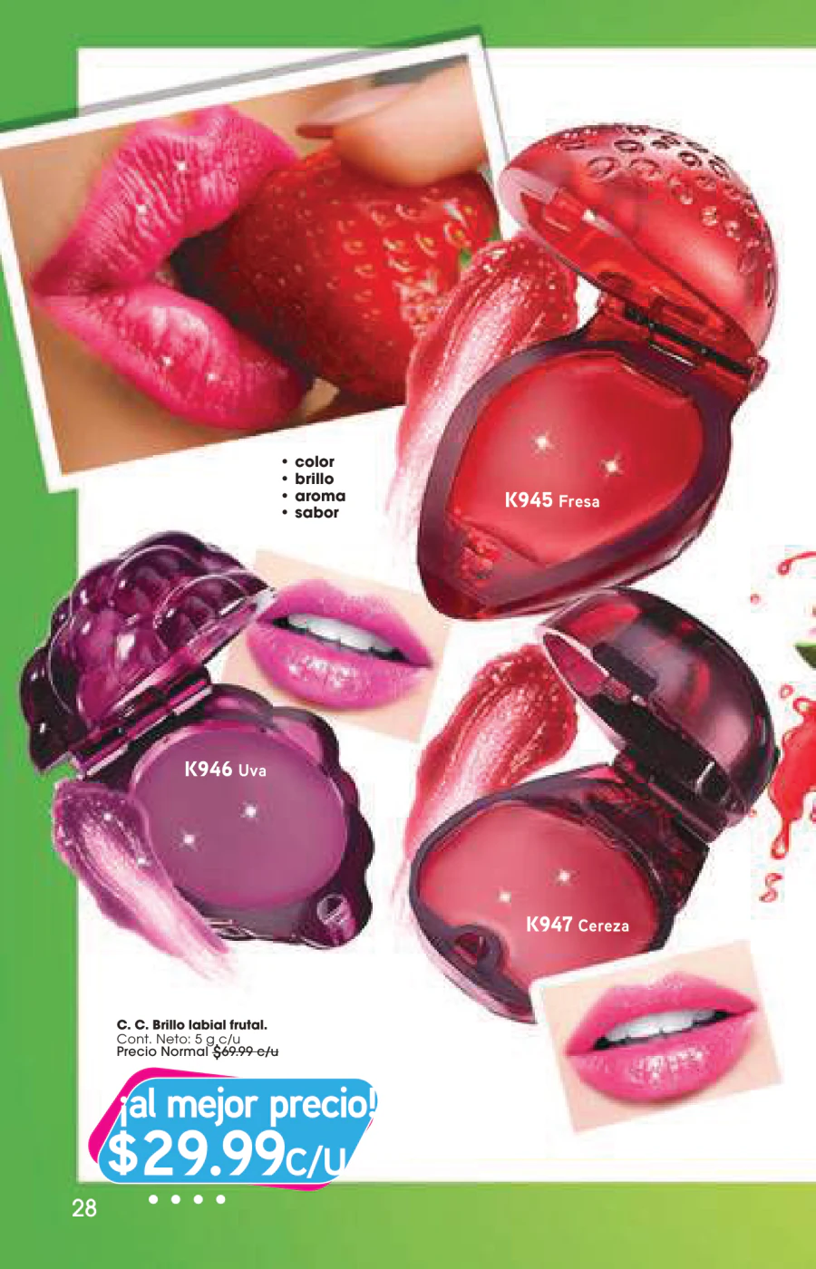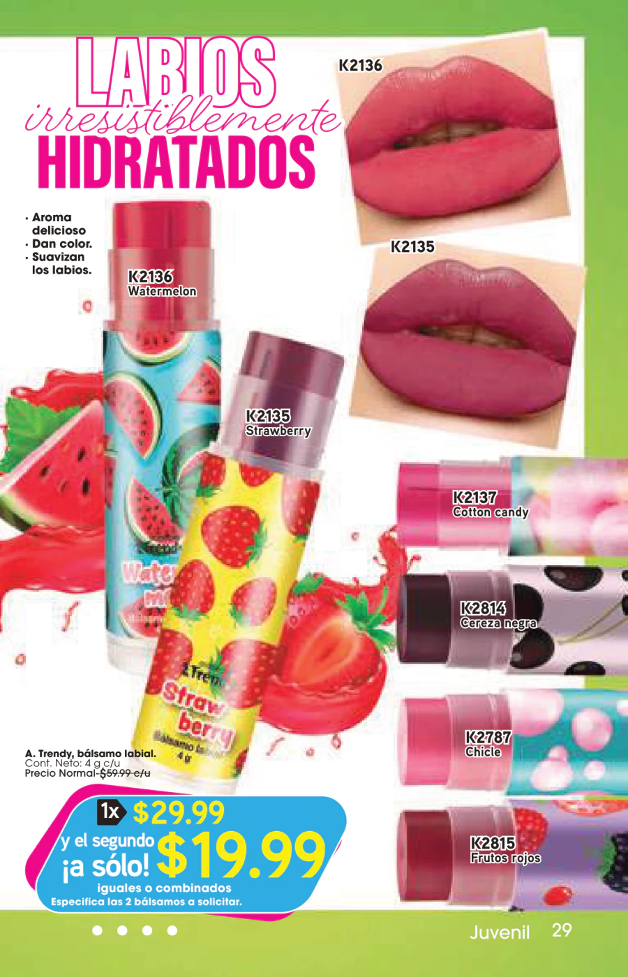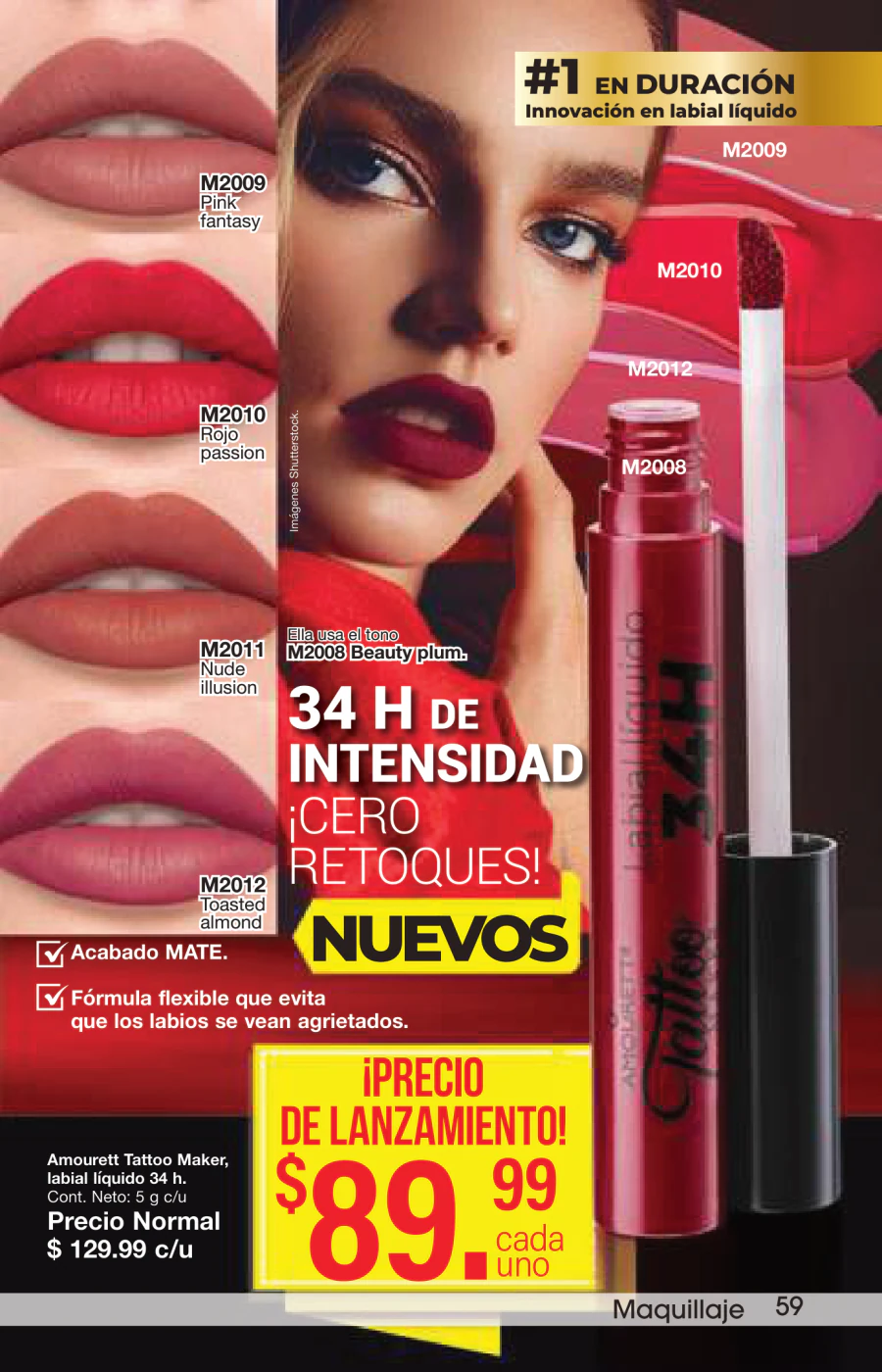 - Lápiz labial para nutrir tus labios; duración hasta 8 horas; labios resecos; labial mate; “peel off” etc. (Págs. 6, 7, 13, 15, 22, 23, 32, 39.)