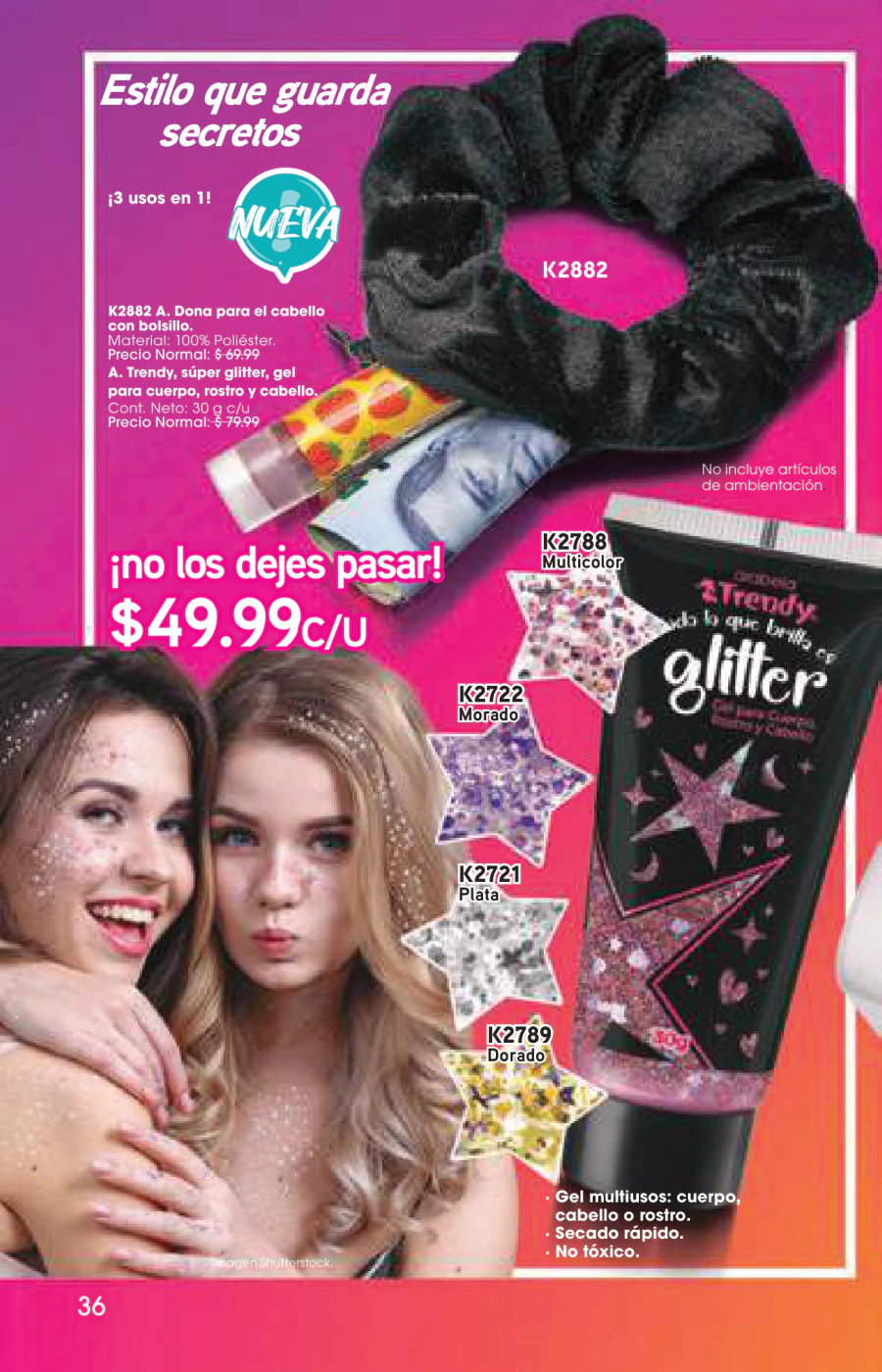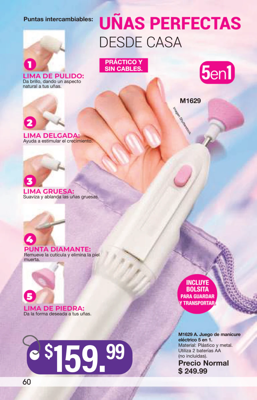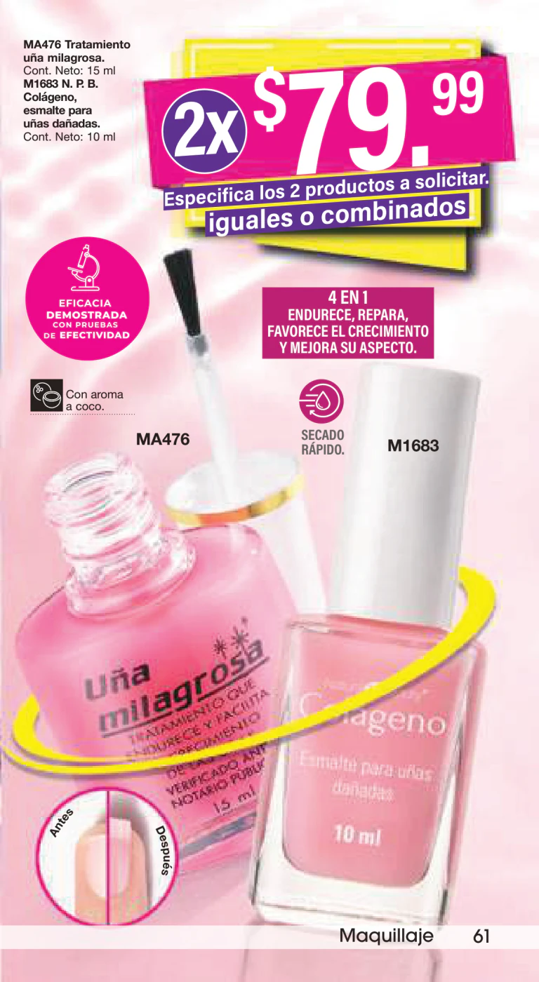 - Esmaltes para uñas: diversos colores, diversas funciones, diversos tipos: uñas quebradizas, uñas con mucho brillo/divertidas, etc. (Págs. 2, 3, 4, 5, 16, 17, 36, 37, 38.)