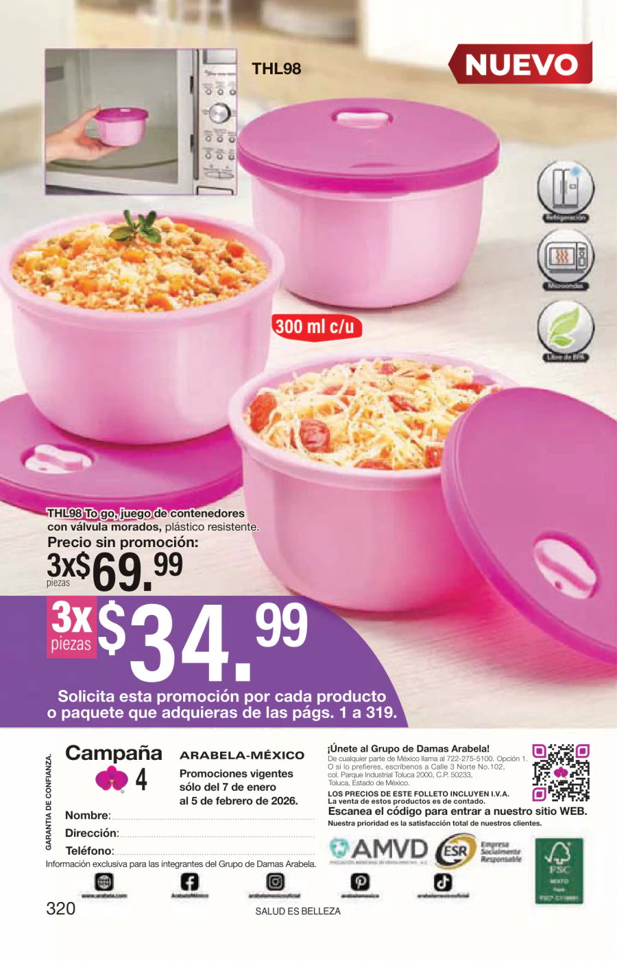 “EN FAMILIA” es otro lema de ARABELA en su nueva campaña y es uno de sus favoritos. Arabela campaña 4 2026, en esta oportunidad, ofrece productos que buscan crear momentos únicos en familia; con sus increíbles opciones en sus artículos para cualquier momento: desde las páginas 40 a 66; Arabela prioriza el tiempo en familia al generar productos destinados a la buena organización, a la comodidad y al ahorro de dinero (¡Pues, sus precios están fijados desde los tan sólo $29,99!) Para todos/as en la familia, también podrás encontrar todo tipo de indumentaria y accesorios para mejorar tu aspecto físico (masajeadores, pesas, cuerda para saltar, geles hidratantes, parches desintoxicantes, fajas ajustables, suplementos alimenticios/dietarios, infusiones, etc.)