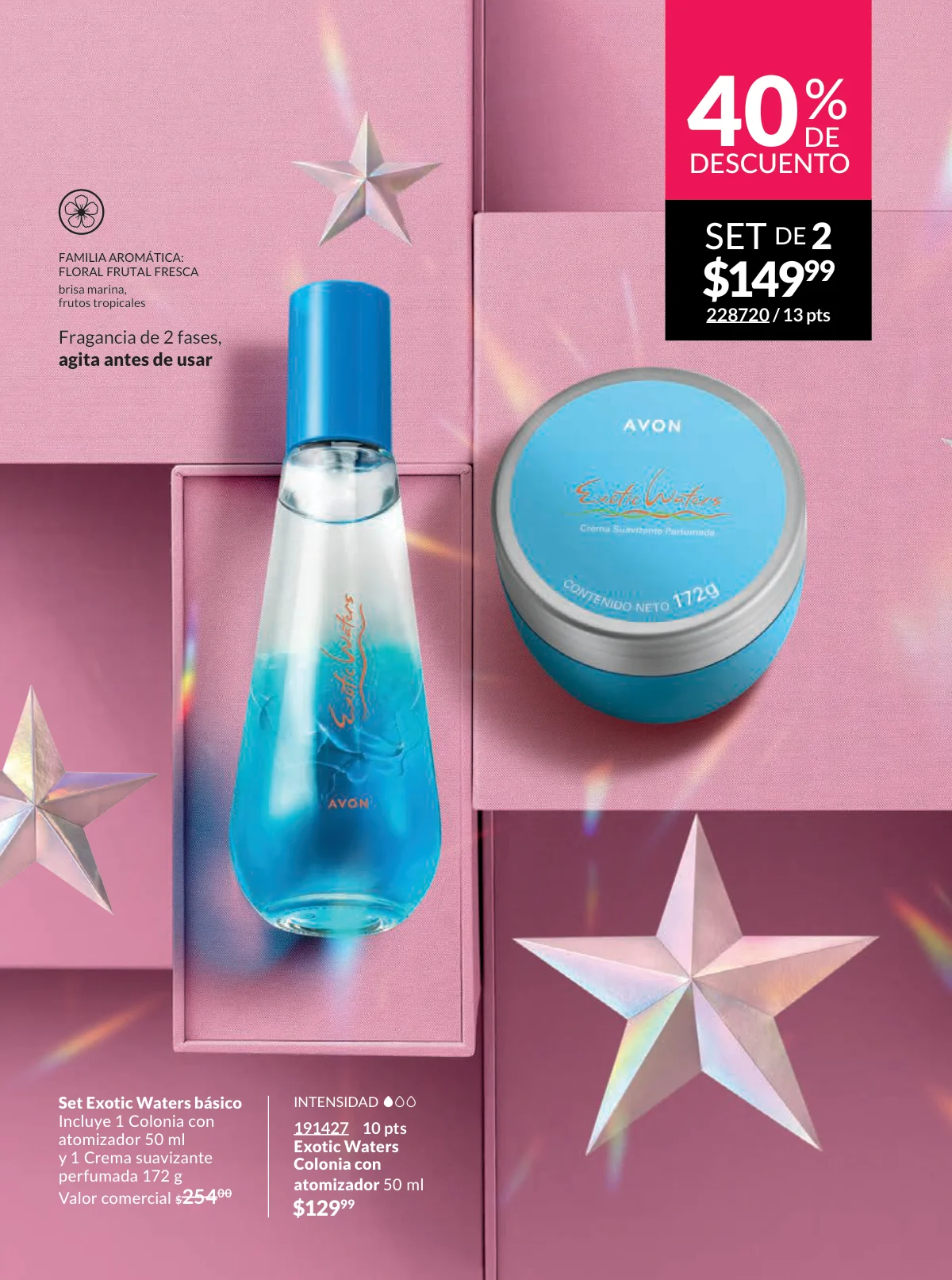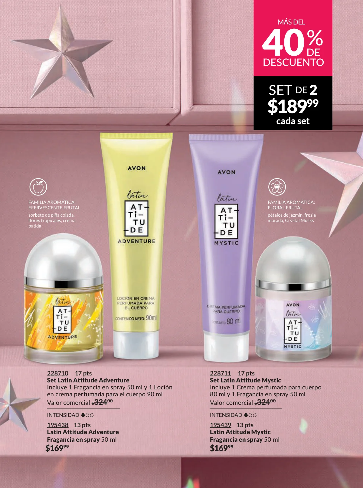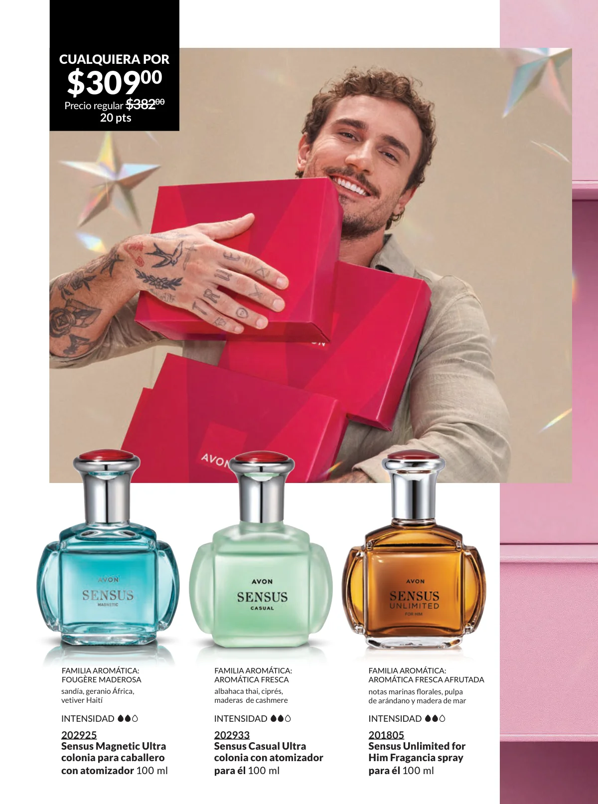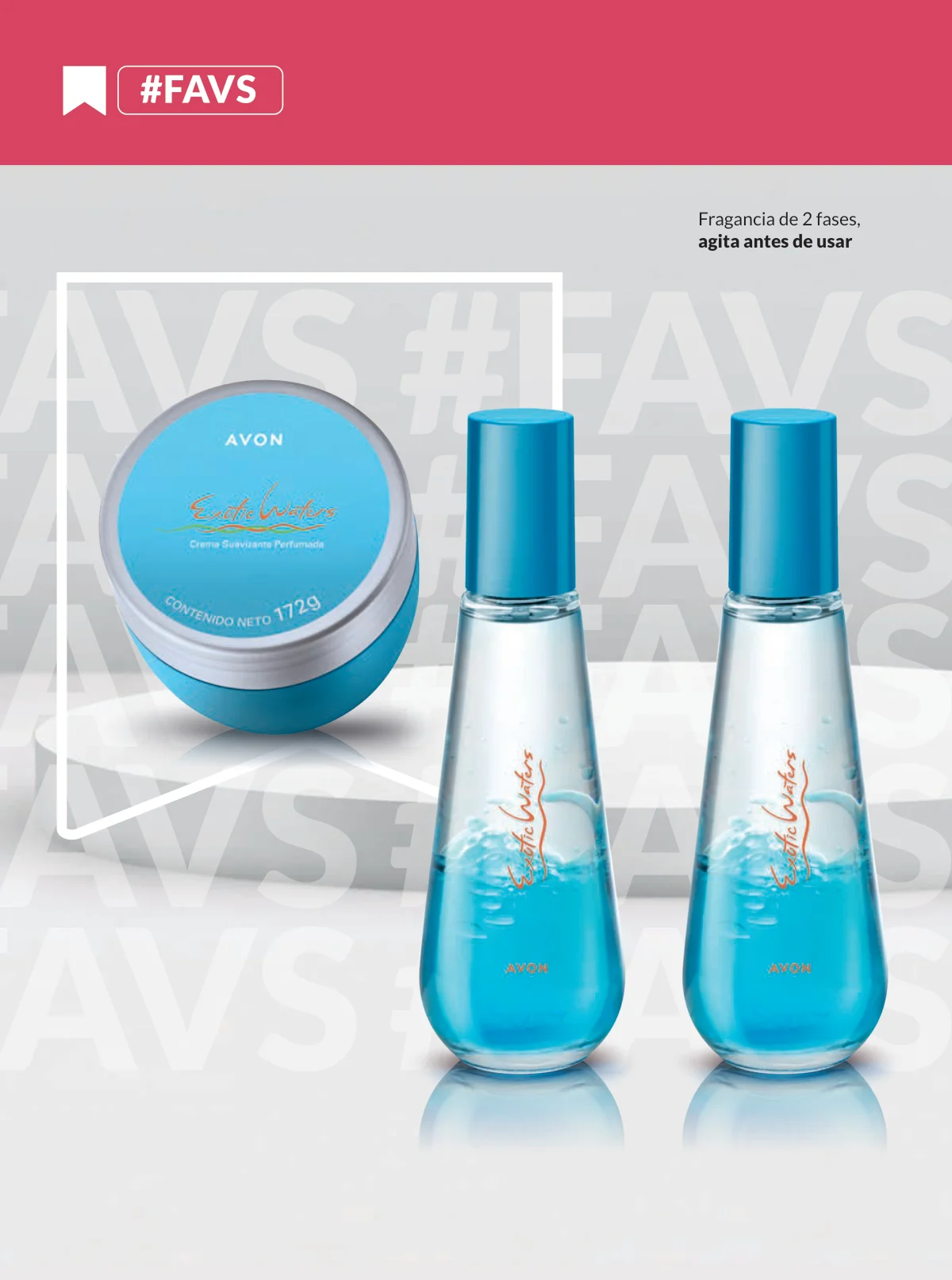 Algo imperdible en este catálogo Avon campaña 17 2025 México es las promociones de sets de 3 productos. No puedes dejar de incluir en tu pedido alguna de las maravillosas muestras de colonias, sprays, cremas perfumadas o labiales de las mejores marcas de la casa: Sweet Honesty, Exotics Waters o Courage para ellos.