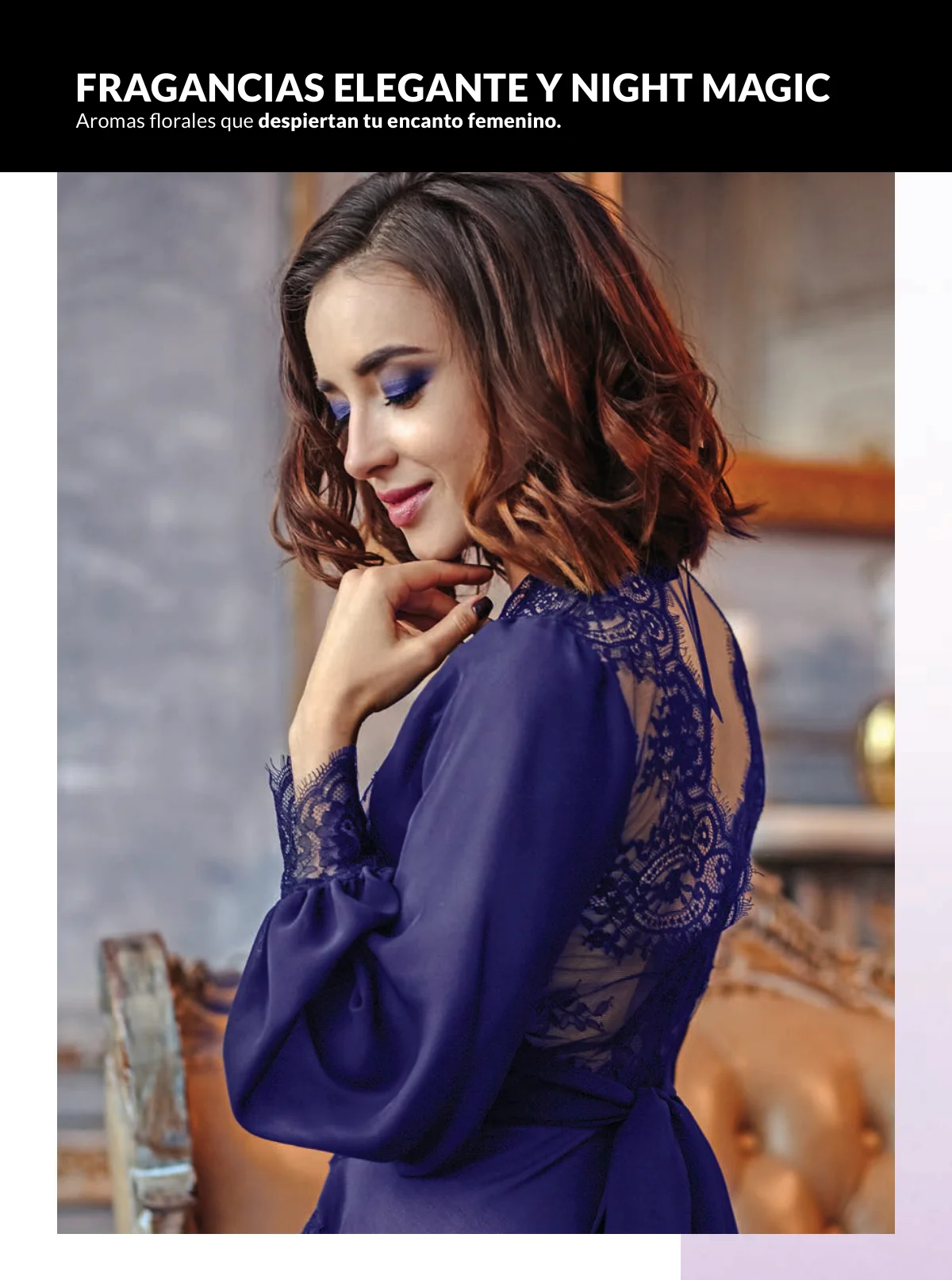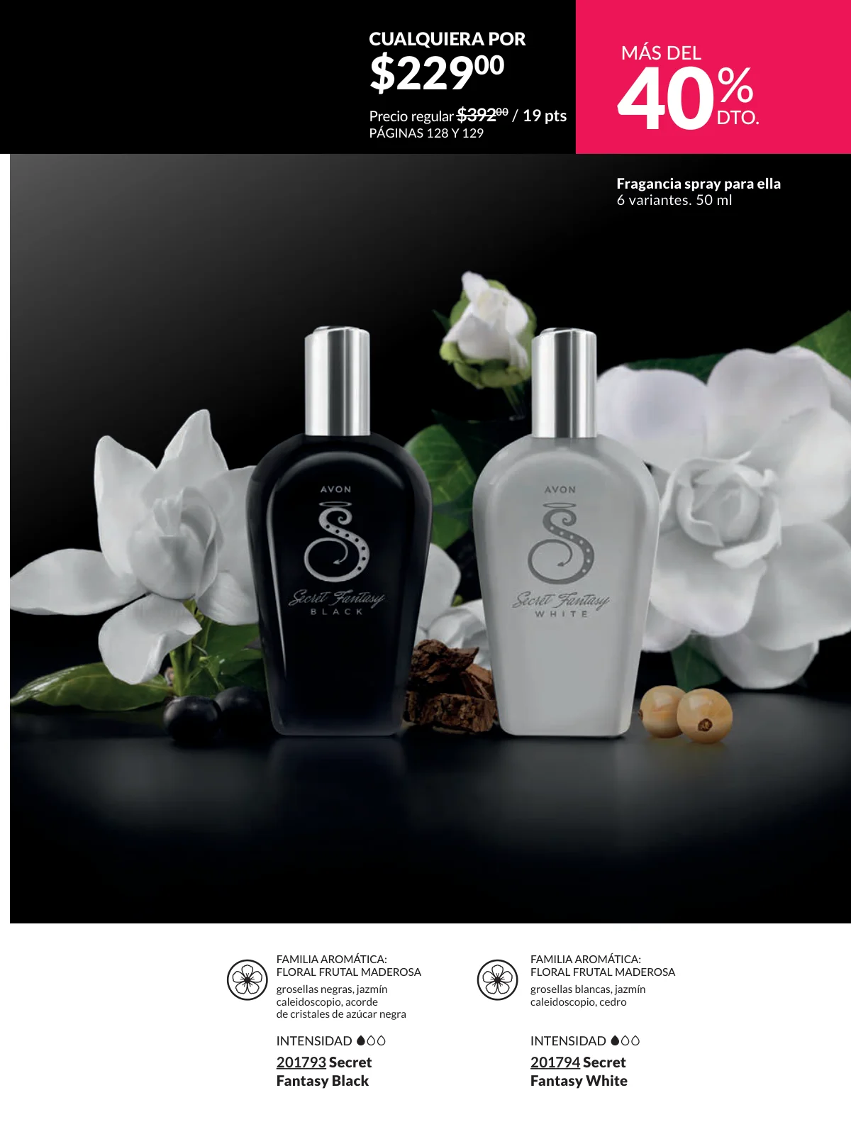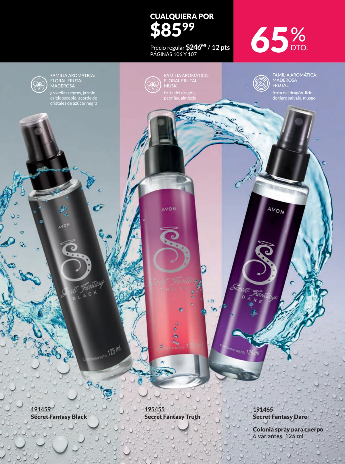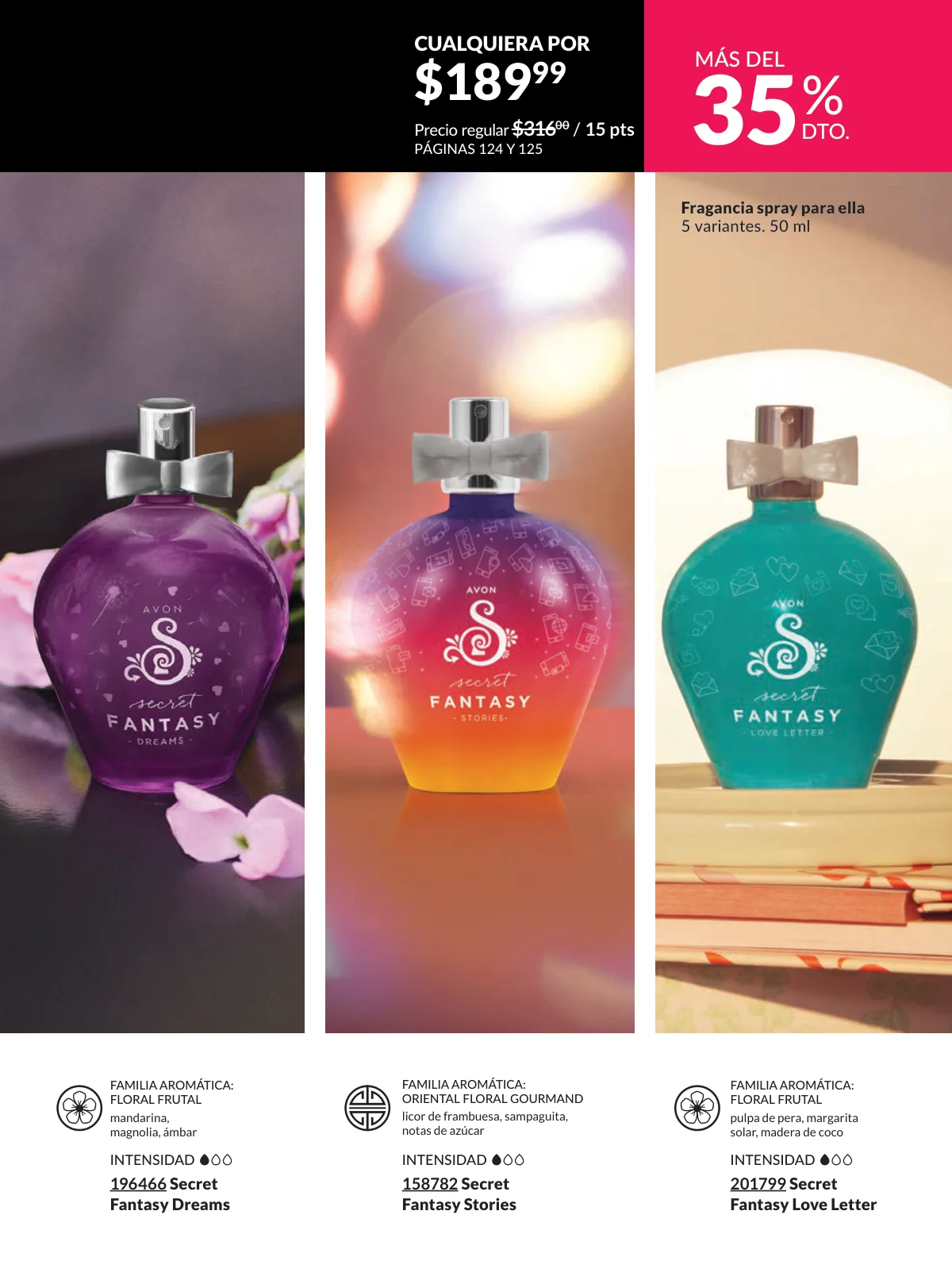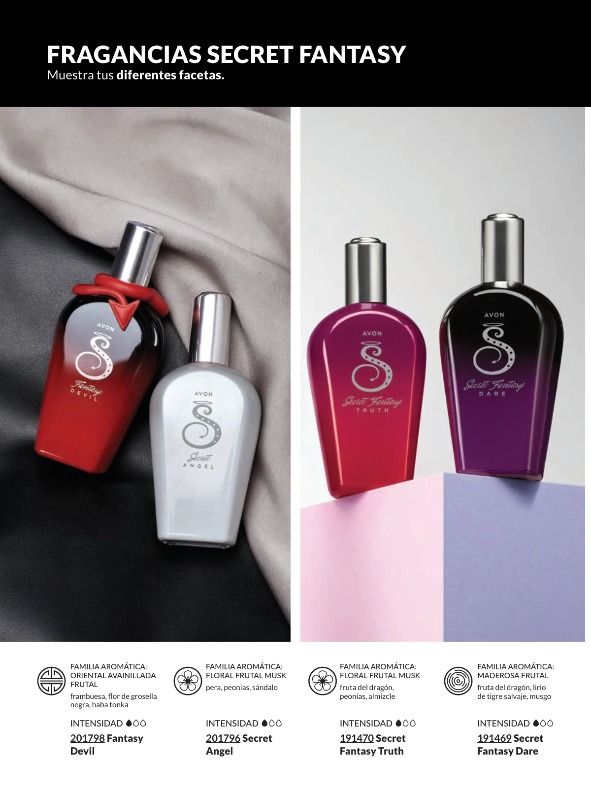 La nueva presentación de fragancias Secret Fantasy es lo que resalta apenas revisamos las primeras páginas del catálogo. Sin duda una presentación que no pasará desapercibida, esto principalmente por la hermosa botella de su perfume. La invitación es a probar todas las deliciosas esencias que esta línea nos regala: Glow, frambuesa-piña, ciruela-jazmín, orquídea-malvavisco y cereza negra y muchas más; una para cada día.