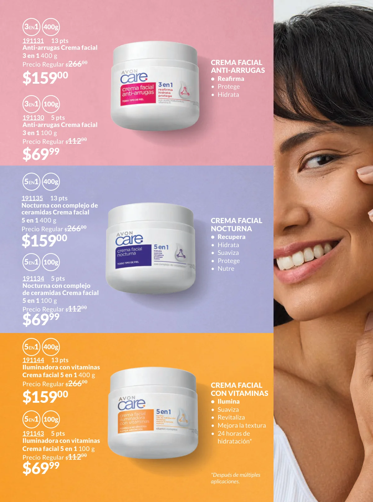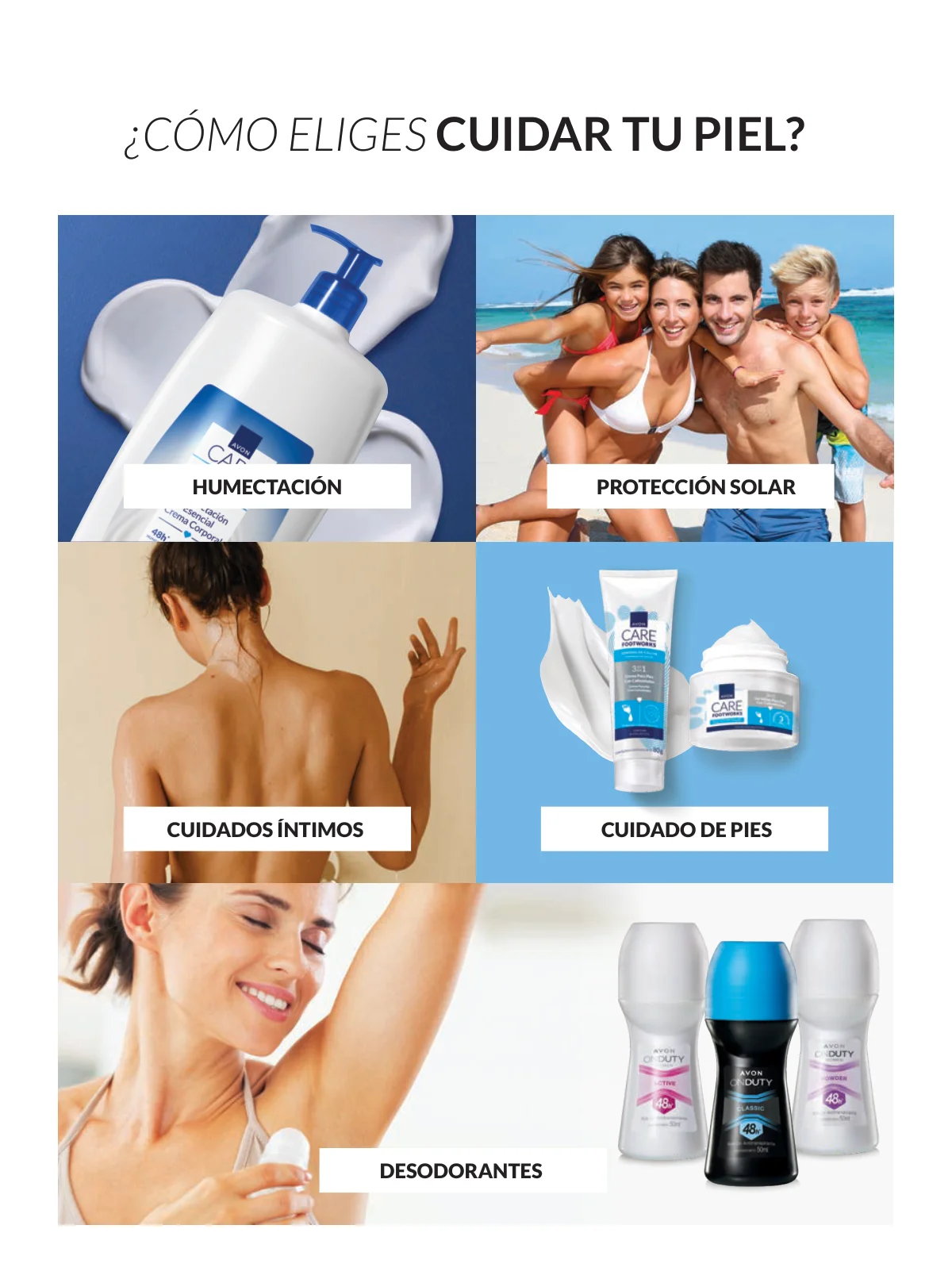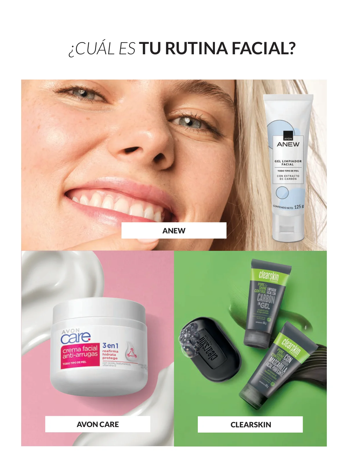 El cuidado de la piel es algo que nos resulta imprescindible. En esta catálogo Avon campaña 3 2026 México te ofrece los mejores tratamientos para el cuidado de la piel del rostro. Cremas hidratantes, reafirmantes o para reducir las líneas de expresión. Queremos que des lo mejor de ti y tu aspecto renovado te ayudará siempre a ello.