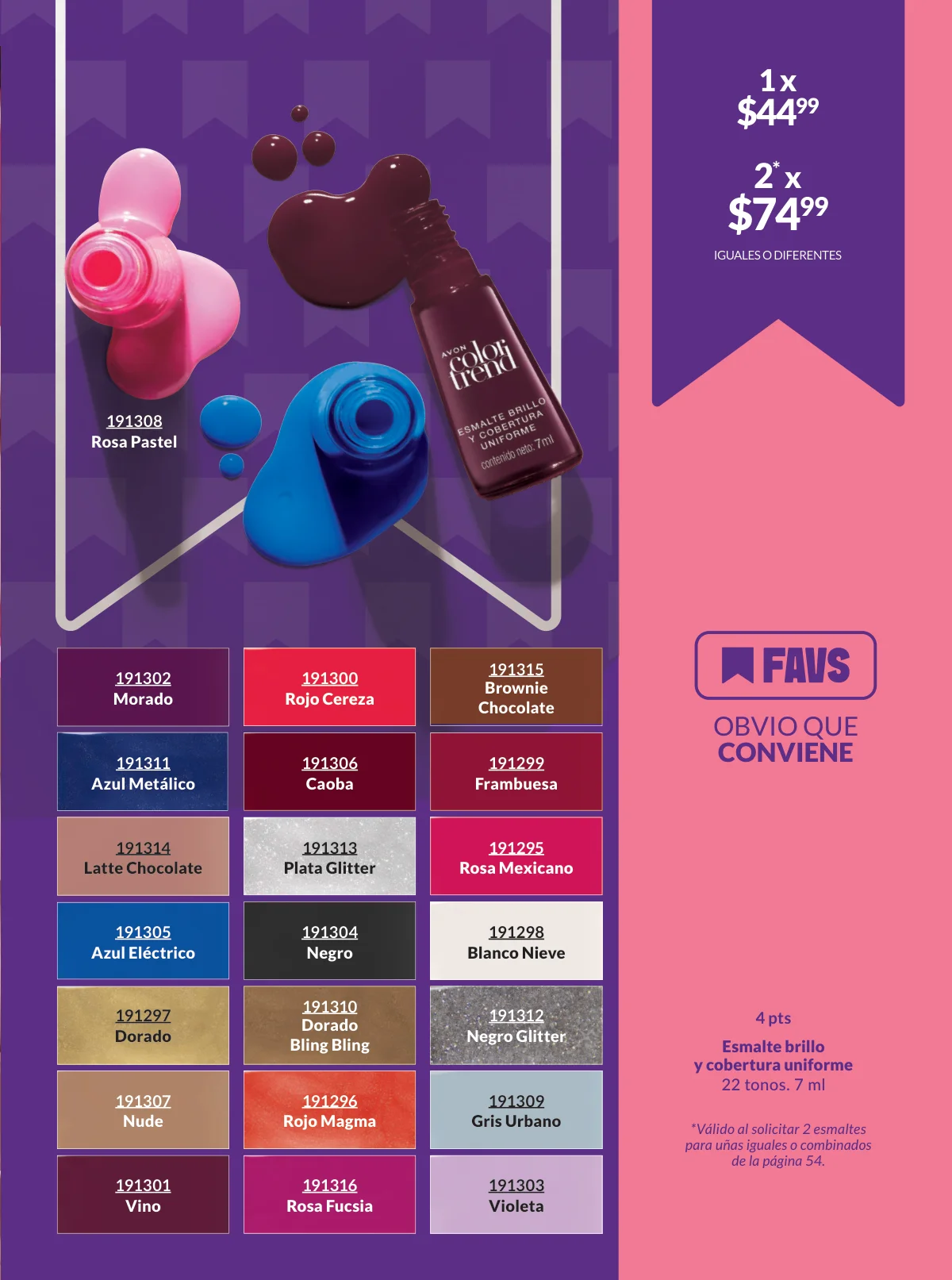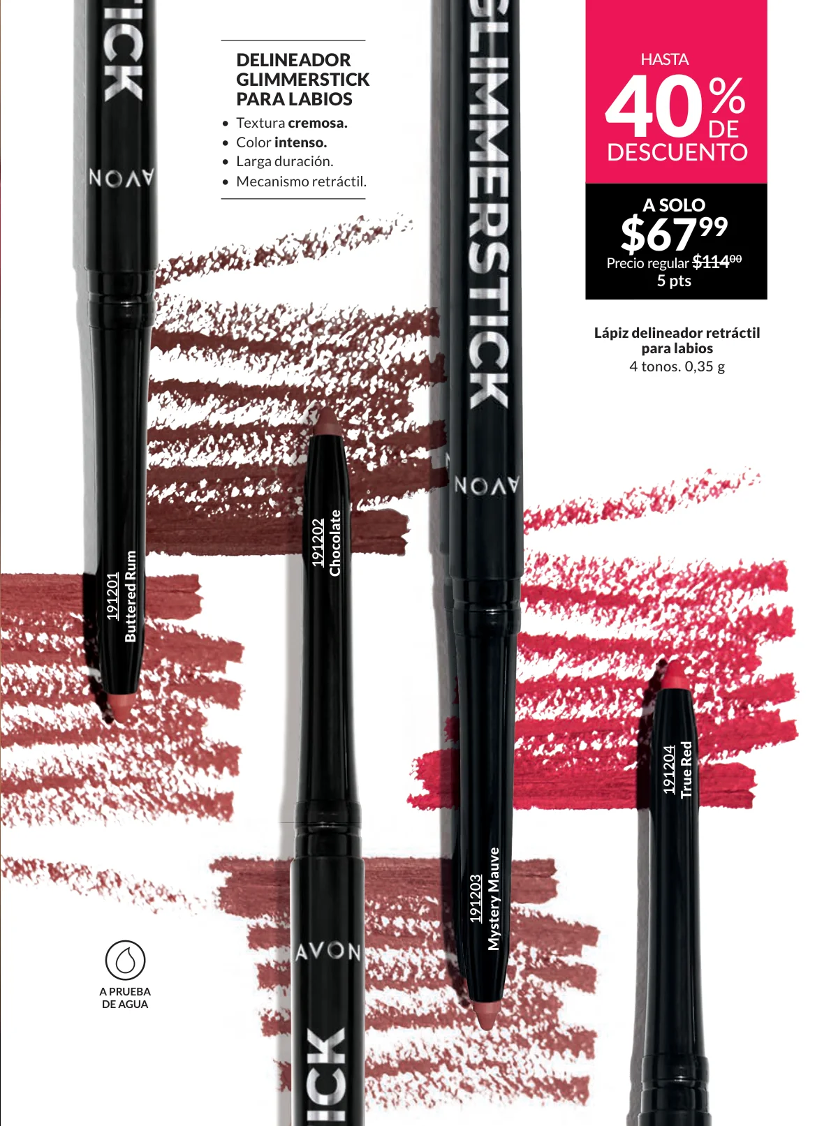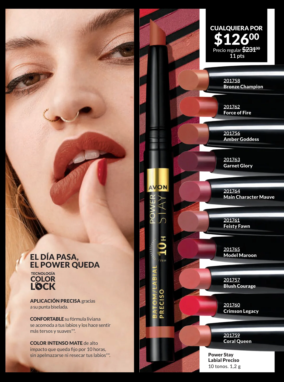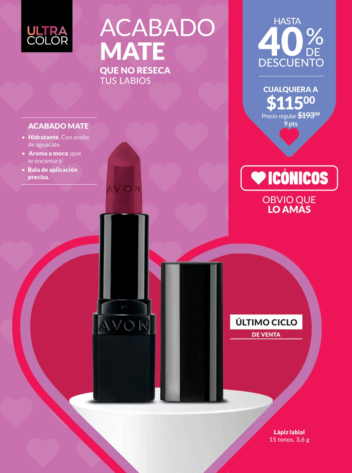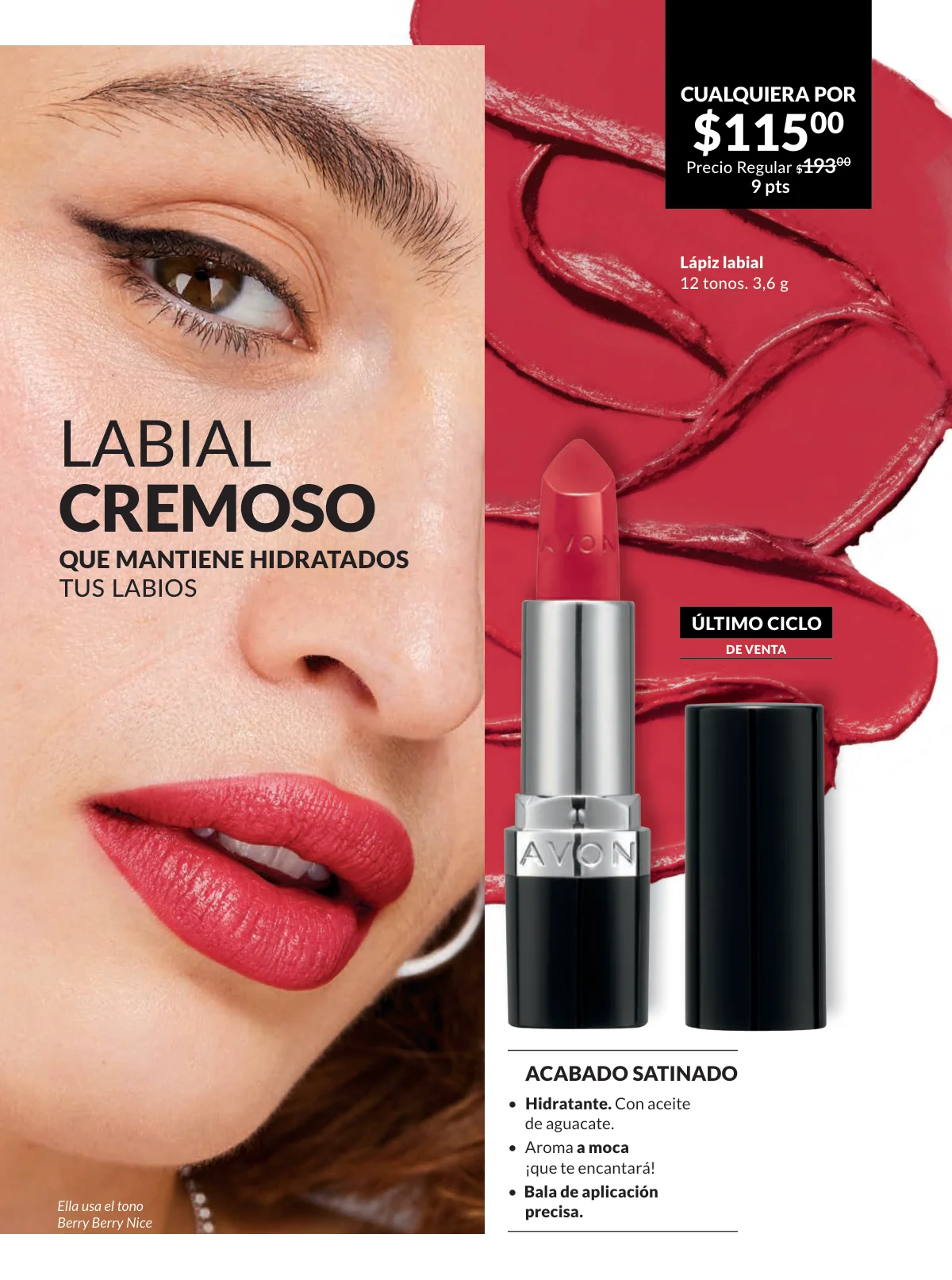 Los labiales son uno de los productos que más encanta a Avon y en este catálogo los mismos resaltan por derecho propio. Labiales en barra con efecto mate, hidratantes o presentaciones líquidas de fácil aplicación.