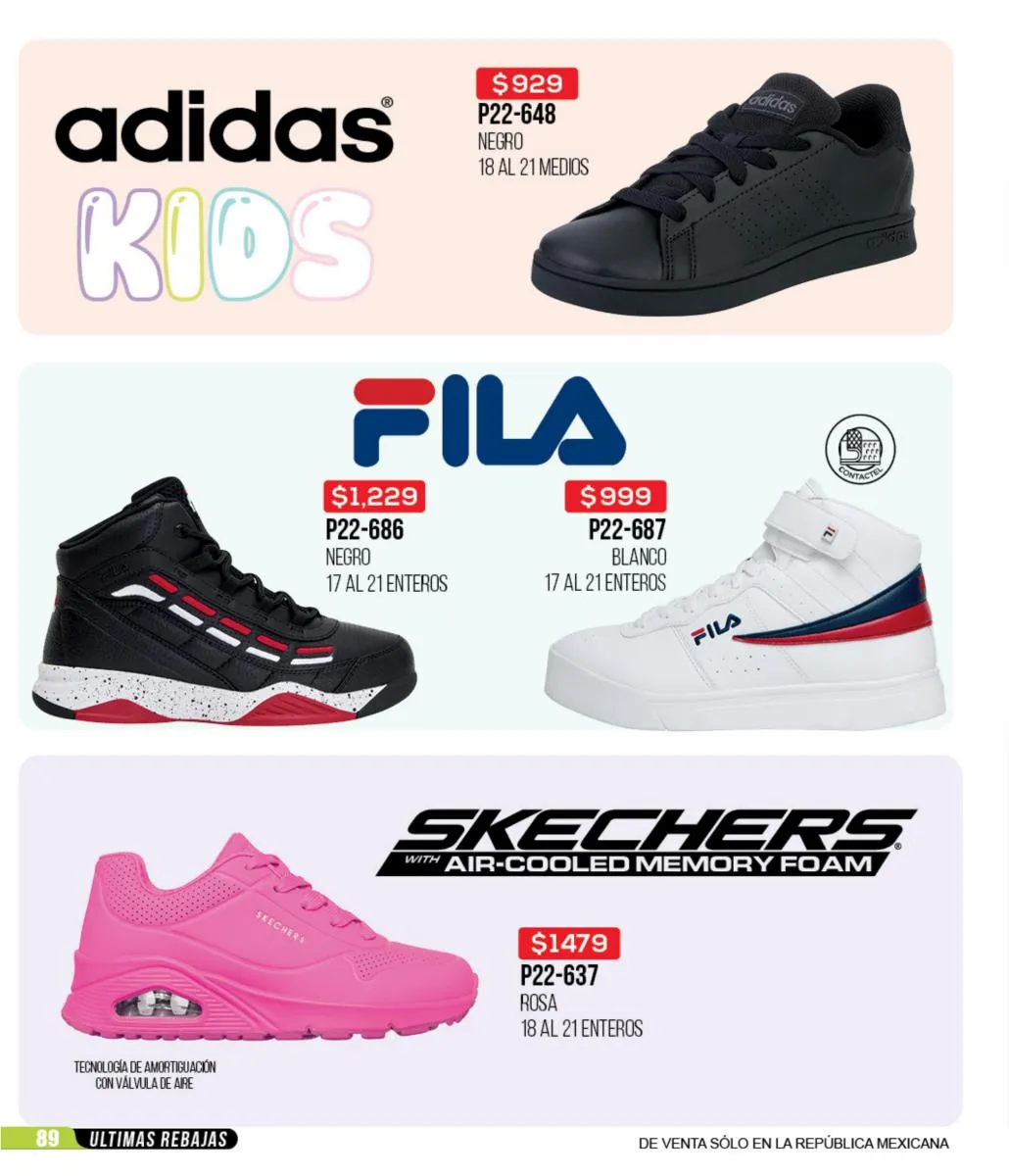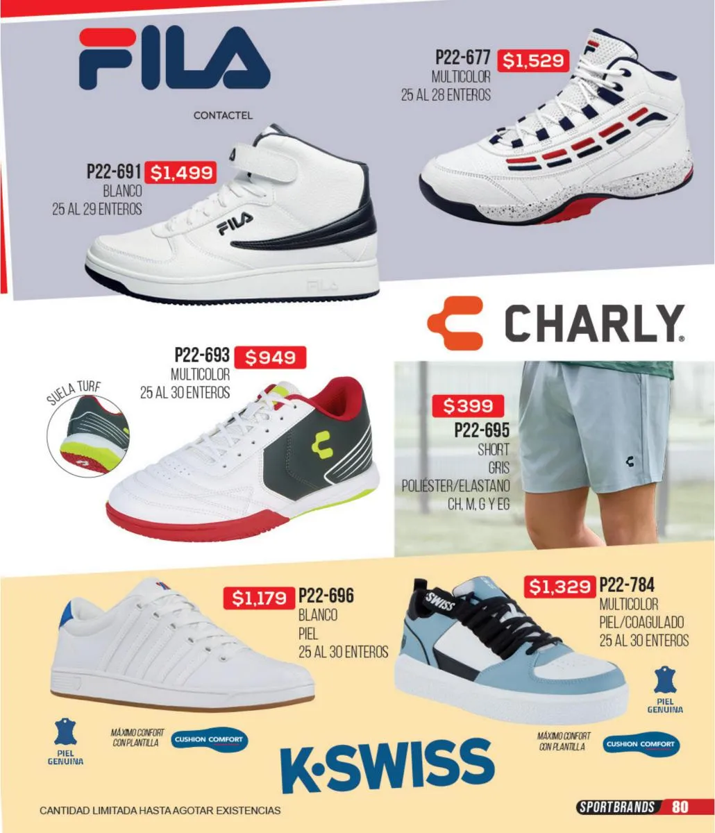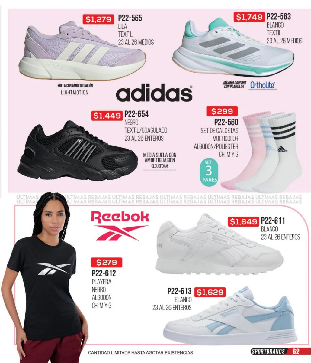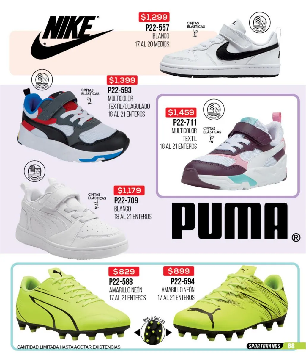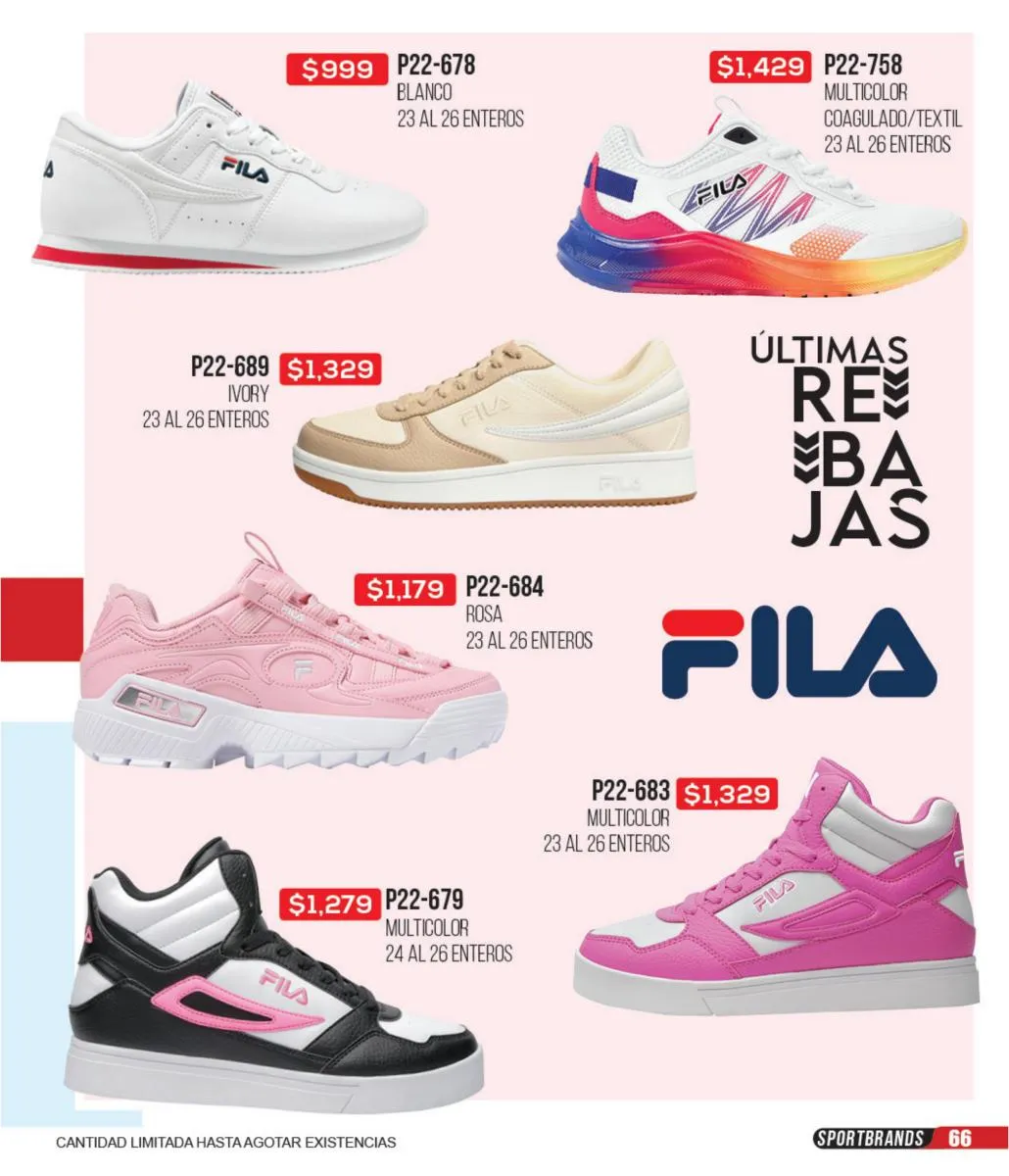 Las zapatillas deportivas de este catálogo ofrecen una variedad increíble para que puedas combinar tus outfits deportivos y sentirte lista para hacer todo el deporte que quieras. Todas tus marcas favoritas: Fila, Nike, Reebok, Puma y más, las consigues en este catálogo. Además, puedes aprovechar estas increíbles ofertas para adquirir todos los accesorios e indumentaria deportiva para estar cómoda y a tono con tu personalidad en cada actividad de tu día.