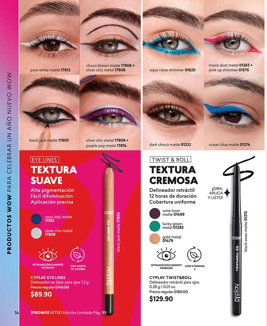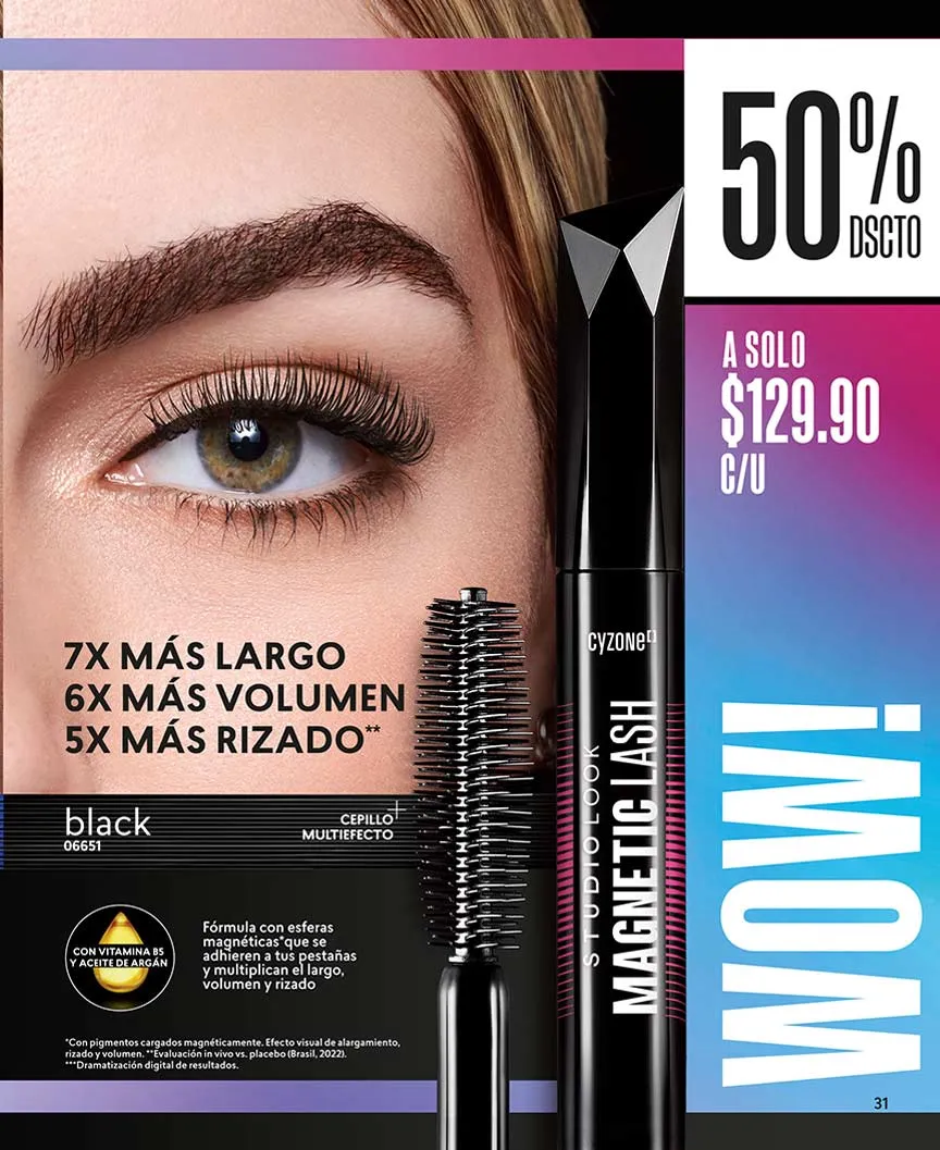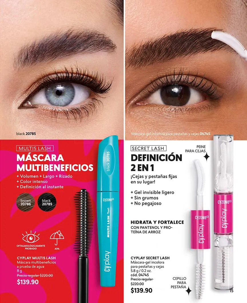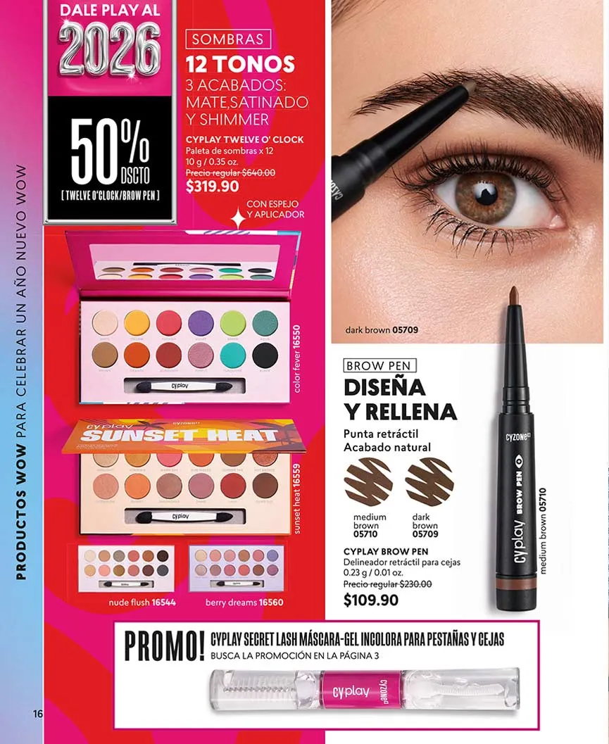 Disfruta del mejor acabado shimmer o metálico en sombras en gel, con colores intensos, con 50% de descuento. “Cy Twist” los delineadores cremosos con los más exclusivos colores, puedes llevarlos a mitad de precio. Para una cejas con apariencia natural, pero bien definidas, tienes la opción del delineado “Cy Brow Pen” combinado con la máscara “Cy Secret Lash” con 50% de descuento.