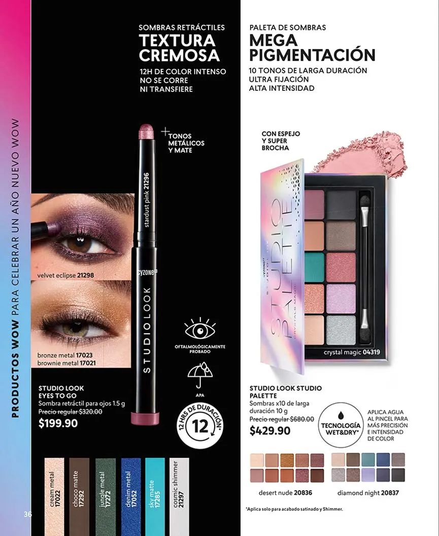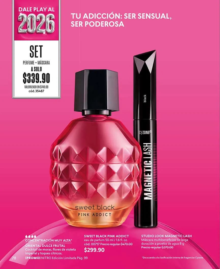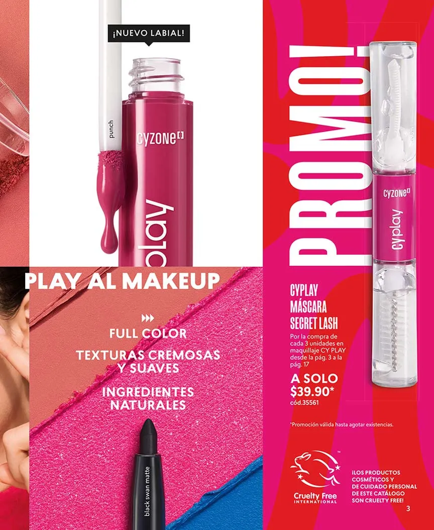 Puedes llevarla en 2 maravillosos sets, escogiendo entre un delineador o una pulsera con dijes. Para afianzar tu fuerza, sensualidad y tu glam, lleva a mitad de precio “Sweet Chic”. Si de maquillaje se habla, catálogo Cyzone campaña 1 México 2026 es un precursor y te trae los colores más variados al mejor precio.