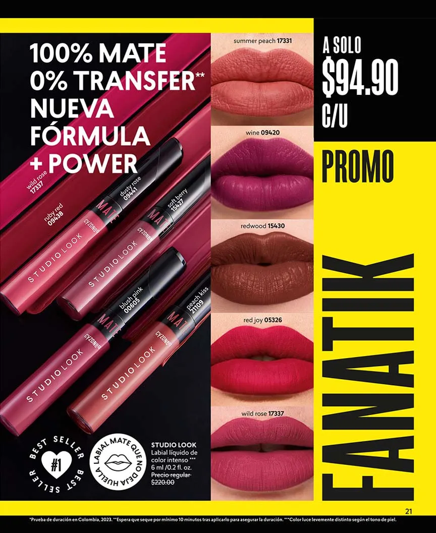 Combina los acabados mates y satinados en tus labios, con la paleta “Cy Lips Palette” y llévate gratis el pincel para labios. Y si eliges un dúo de labiales “Studio Look”, llévate gratis una máscara “Studio Look” o un delineador “Lip Define”. Arma tu propia paleta de sombras con “Studio Look” y aprovecha a escoger los repuestos que desees, porque todo lo llevas con 50% de descuento.