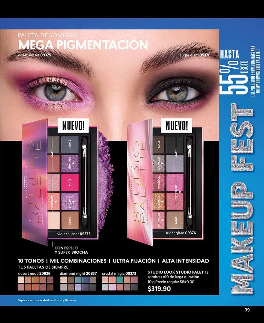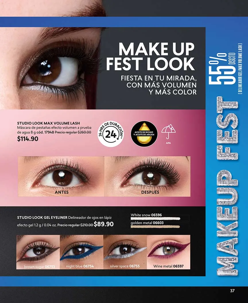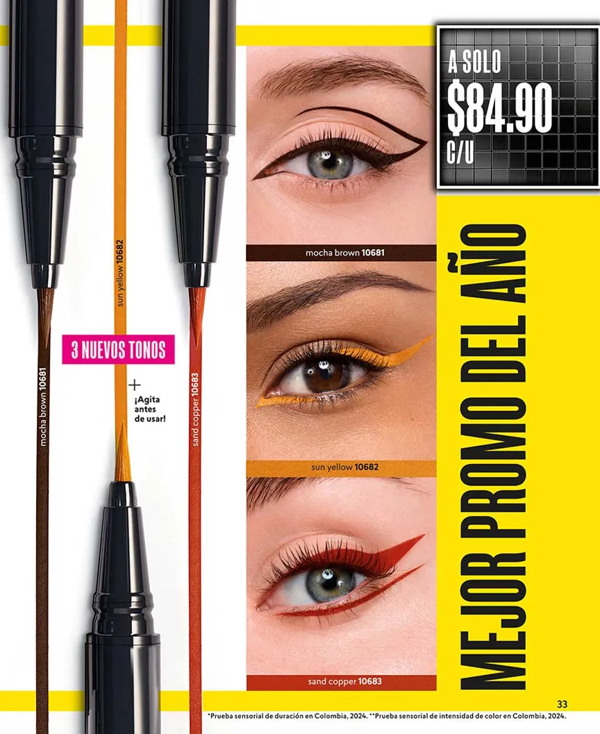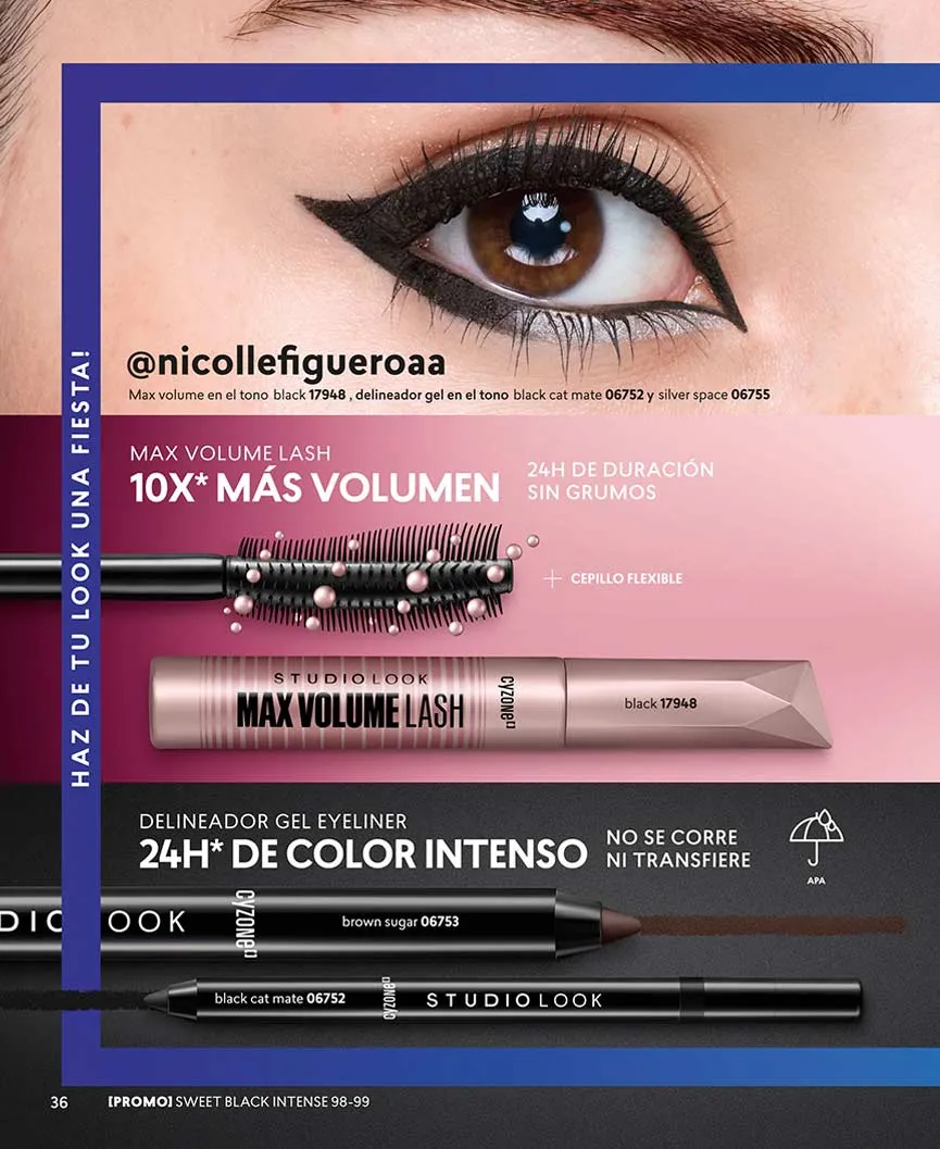 La máscara 3X que te brinda más volumen y sin grumos, puedes llevarlo a mitad de precio. También puedes elegir tu set compuesto por el “Delineador Plumón Black” en dúo con el labial, máscara o paleta que escojas. El Set “Mirada” te ofrece el delineador con efecto gel + plumón de cejas, en una oferta especial.