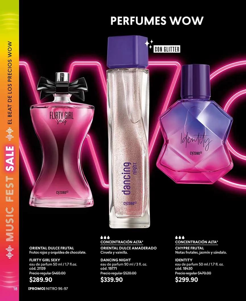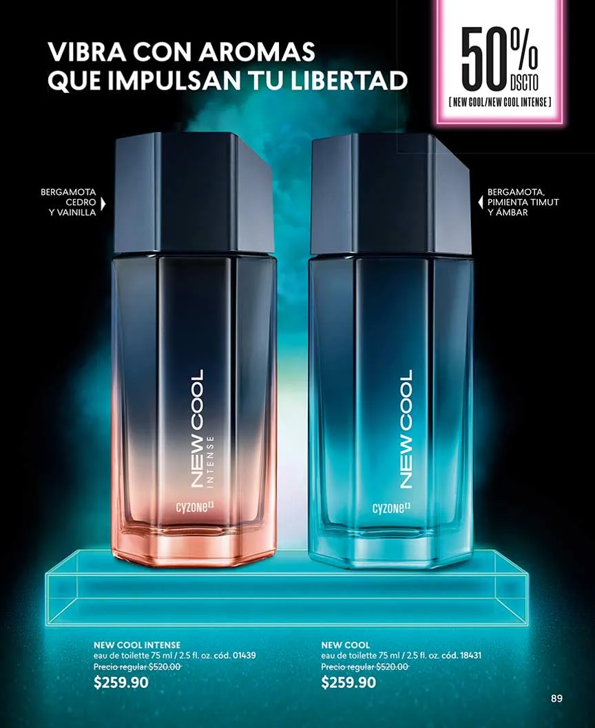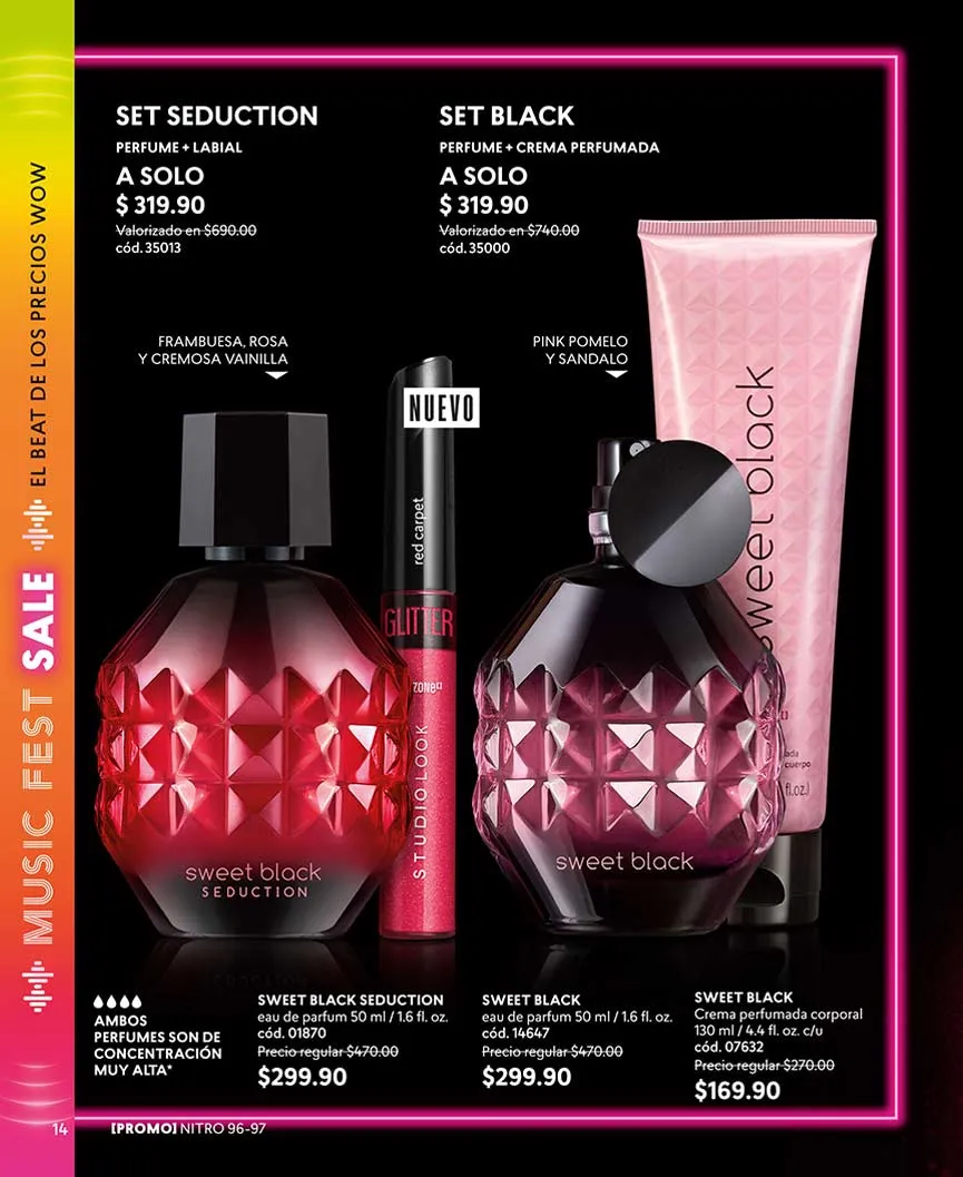 ¿Y las fragancias? Aquí te las presentamos. «Dancing Sunset» con su aroma dulce oriental, lo encuentras con 50% de descuento. En set, llévate el «Sweet Black 1» o «Sweet Black 2». Puedes escoger entre delineador o loción perfumada.