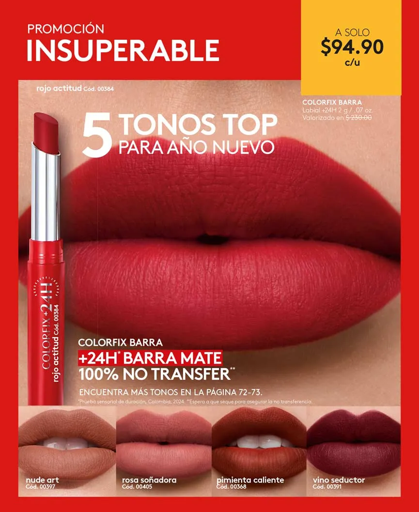 “Its You” la fragancia unisex de tu preferencia, llévalo con 50% de descuento, y si llevas cualquiera de las opciones de la misma fragancia, te llevas una original gratis. Para lucir tu rostro hermoso, utiliza la base “Colorfix” con 24H de duración, no transfiere y a prueba de agua, a mitad de precio. Súmale las sombras “Colorfix” o el plumón “Colorfix” Tattoo bajo la misma promoción.