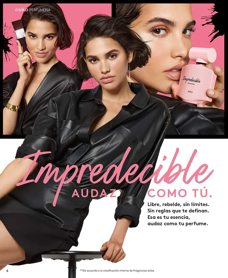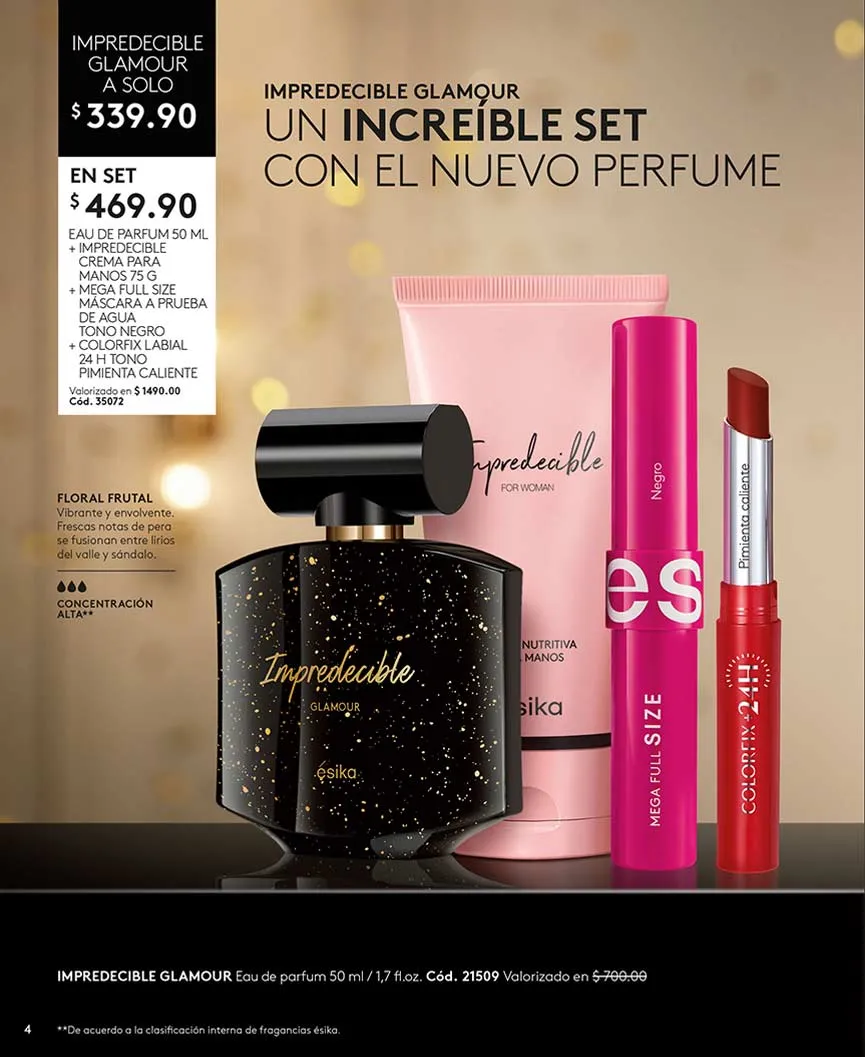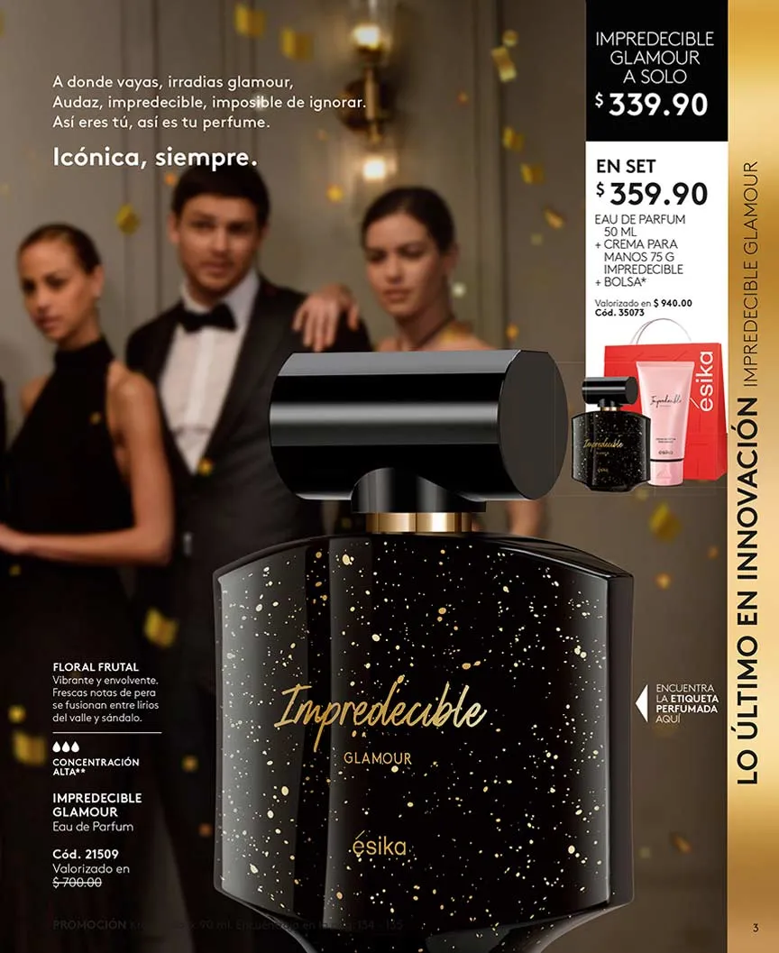 “Impredecible” es la fragancia que catálogo Ésika campaña 1 2026 México te presenta en promoción con 3 opciones para escoger, acompáñalo con la fragancia perfumada, máscara + labial o con el bello Bolso “Gina” a un precio promocional.