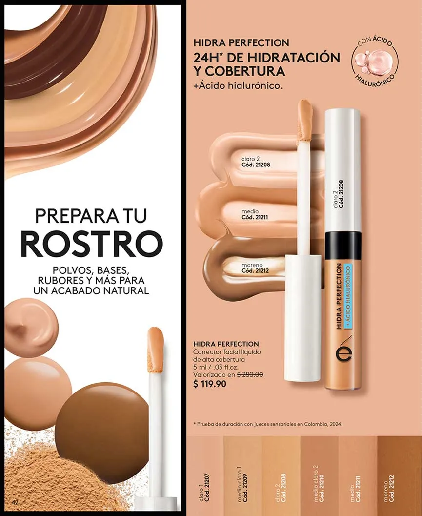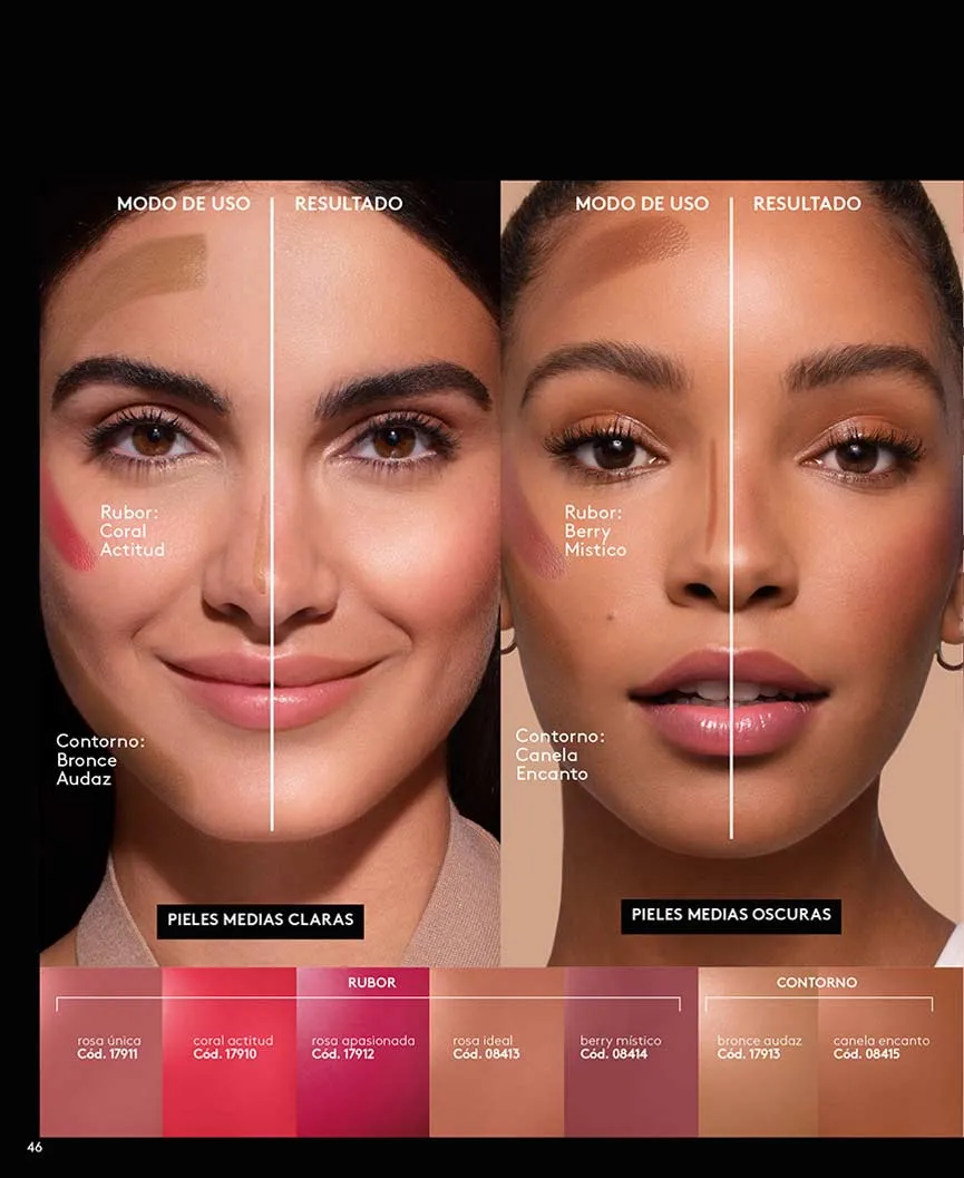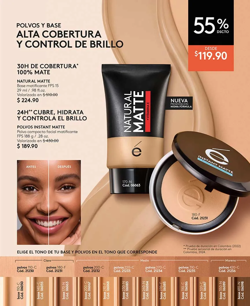 Perfila tus cejas con el estuche 4 en 1, con sombras, iluminador, cera fijadora y delineador a mitad de precio. Bríndale a tu rostro un acabado mate y más duradero, con la base “Natural Matte” y la esponja, con 50% de descuento; y compleméntalo con el corrector “Hidra Perfection”. Como sabemos que te encanta el acabado bronceado, tenemos a mitad de precio las “Perlas Bronze”, acompáñalo con la brocha y luce como deseas.