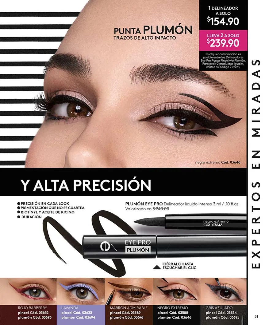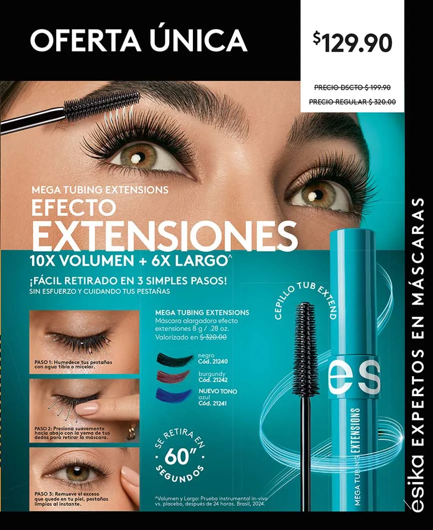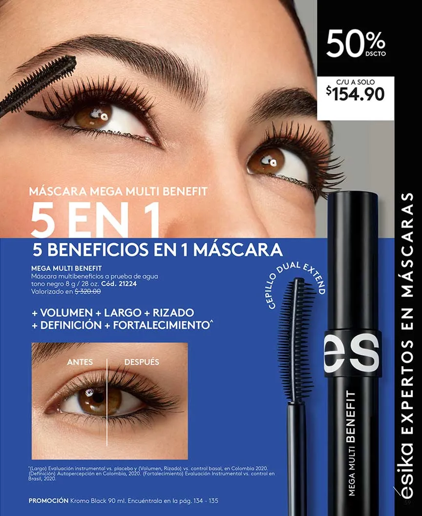 Dale a tus pestañas un efecto 4D, con la máscara “Mega Multi Benefit” y el cepillo “Dual Extend” a mitad de precio. En promoción insuperable, el “Pincel Eye Pro” que cuenta con una punta de pincel, a un precio único. Para un efecto mate en tus labios, no puedes perderte la Oferta Estrella, con un 50% de descuento del “Hidrocolor Mate” o también el labial “Color HD Velvet”.