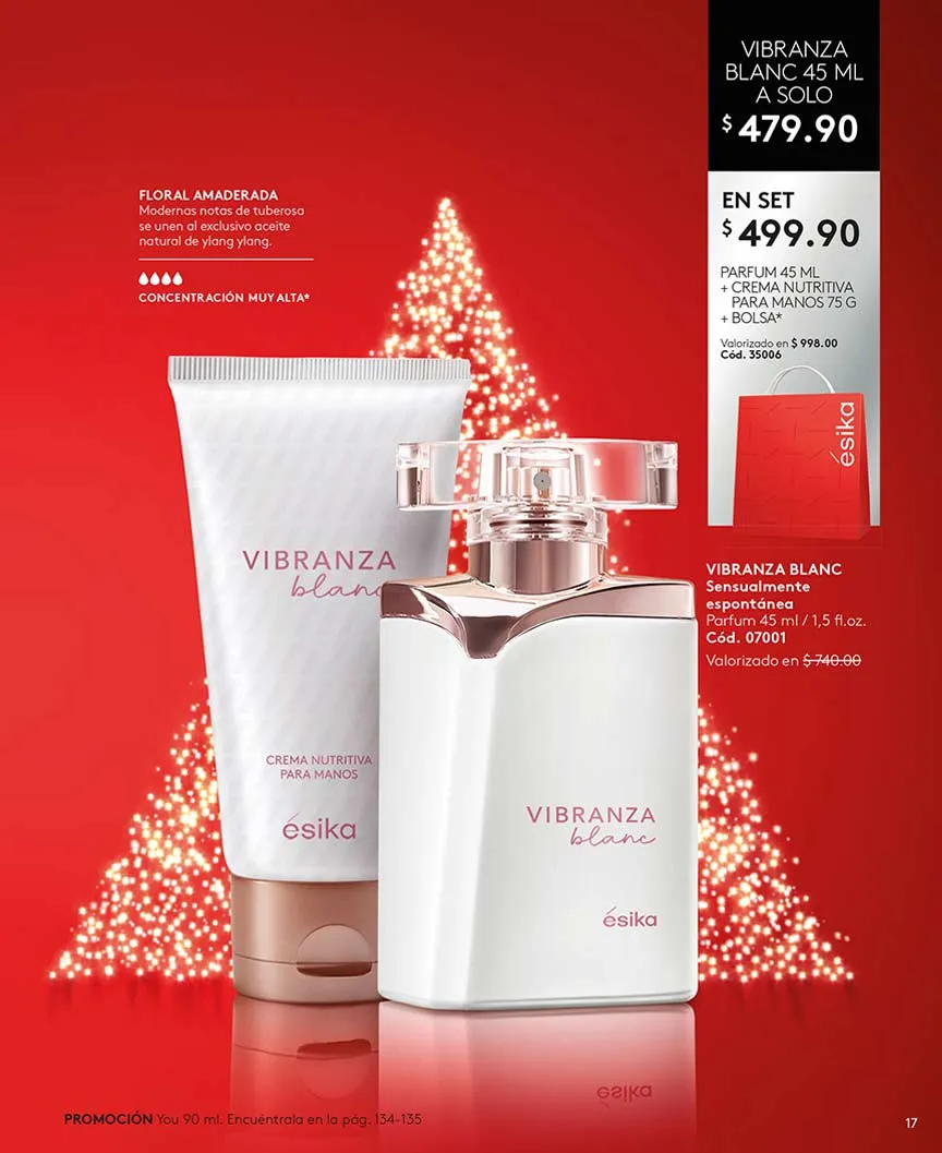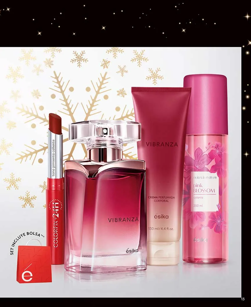 Los sets de Vibranza son una excelente forma de empezar la sesión de obsequios. A un excelente precio puedes llevar la loción corporal y las dos fragancias de 45 ml y 7m5 ml. Todo en una hermosa bolsa de regalo. Como una alternativa tienes Vibranza Blanc que puede llevar con una cartera Eva muy práctica y hermosa.