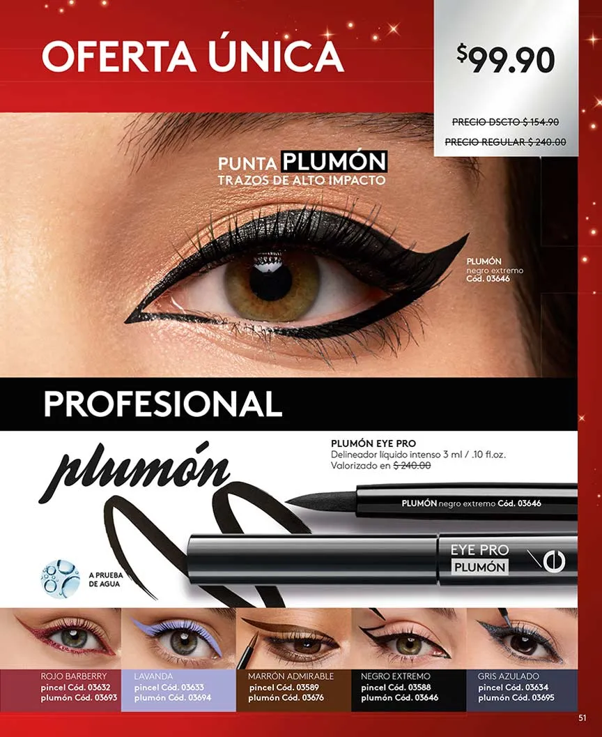 Para seguir con las miradas de impacto, los delineadores Eye Pro vienen en colores impactantes y muy llamativos. Y los colorfix de plumón tattoo son de aplicación rápida, pero de larga duración, hasta 24 horas.