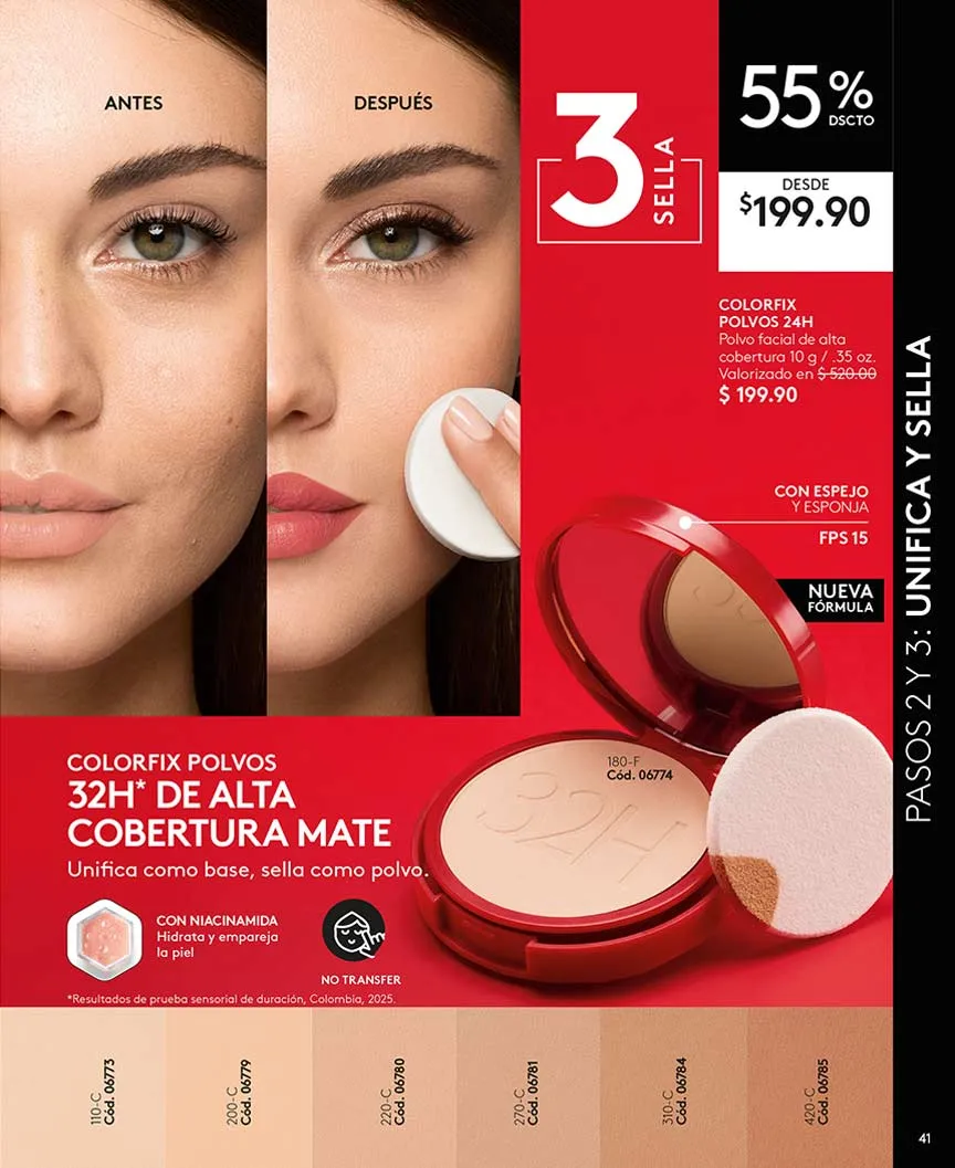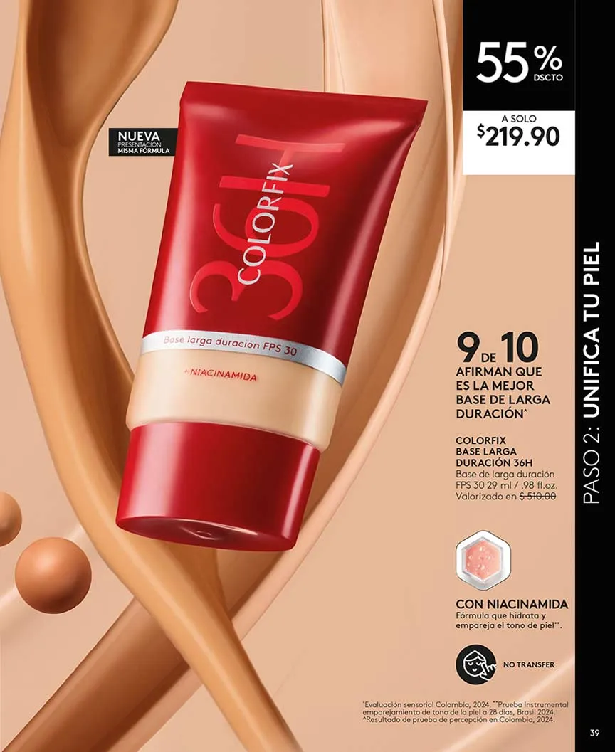 Tu rostro merece lucir siempre perfecto, y con la base «Color Fix» tienes cobertura 24 horas, no transfiere y es a prueba de agua. Tonos claros, medio claro, medio y moreno disponible.