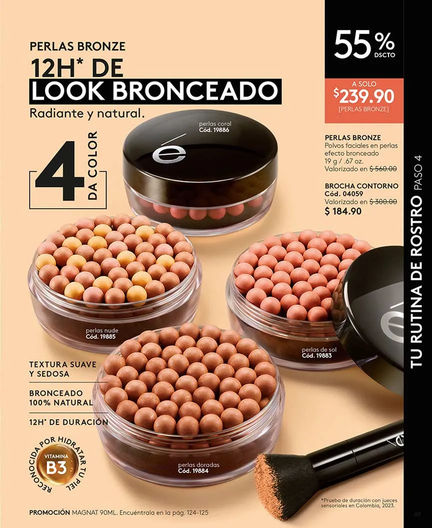 ¿Quieres un efecto de bronceado?, las “Perlas Bronze” le dan el acabado dorado a tu piel como recién llegada de la playa, acompáñalas con la brocha para rostro, todo con 50% de descuento.