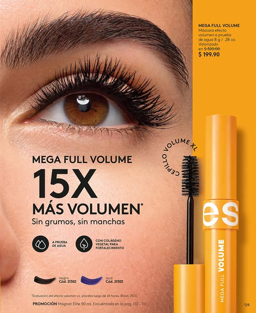 Aprovecha la promoción insuperable llevando la máscara «Mega Full», que aumenta hasta un 60% tus pestañas, delineadores y lápices en todas las tonalidades, con 50% de descuento.