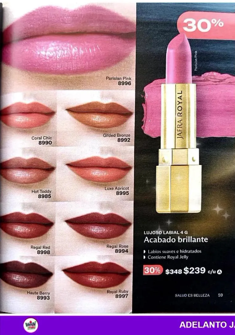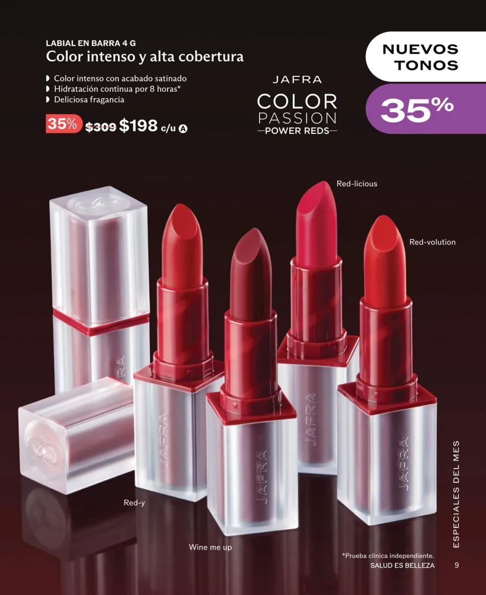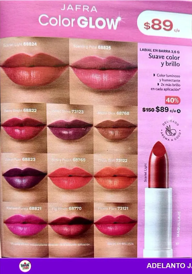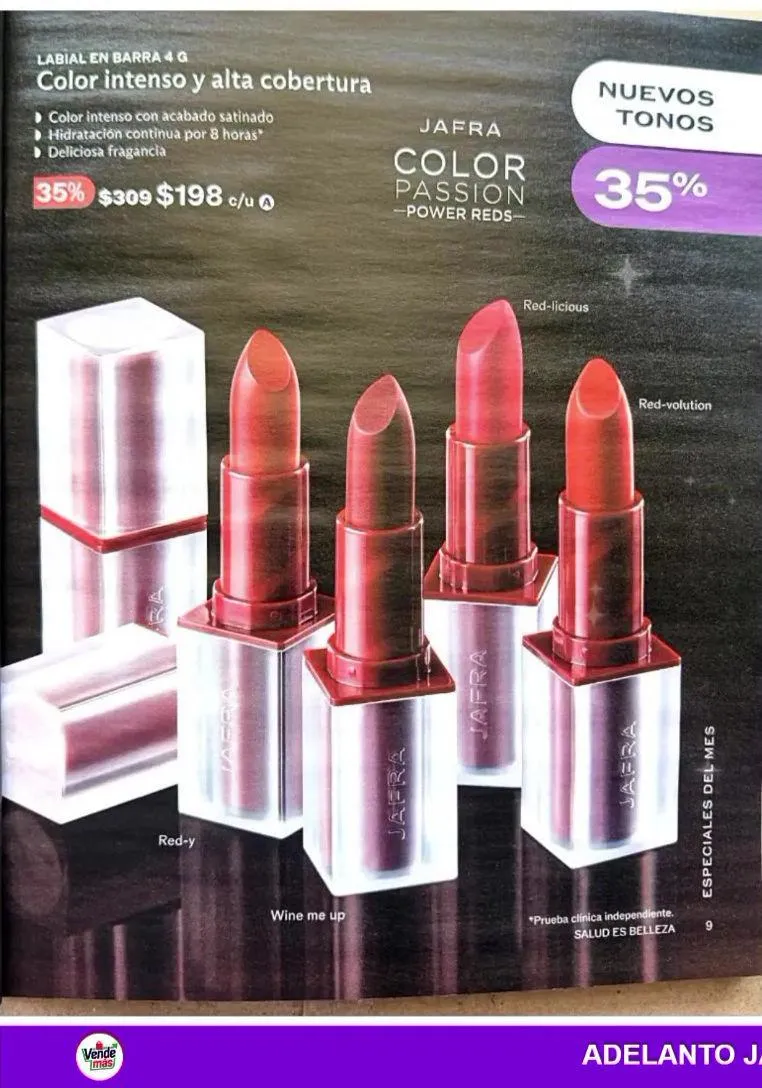 Los labiales son otro de los infaltables en nuestras cosmetiqueras y por ello con el descuento entre 20% y 35% no te resistirás a llevar varios para distintas ocasiones. También los rubores y delineadores entran en esta lluvia de descuentos y todo con la calidad que Jafra siempre te ofrece.