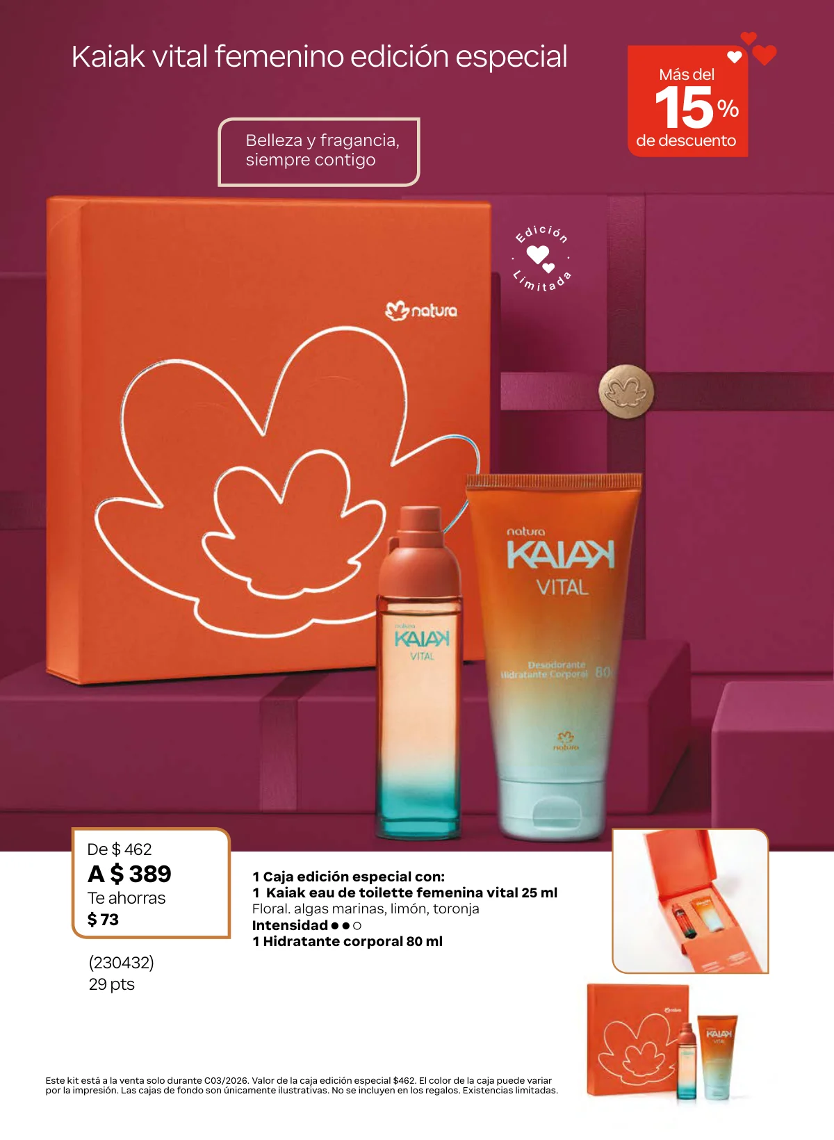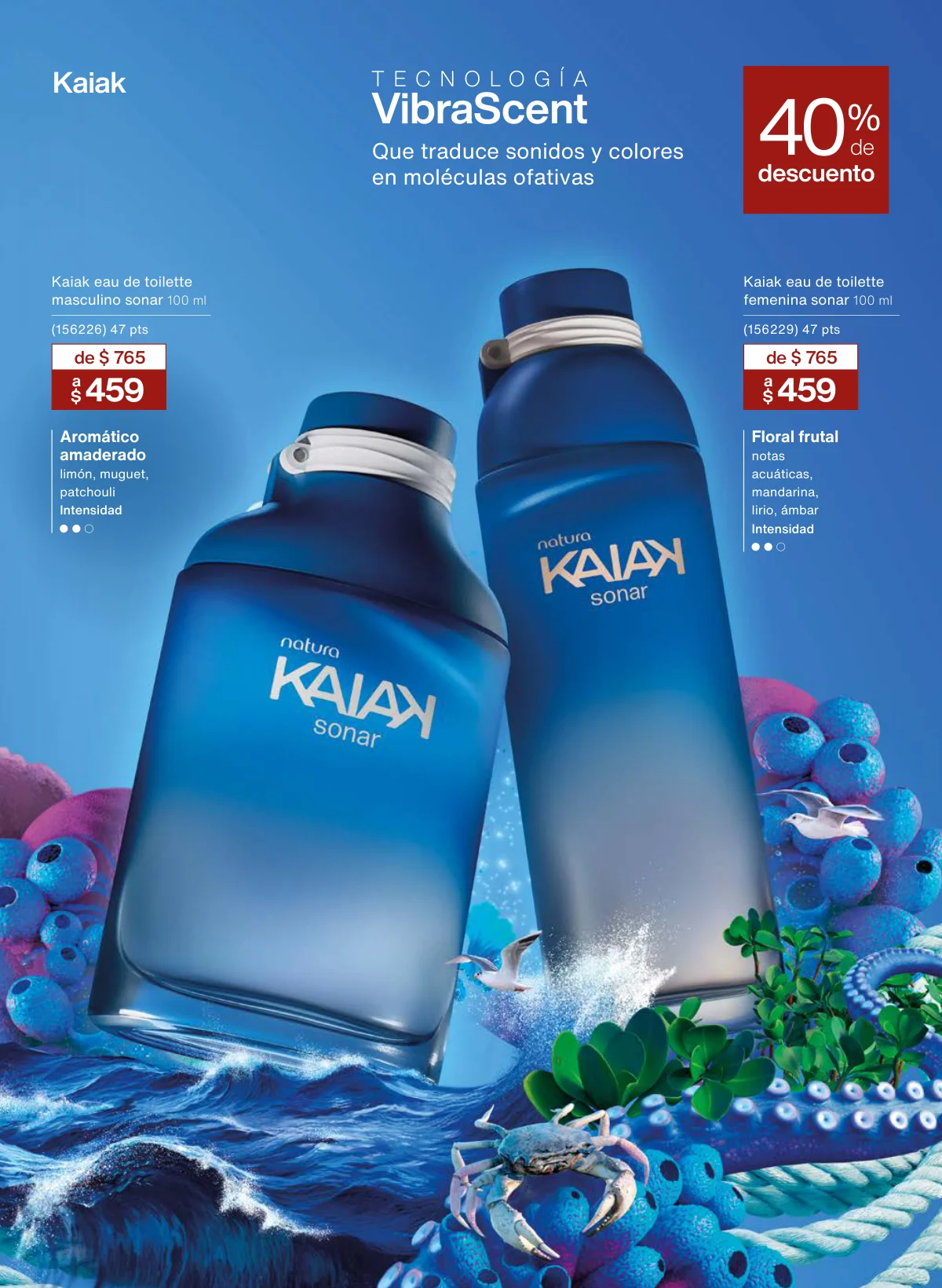 Kaiak también se hace presente y en este catálogo nos ofrece más con el despliegue de maravillosos productos: shampoo, hidratantes corporales o su eau de toilette para ella y él. Todos a un magnífico precio de descuento y con la garantía de un envase más ecológico y un contenido que aporta ese beneficio emocional que tanto buscas.