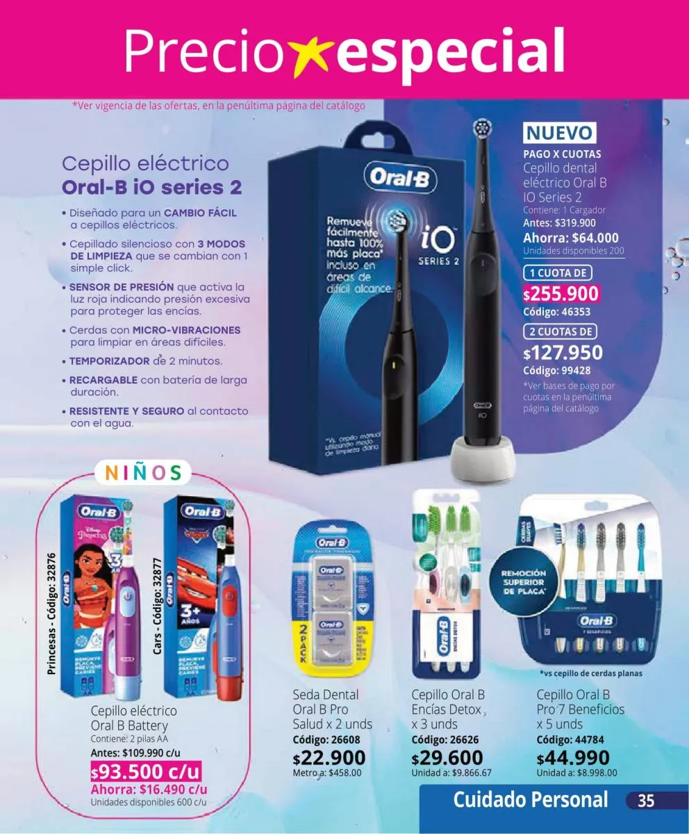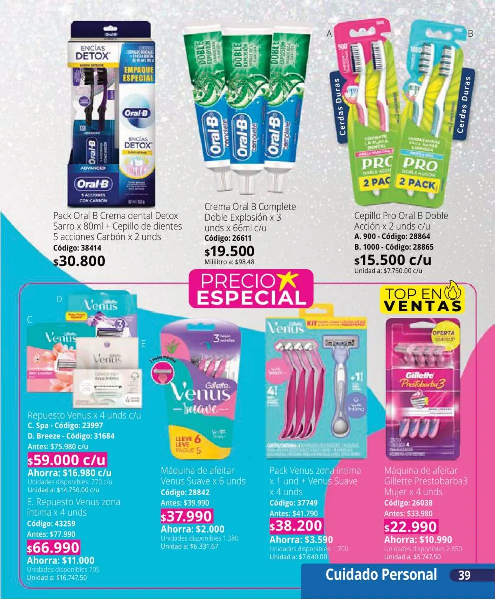 En el área de higiene bucal, el paquete de Oral B reúne todo lo que se necesita para una limpieza profunda: cepillos de cerdas suaves, una pasta dental con tecnología Detox para encías saludables y un hilo dental que completa la rutina diaria. Estas opciones no solo garantizan frescura, sino también un cuidado óptimo para prevenir problemas bucales a largo plazo.