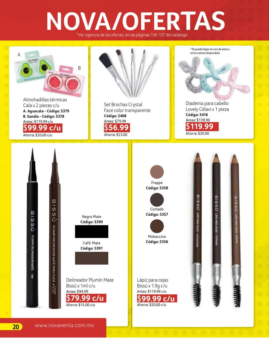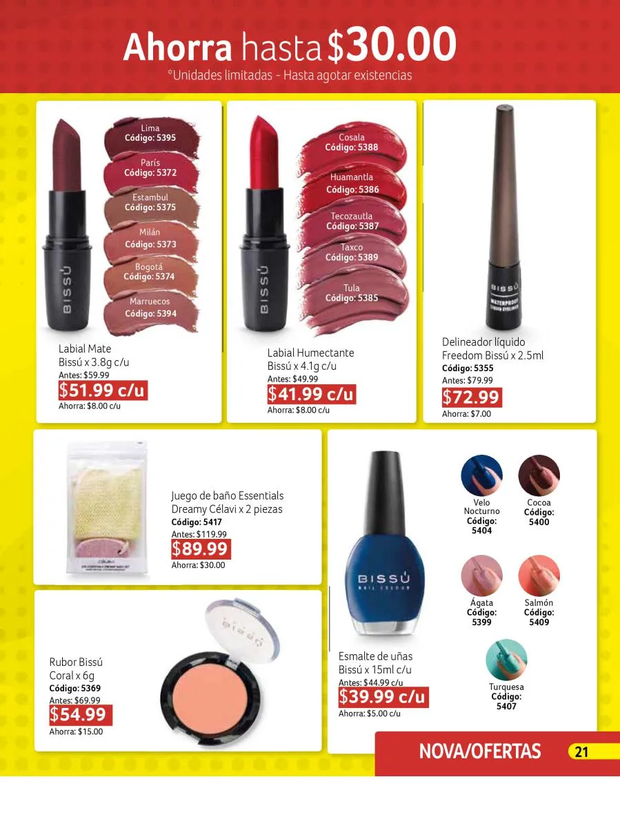 El catálogo Novaventa campaña 16 2025 también resalta por su surtido de productos de belleza que responden a diversas necesidades y gustos. La reconocida marca Bissú tiene un protagonismo especial con ofertas en delineadores líquidos, plumines mate, lápices para cejas, labiales y rubores. Los tonos presentados, desde rojos intensos hasta marrones cálidos, son ideales para realzar la belleza natural con un toque de sofisticación.