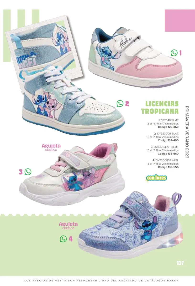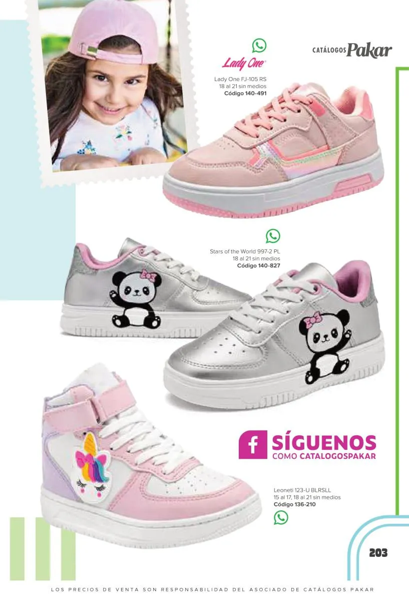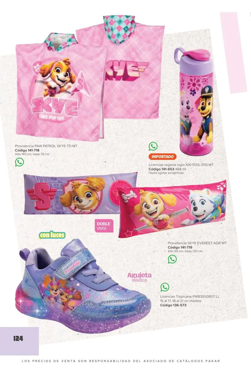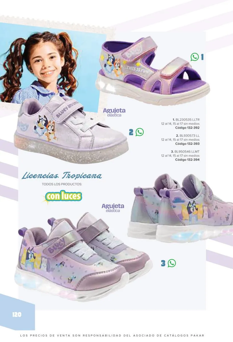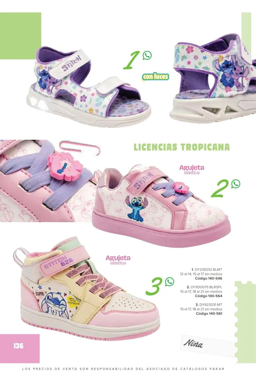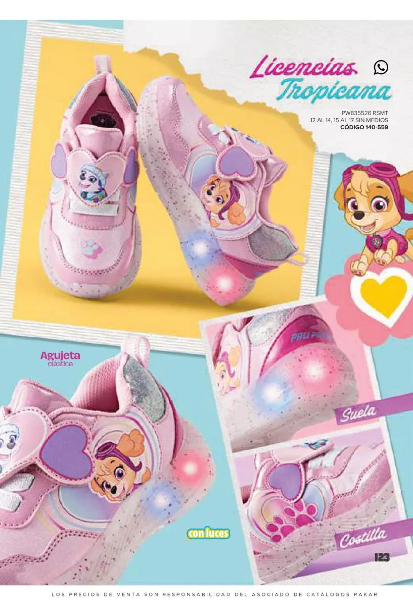 Este catalogo también incluye calzado con los personajes preferidos de las niñas, comenzando con hermosos diseños de Paw Patrol, también en esta colección se encuentran piezas de Frozen, Princesas de Disney, Hello Kitty, Minnie Mouse, Lilo y Stitch, Unicorn, y muchos más. Además de destacar con estos calzados, accesorios infantiles para que tu niña luzca radiante, mochilas, relojes, cojines, lámparas, lapiceras, lentes de sol, impermeables, tapabocas, gorras, entre otros.