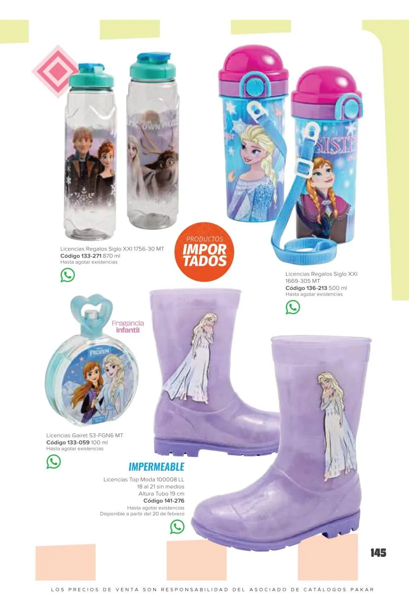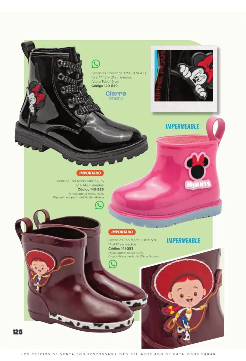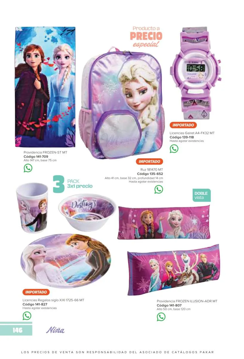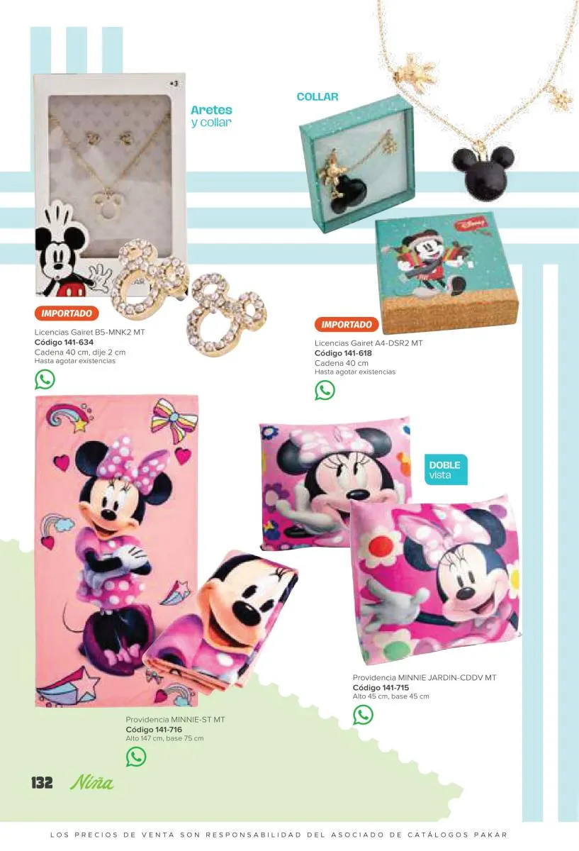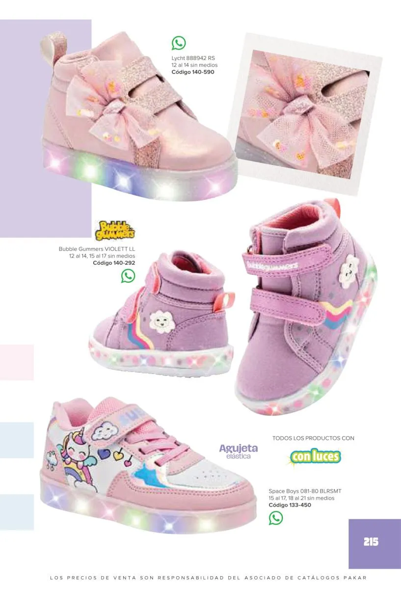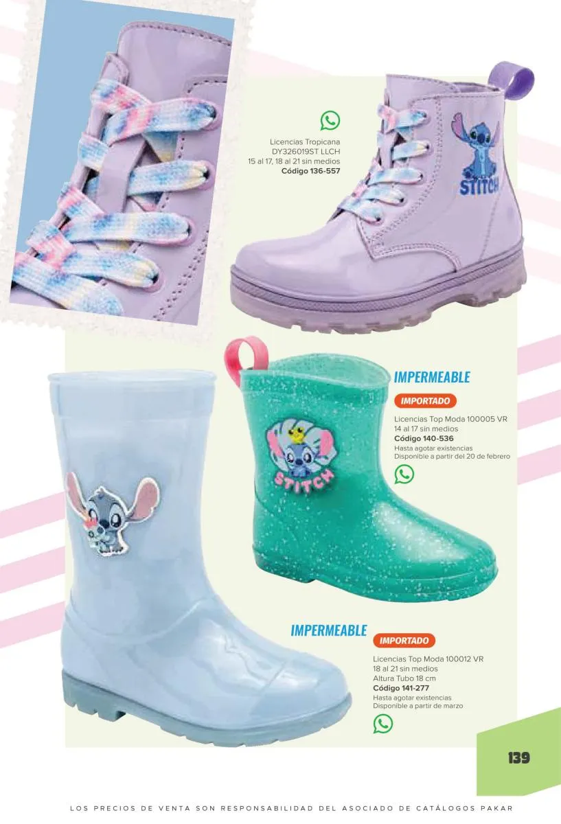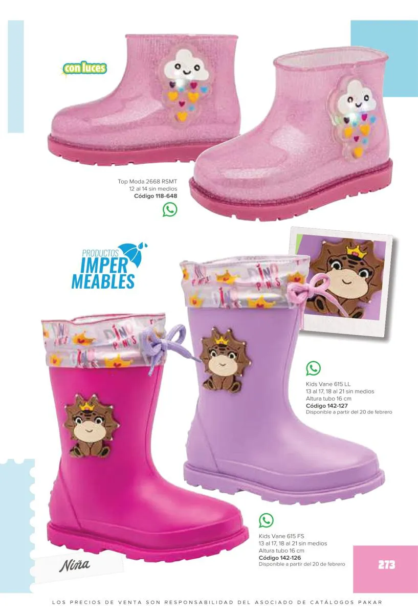 Este catalogo también incluye calzado con los personajes preferidos de las niñas, comenzando con hermosos diseños de Paw Patrol, también en esta colección se encuentran piezas de Frozen, Princesas de Disney, Hello Kitty, Minnie Mouse, Lilo y Stitch, Unicorn, y muchos más. Además de destacar con estos calzados, accesorios infantiles para que tu niña luzca radiante, mochilas, relojes, cojines, lámparas, lapiceras, lentes de sol, impermeables, tapabocas, gorras, entre otros.