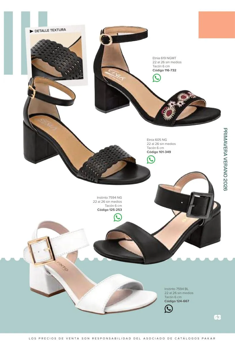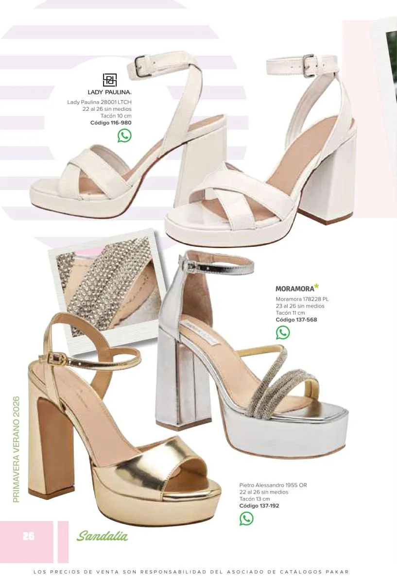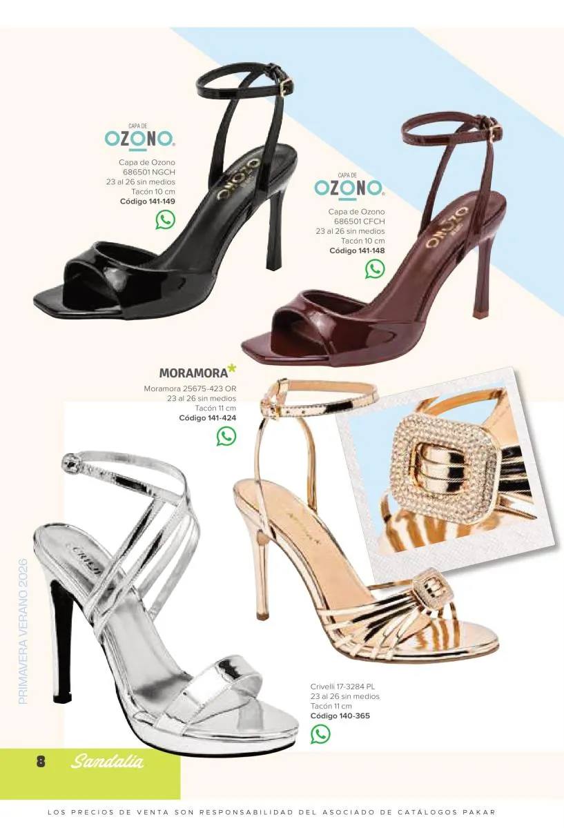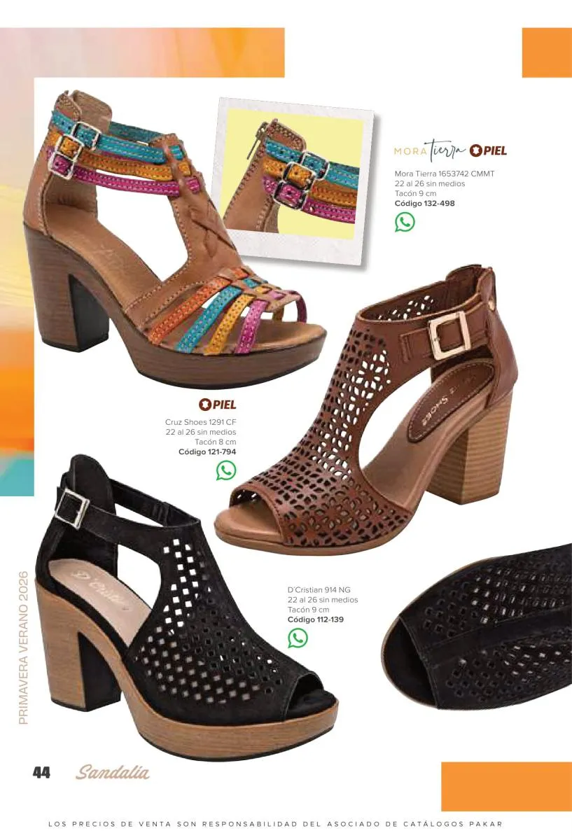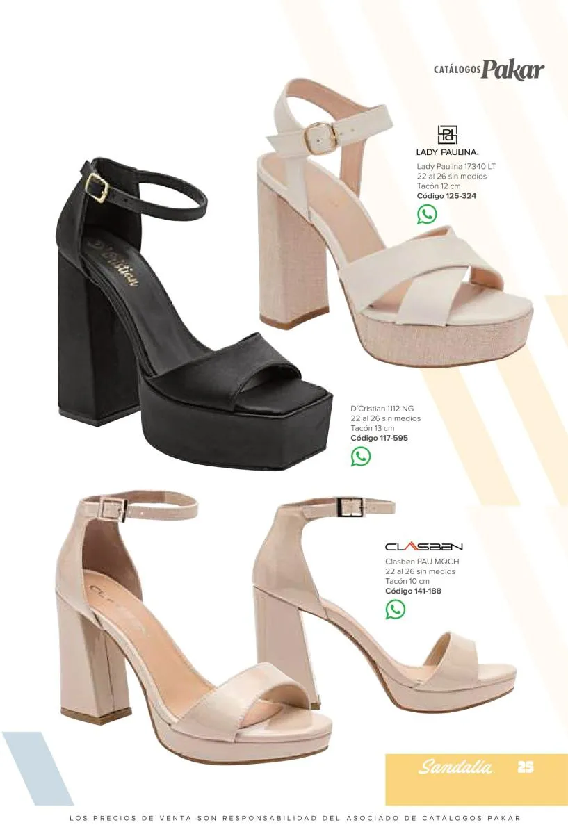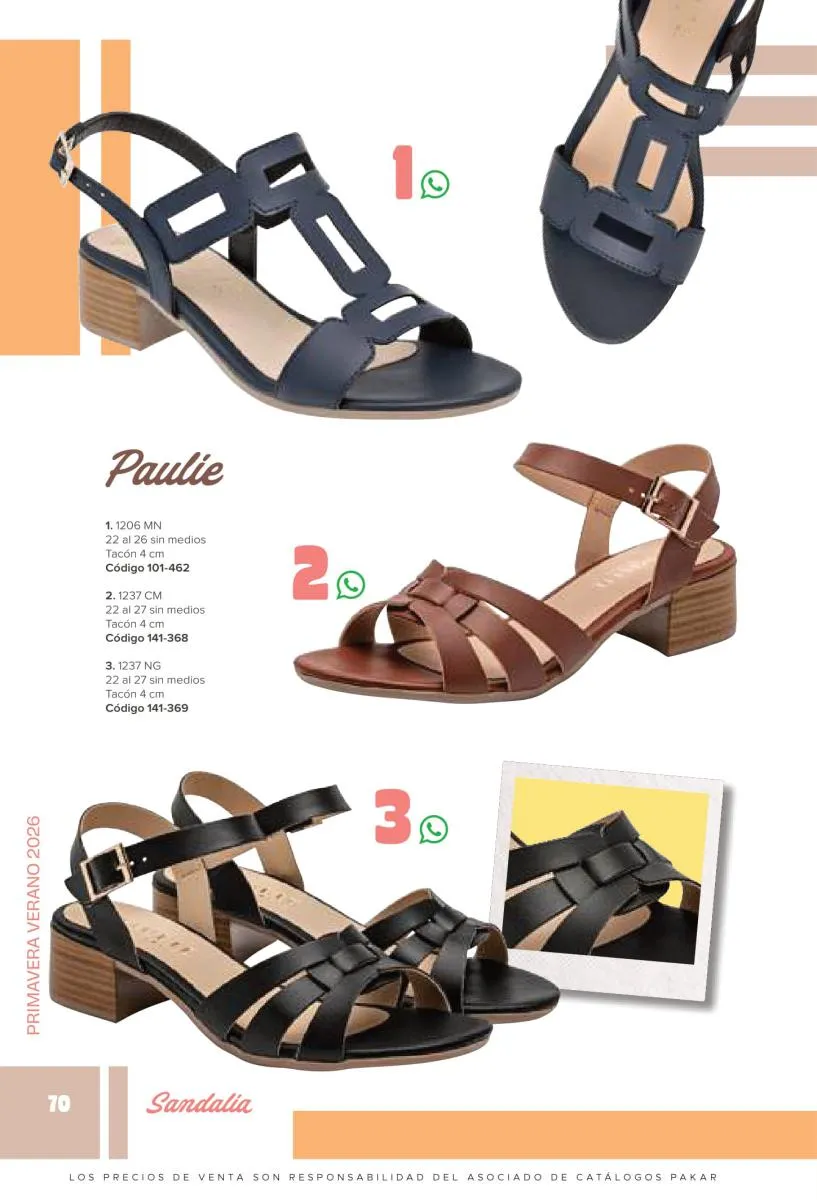 Otras opciones que tiene esta catálogo Pakar Sandalia primavera verano 2026 México, son las sandalias de corte alto, son cerradas en casi toda su extensión, de tacón alto y con un aspecto sumamente refinado. Están hechas en diferentes materiales para crear estilos muy marcados, seguro puedes combinarlas con unos hermosos jeans o alguna linda minifalda. Para una personalidad un poco más divertida, tenemos modelos más coloridos y con detalles en su superficie. Diseños coloridos, estampados, de flores, entre otros, todos creados con la intención de resaltar tu estilo y tu personalidad.