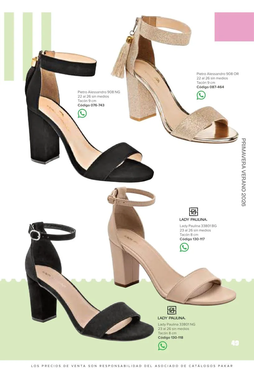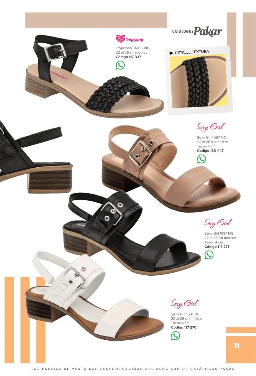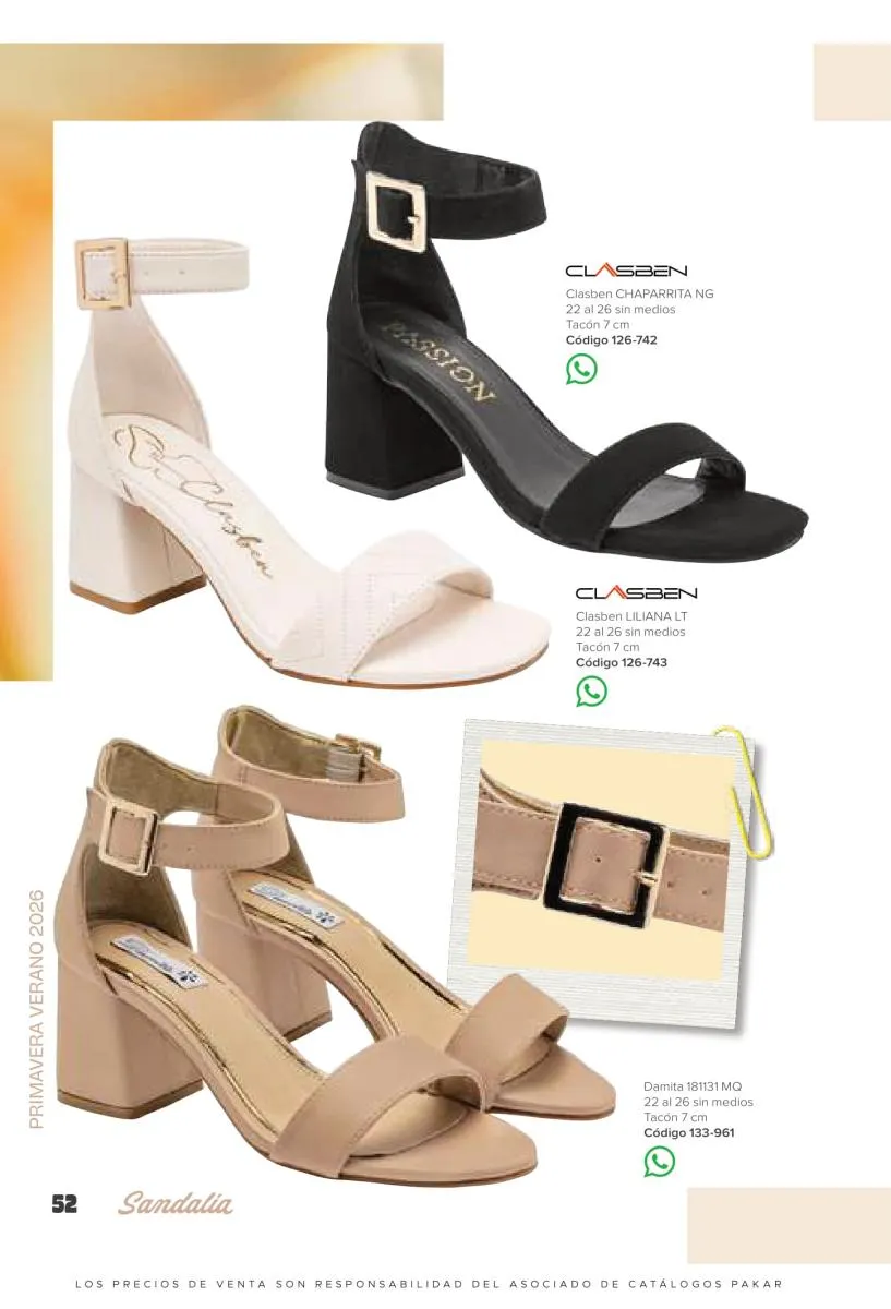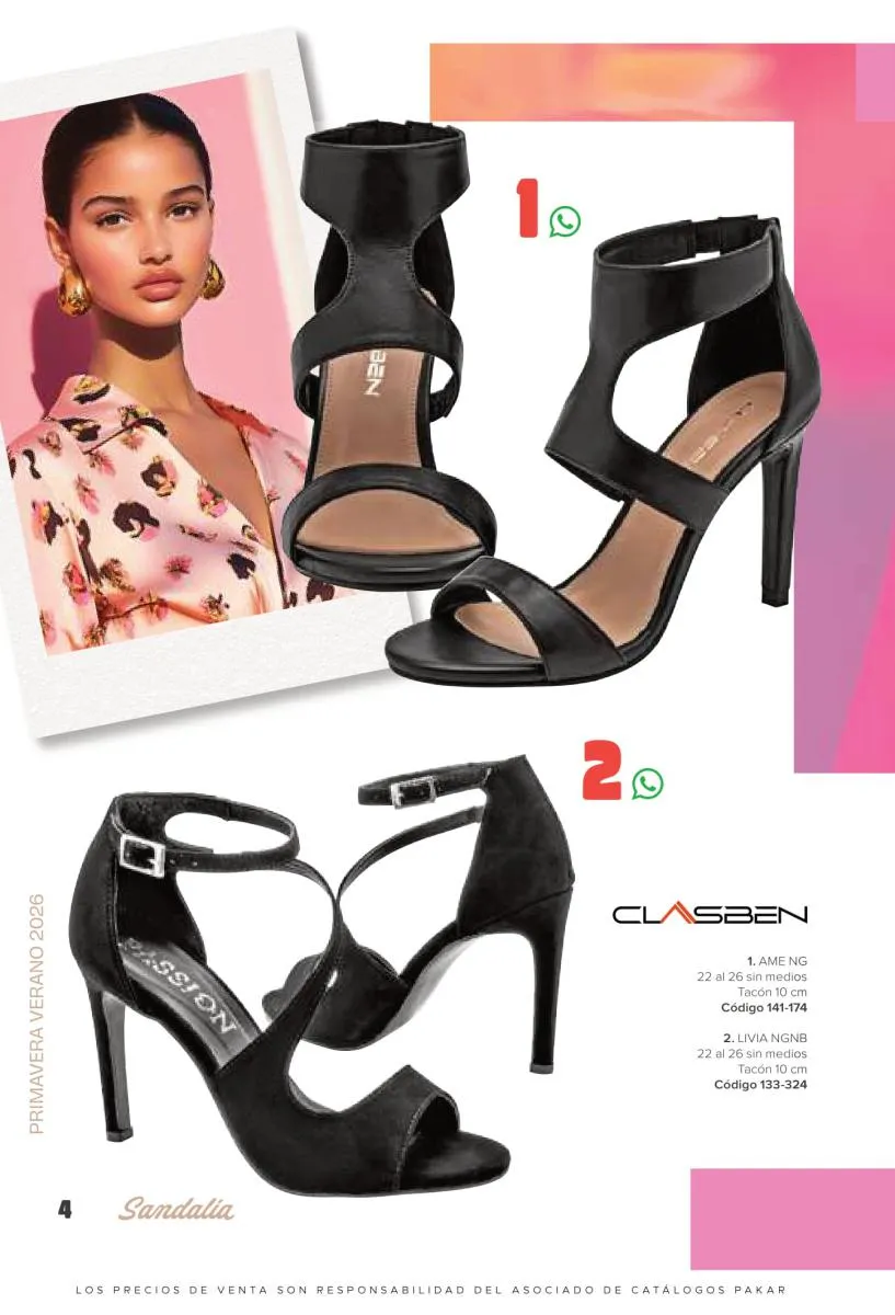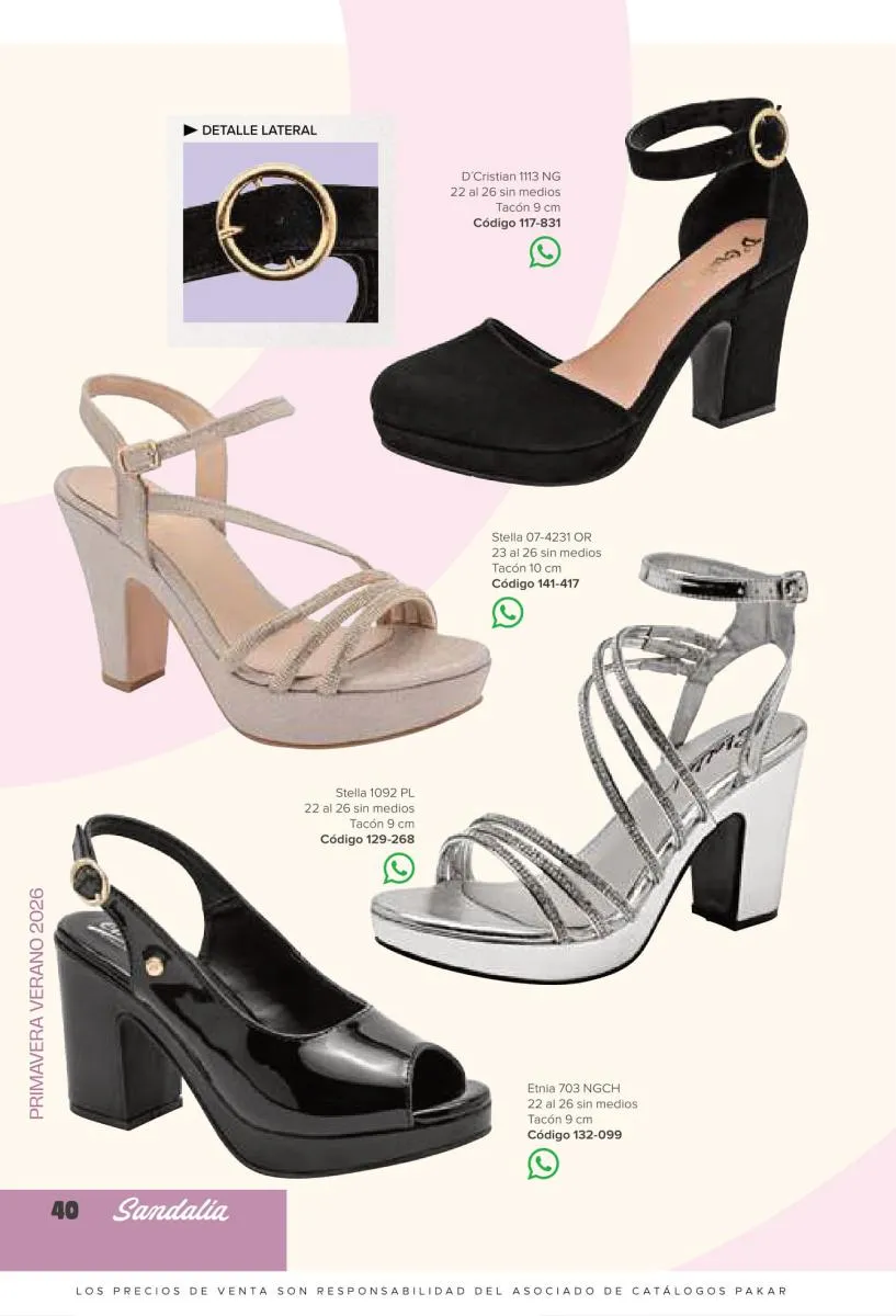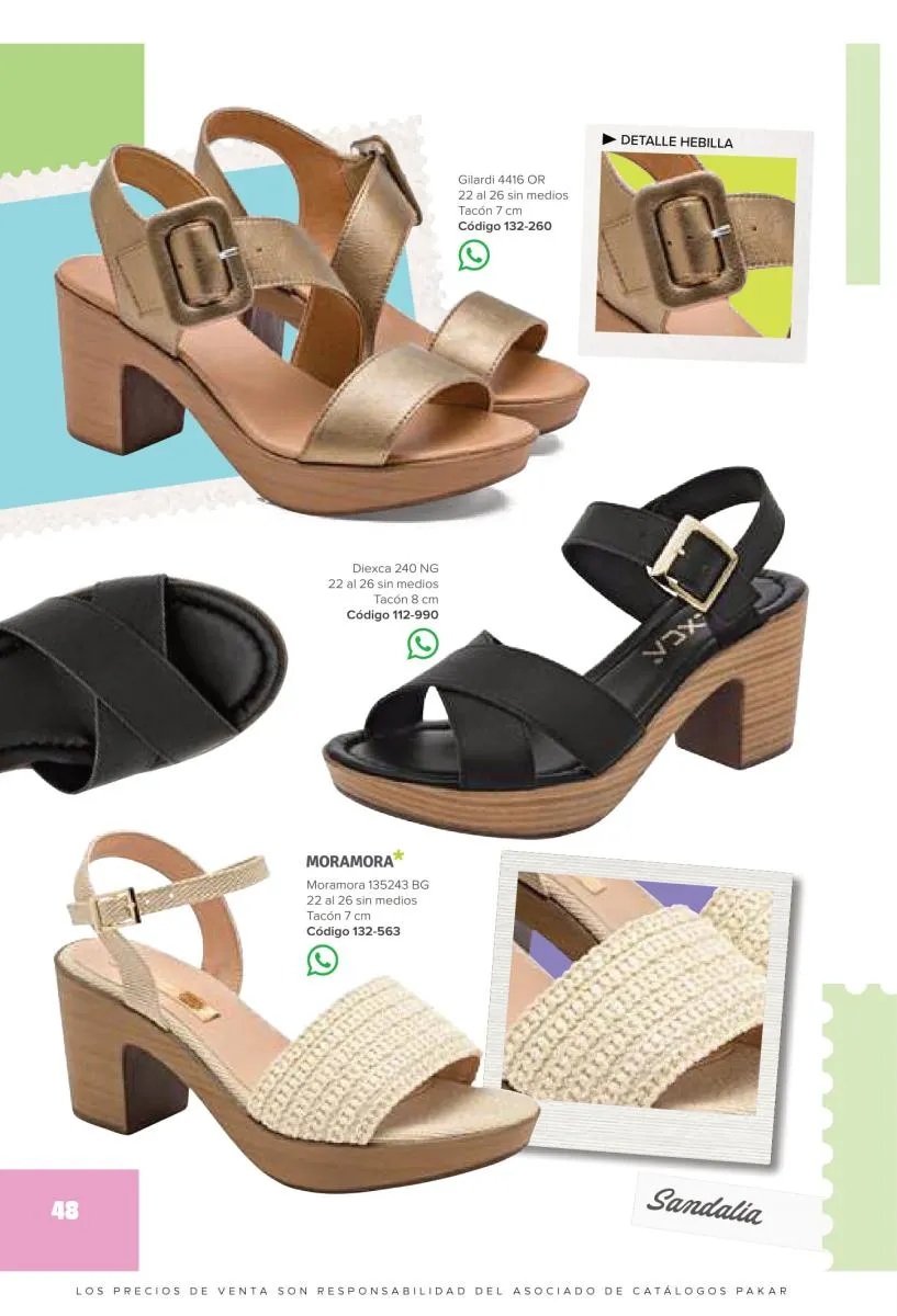 Otras opciones que tiene esta catálogo Pakar Sandalia primavera verano 2026 México, son las sandalias de corte alto, son cerradas en casi toda su extensión, de tacón alto y con un aspecto sumamente refinado. Están hechas en diferentes materiales para crear estilos muy marcados, seguro puedes combinarlas con unos hermosos jeans o alguna linda minifalda. Para una personalidad un poco más divertida, tenemos modelos más coloridos y con detalles en su superficie. Diseños coloridos, estampados, de flores, entre otros, todos creados con la intención de resaltar tu estilo y tu personalidad.