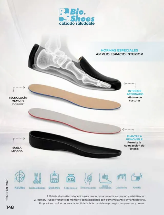 También encontrarás calzado especialmente recomendado para espolón calcáneo y pies delicados con triple anchura, plantilla removible y cojín de gel.