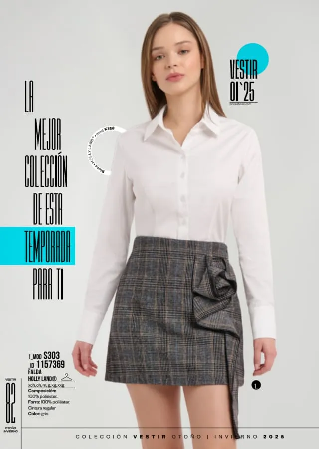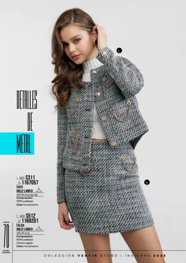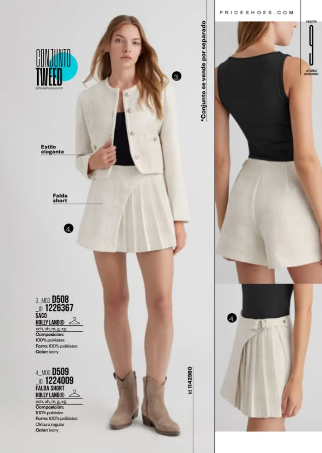 Constan de dos piezas, con blusas manga larga y cuello alto, acompañadas por faldas a la rodilla (tiro alto) y corte lateral, elegante y sexy a la vez.