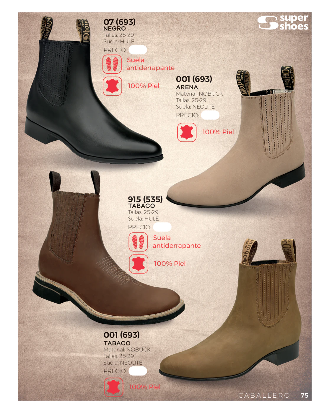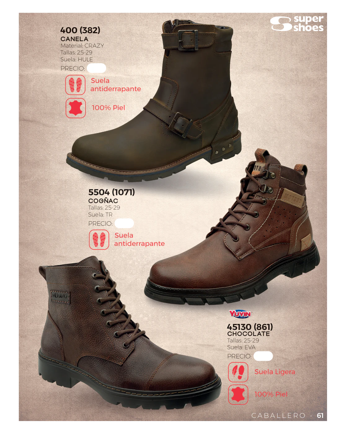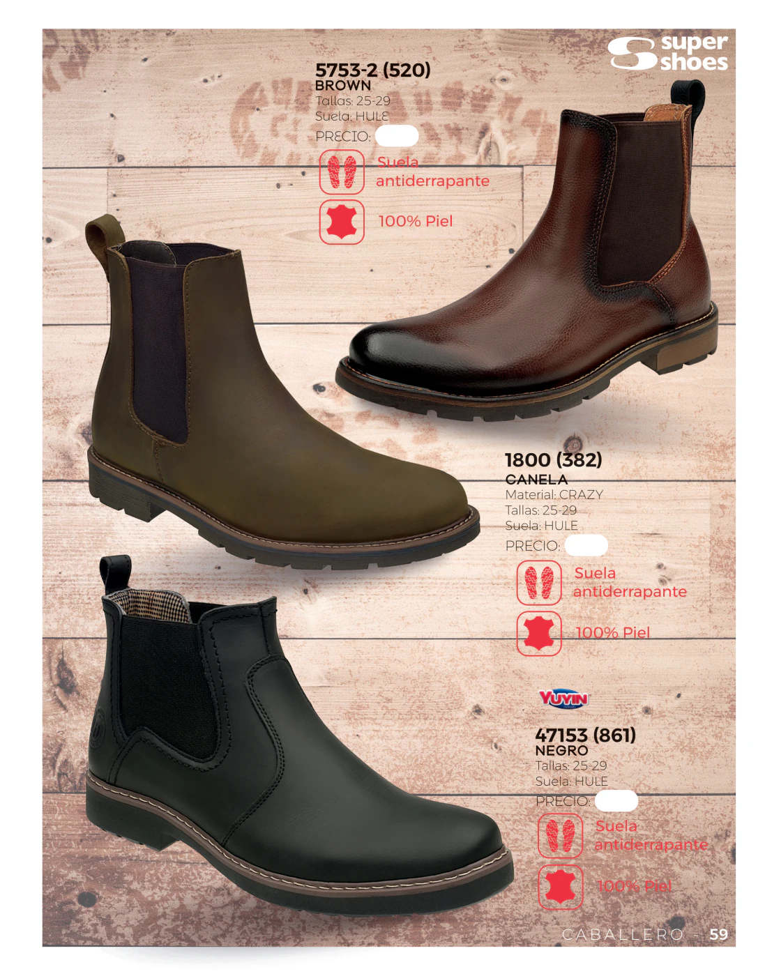 Finalizamos este recorrido por el catálogo Super Shoes Caballero con los modelos de botas para caballero, un calzado que les hace lucir atractivos y elegantes. Hay una amplia gama de modelos que seguro ellos gustarán usar, como el modelo 6481(272) en color maple que tiene un cómodo elástico en tobillera.
