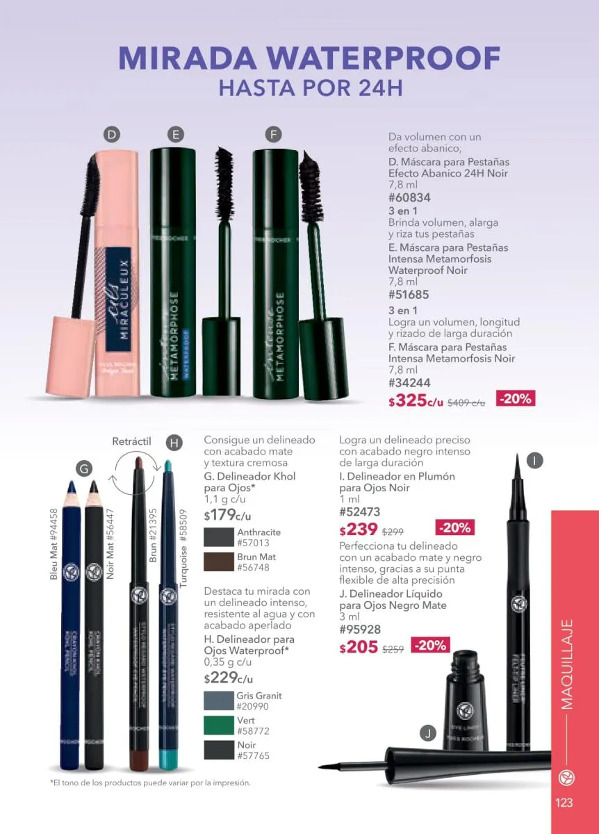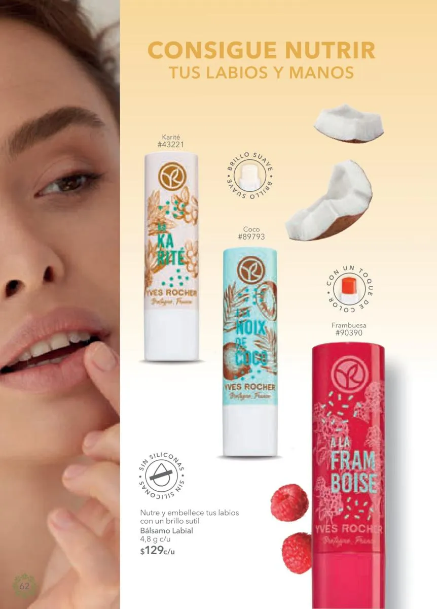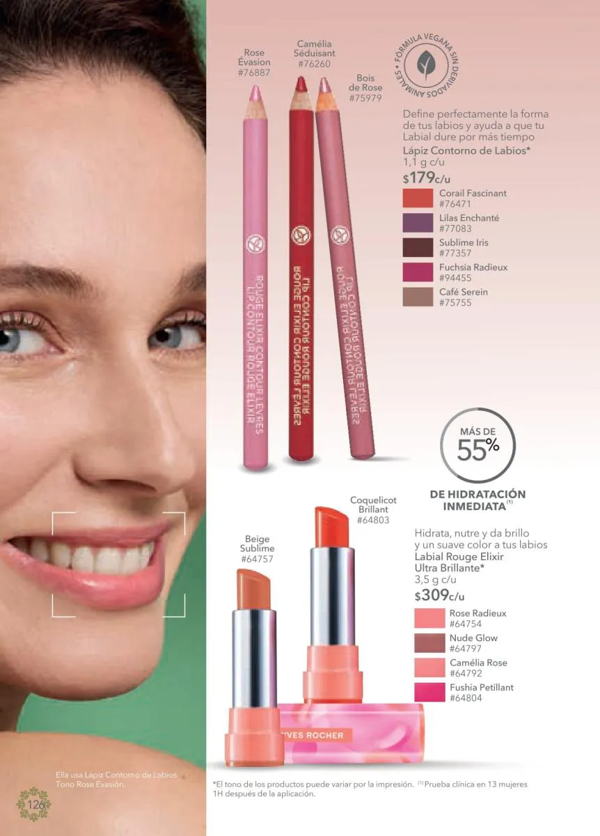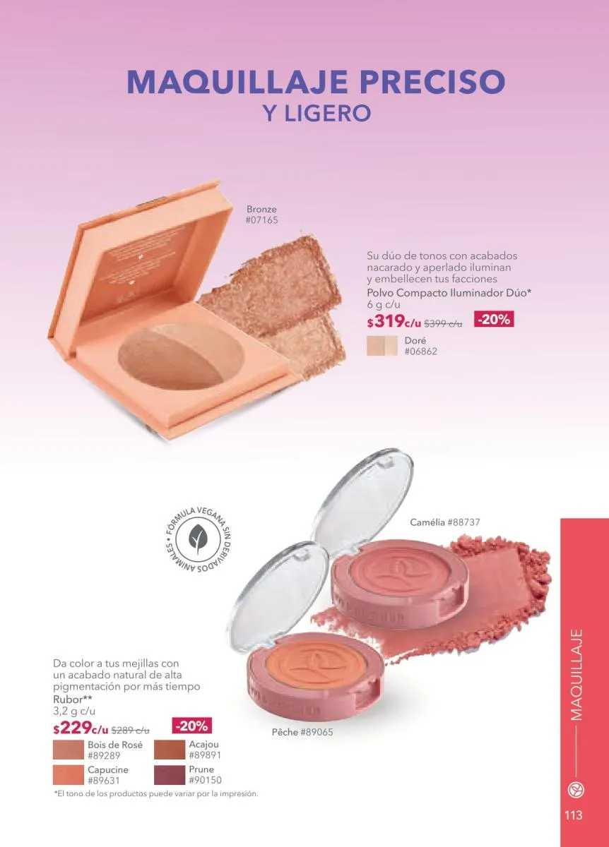 - Desde la página 74 encontrarás mucho más en la categoría de maquillaje con las líneas favoritas de Yves Rocher. Consulta los fabulosos precios de los rubores, máscaras, bases y demás que te harán destacar en estas fiestas.