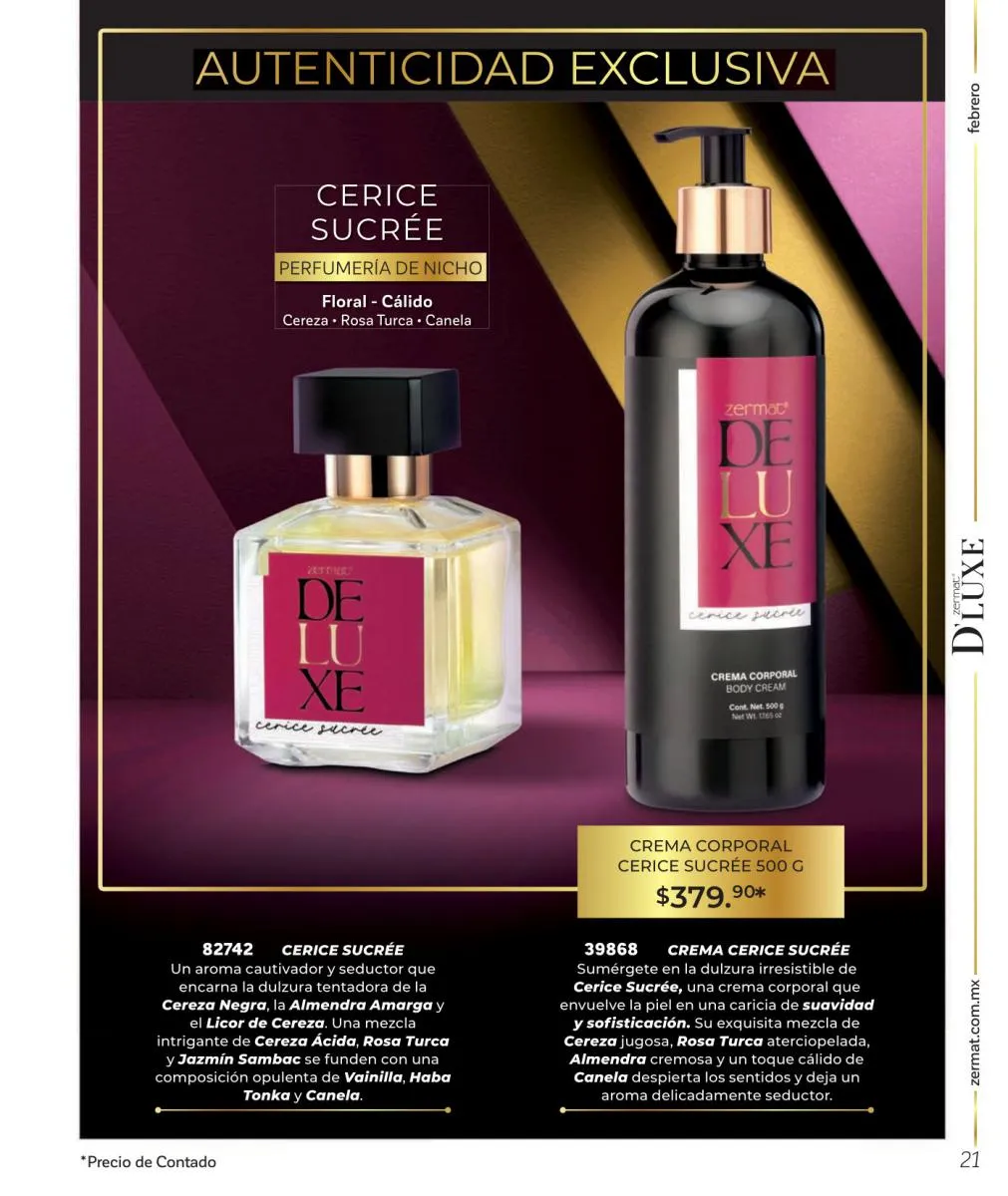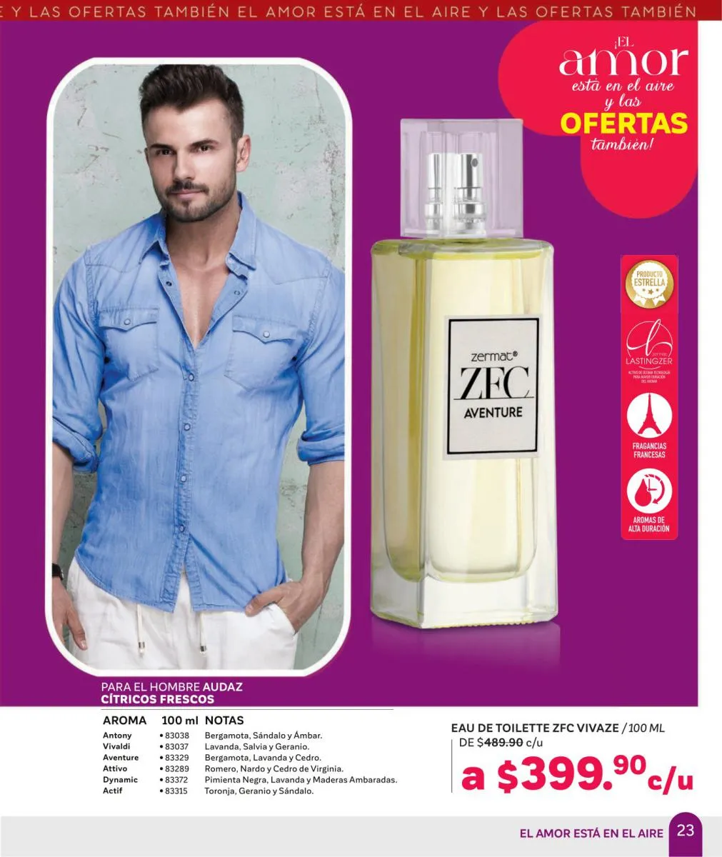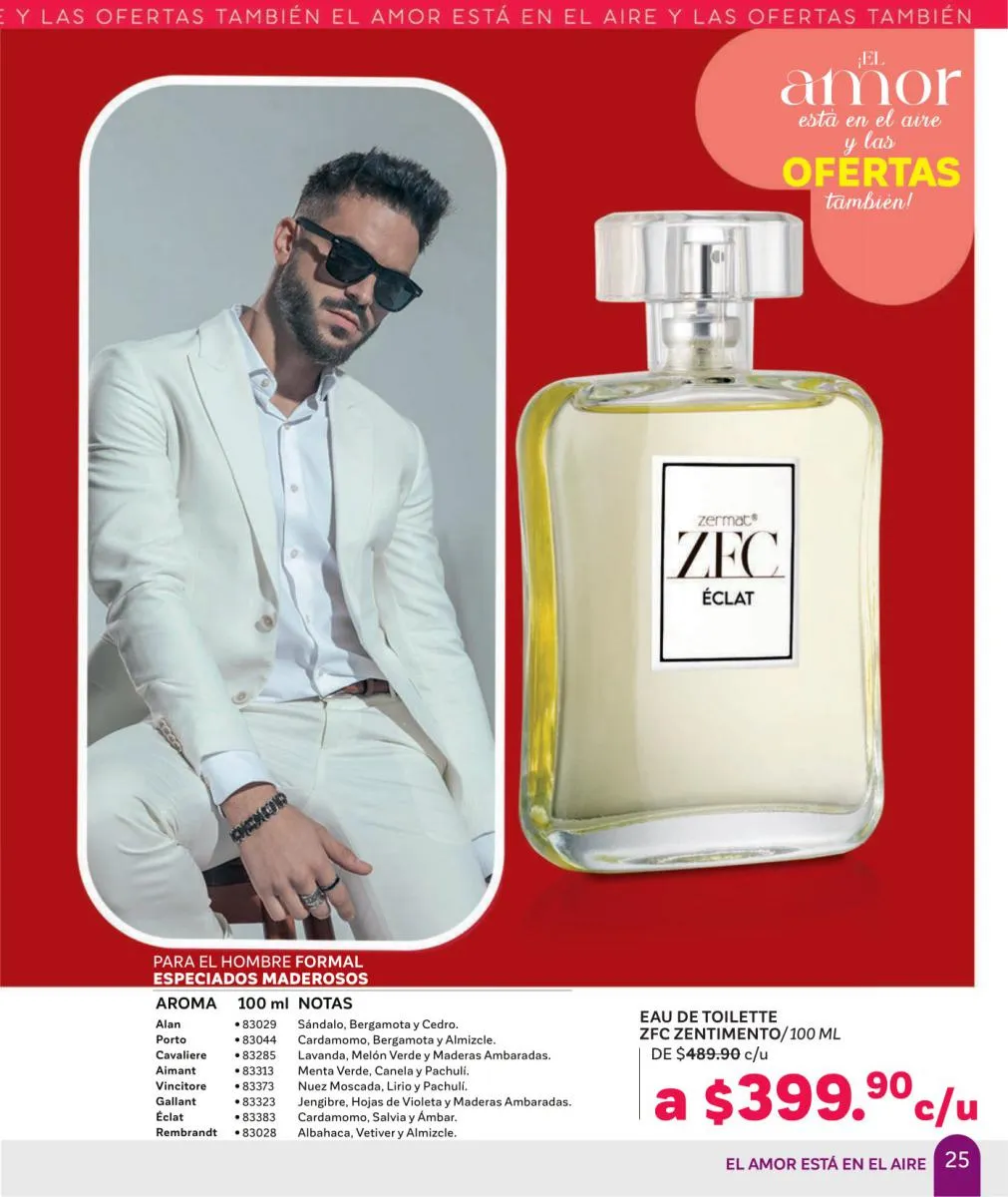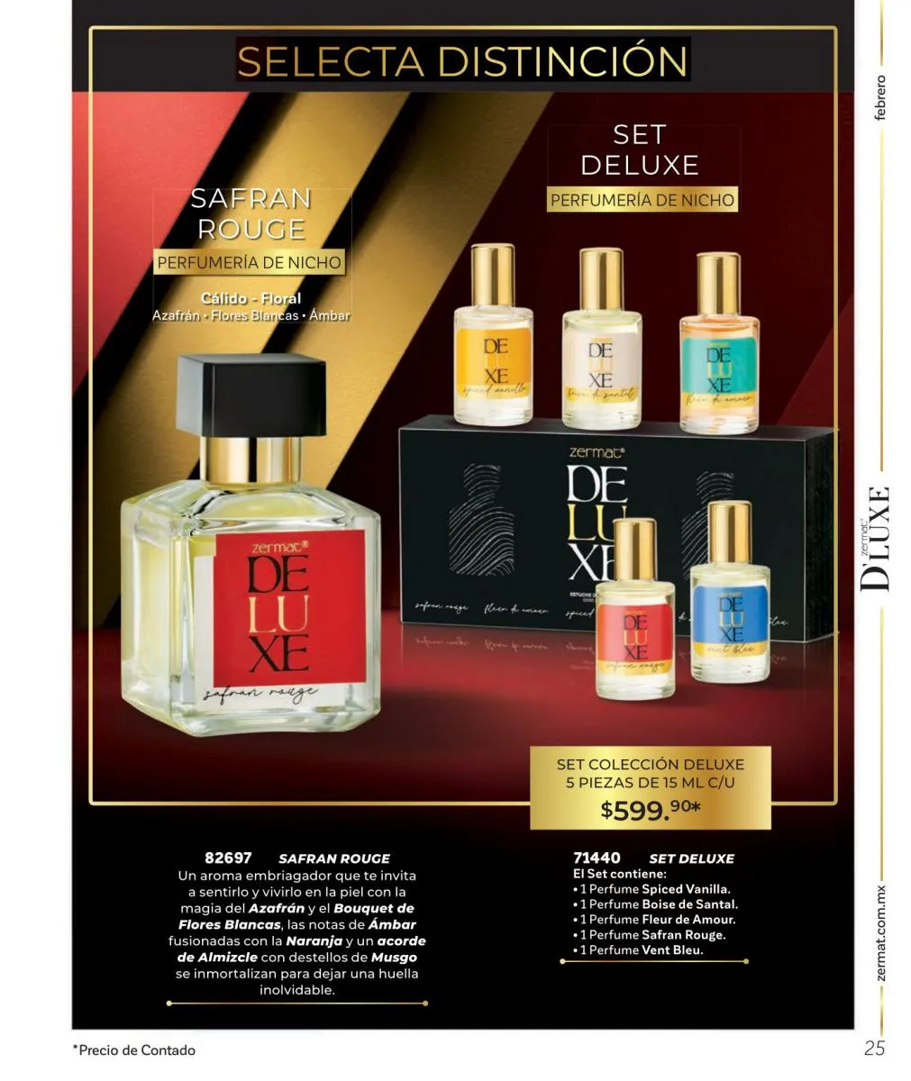 Comparte amor y disfruta las mejores aventuras, descubre nuevas fragancias, en esta Zermat catálogo Febrero 2026 México te ofrecemos perfumes llenos de seducción, para que transmitas pura sensualidad y generes un ambiente cargado de pasión. Sorprende a tu pareja con una de nuestras lociones corporales, desodorantes o perfumes. Tenemos excelentes opciones para hombres y mujeres, para que lleven su relación a un nuevo nivel.