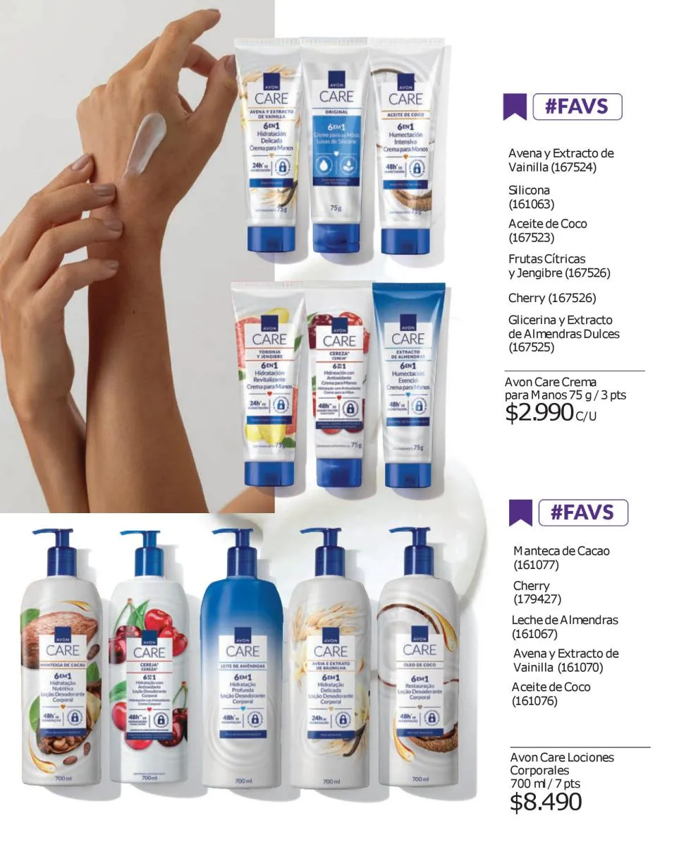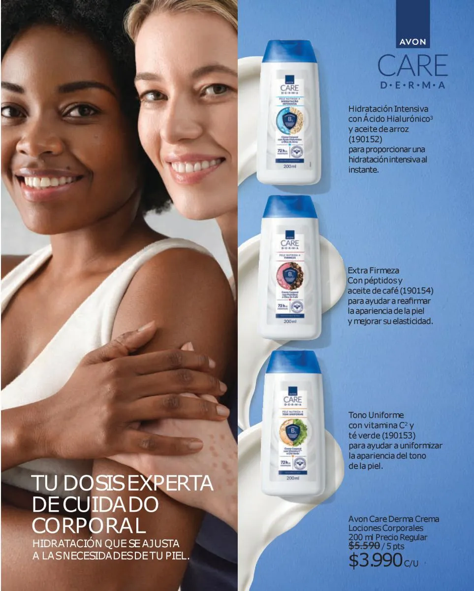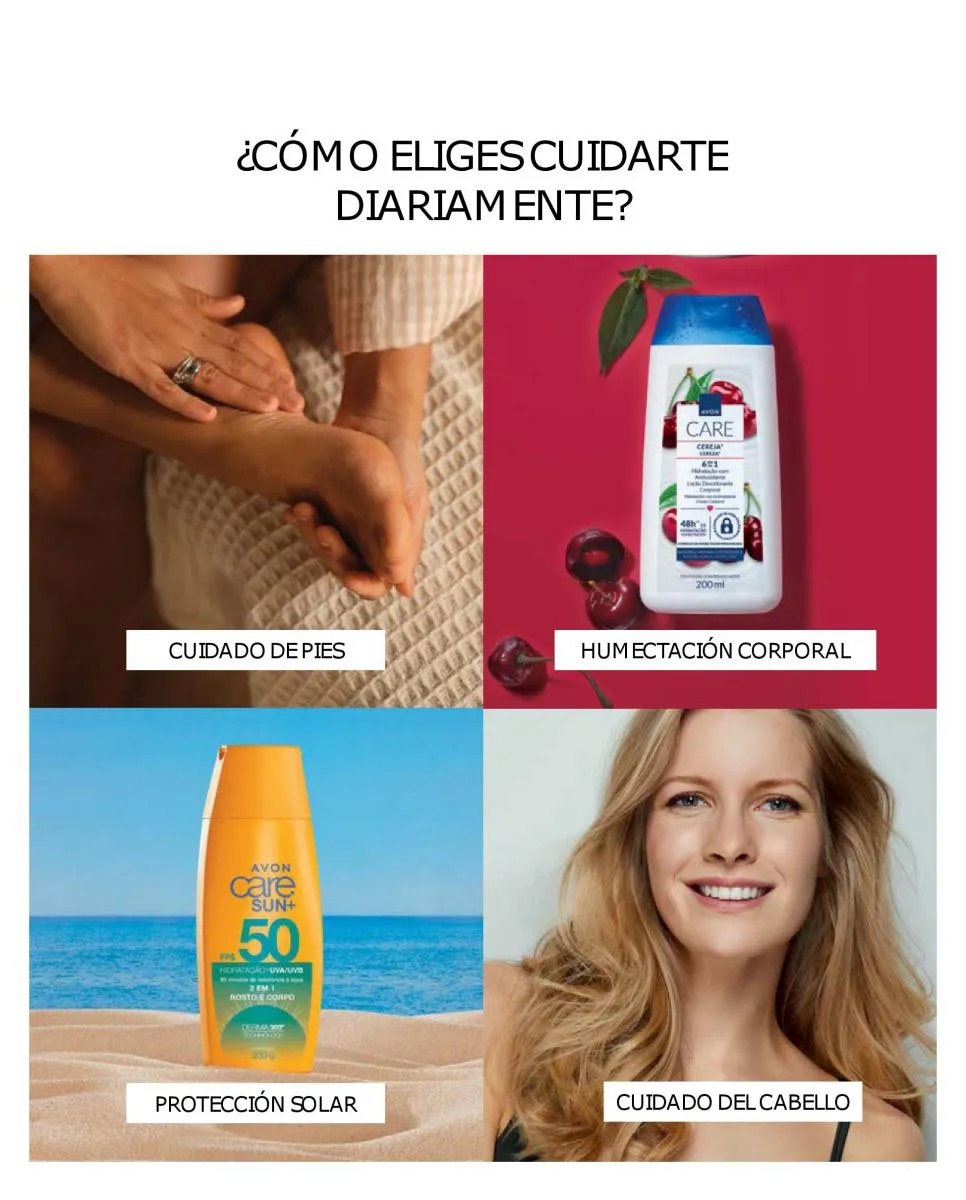 Y para todo tu cuerpo, las cremas Avon campaña 17 2025 Care formuladas con proteínas de leche y vitamina E que hidrata tu piel durante todo el día. Asimismo, tienes la línea Care Sun que te cuida antes y después del sol.