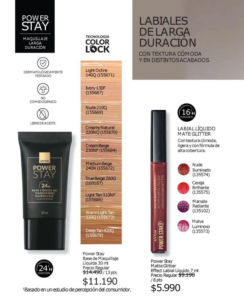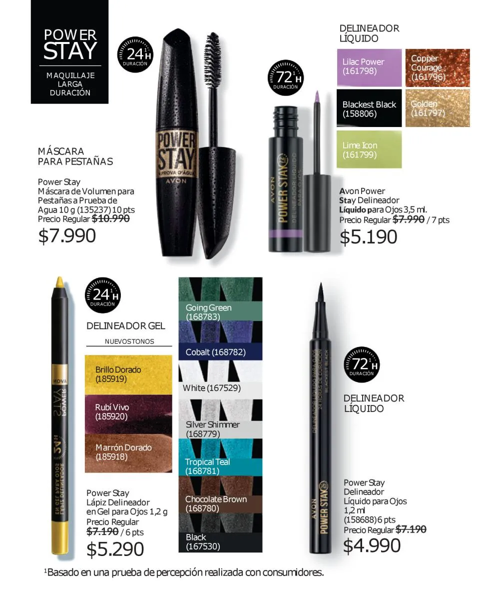 El maquillaje se vuelve poderoso con la línea power stay de larga duración en delineadores duales de cejas, bases líquidos y mascará que extiende las cejas en 9 veces su volumen con resistencia al calor y humedad, cero grumos, aprueba de agua y con duración por 24 horas.