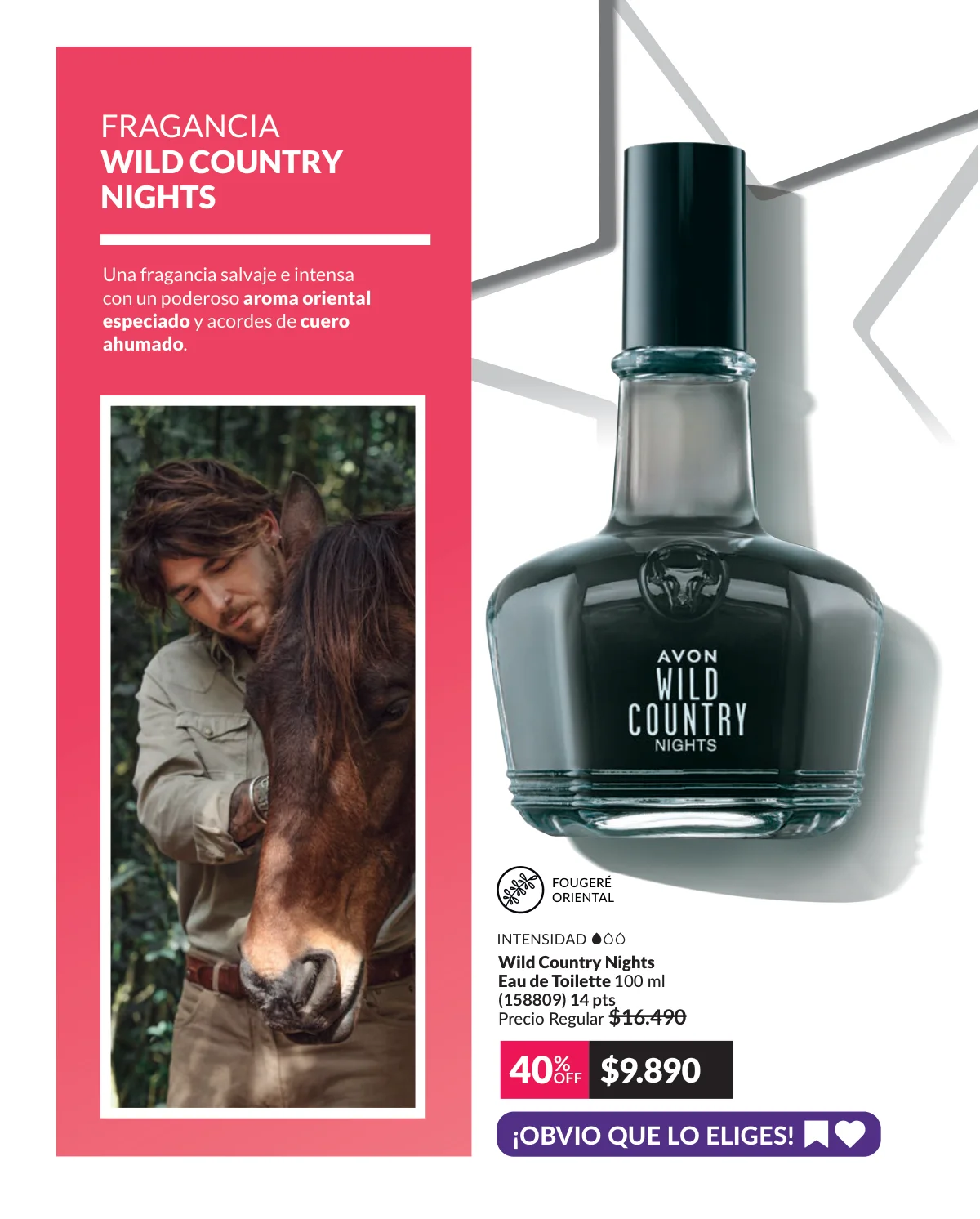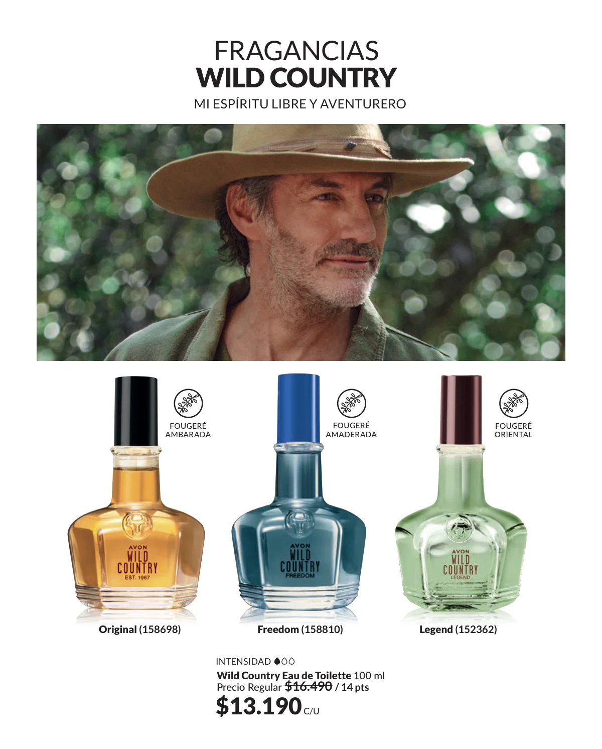 - Para ellos los productos de Wild Country resultan realmente fabulosos. En la página 14 puedes verificar el precio de este trio: desodorante roll on, spray para el cuerpo y eau de toilette. O llevar el pack de 6 unidades (página 14).