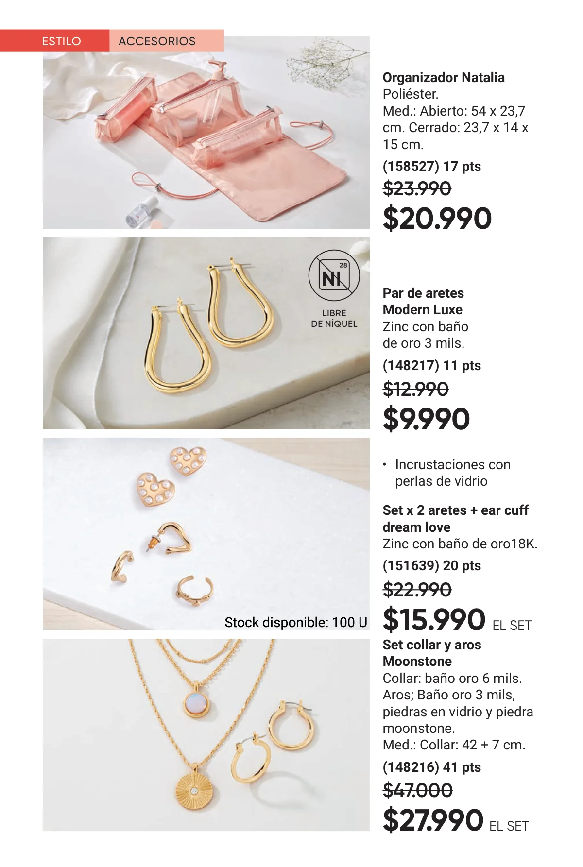 No dejes de probarte los sets de aretes con hasta 25 pares disponibles, hechos en zinc y bañados en oro, o los collares de tipo Scarlet, con dije de piedra real o el set de corazones, compuesto de collar, brazalete y aros.