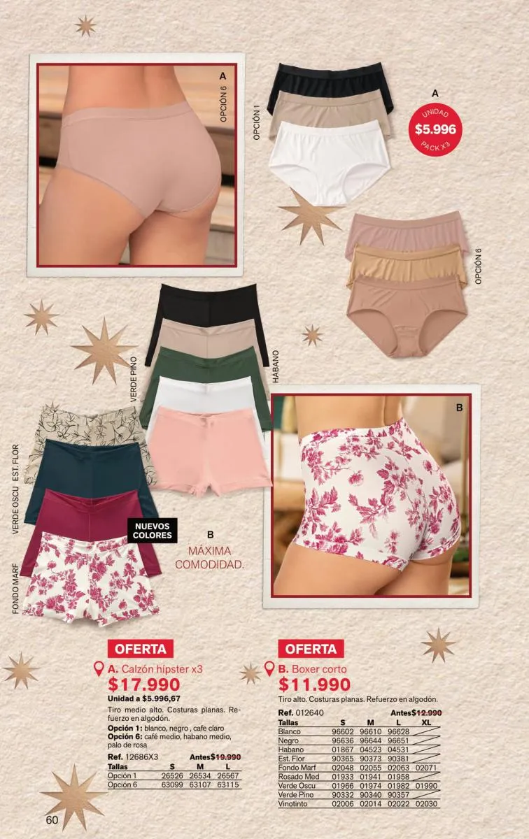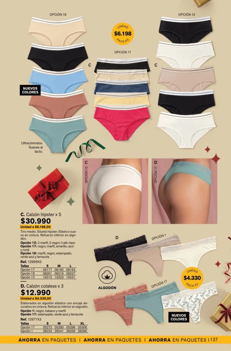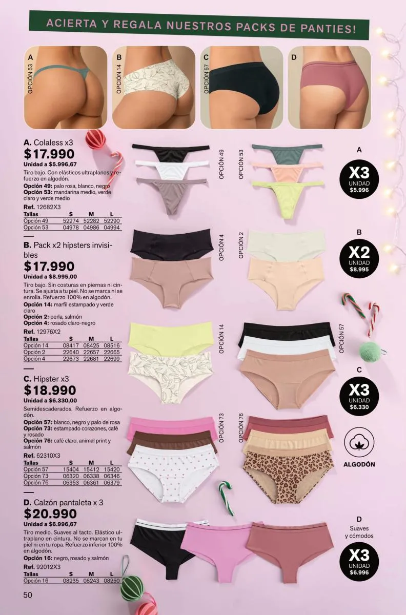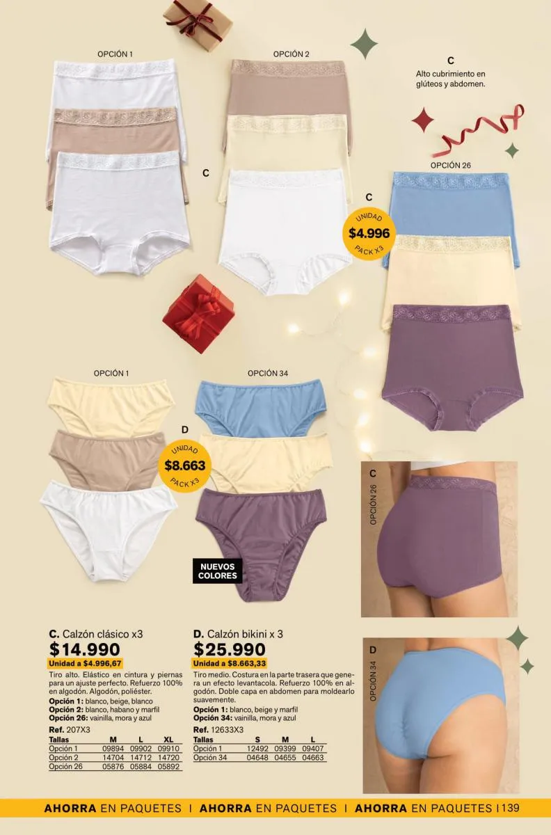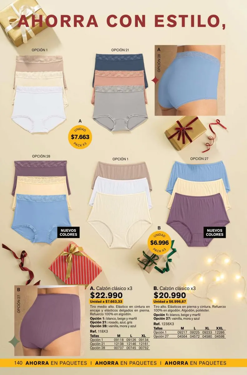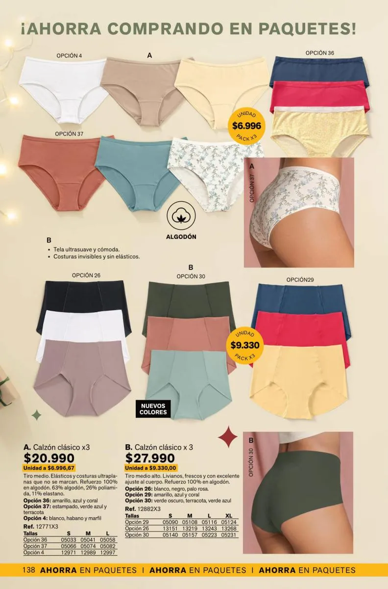 Leonisa además trae packs para ti, puedes llevar, 2 0 3 colaless o bóxer corto con costura plana y refuerzo en algodón. También obtener un pack de tangas y clásicos con diferentes diseños y colores.