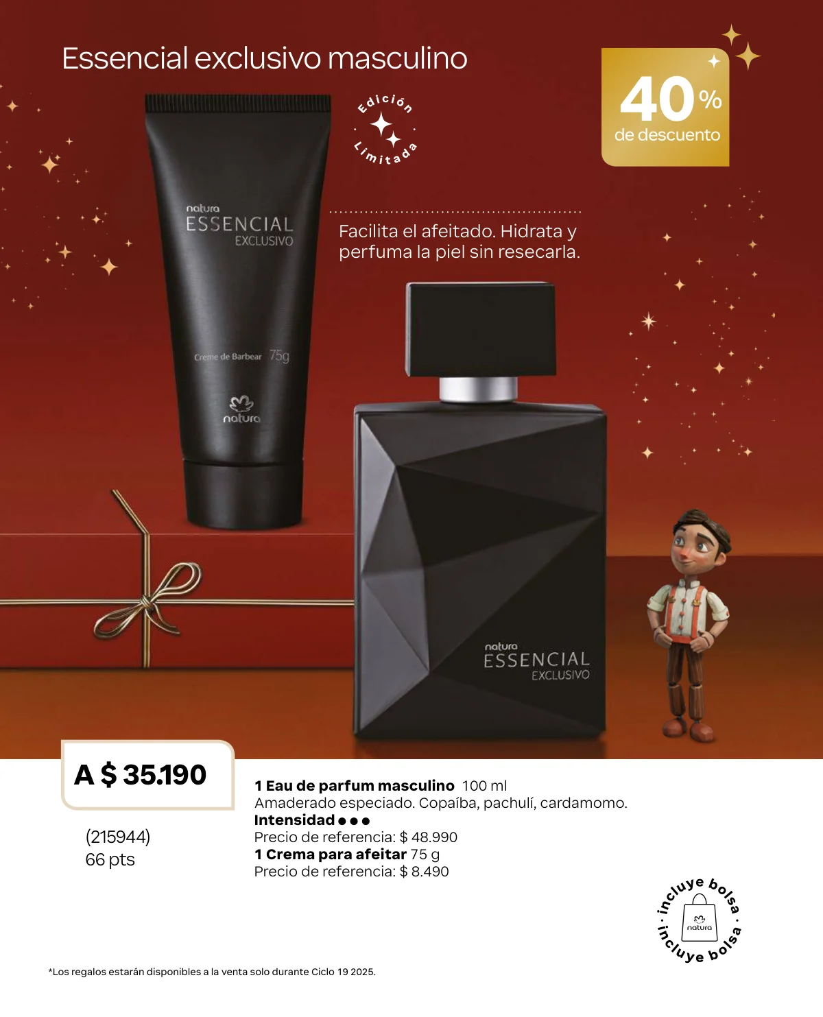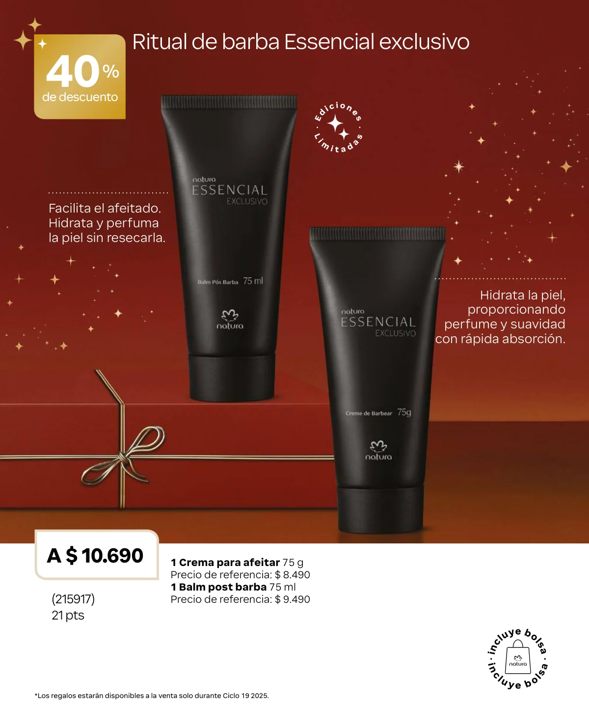 - Para los caballeros un duo especial de Homem Re.Conecta: 1 crema de afeitar 2 en 1 y un hidratante corporal. Estos con su bolsa de regalo a un 40% off.