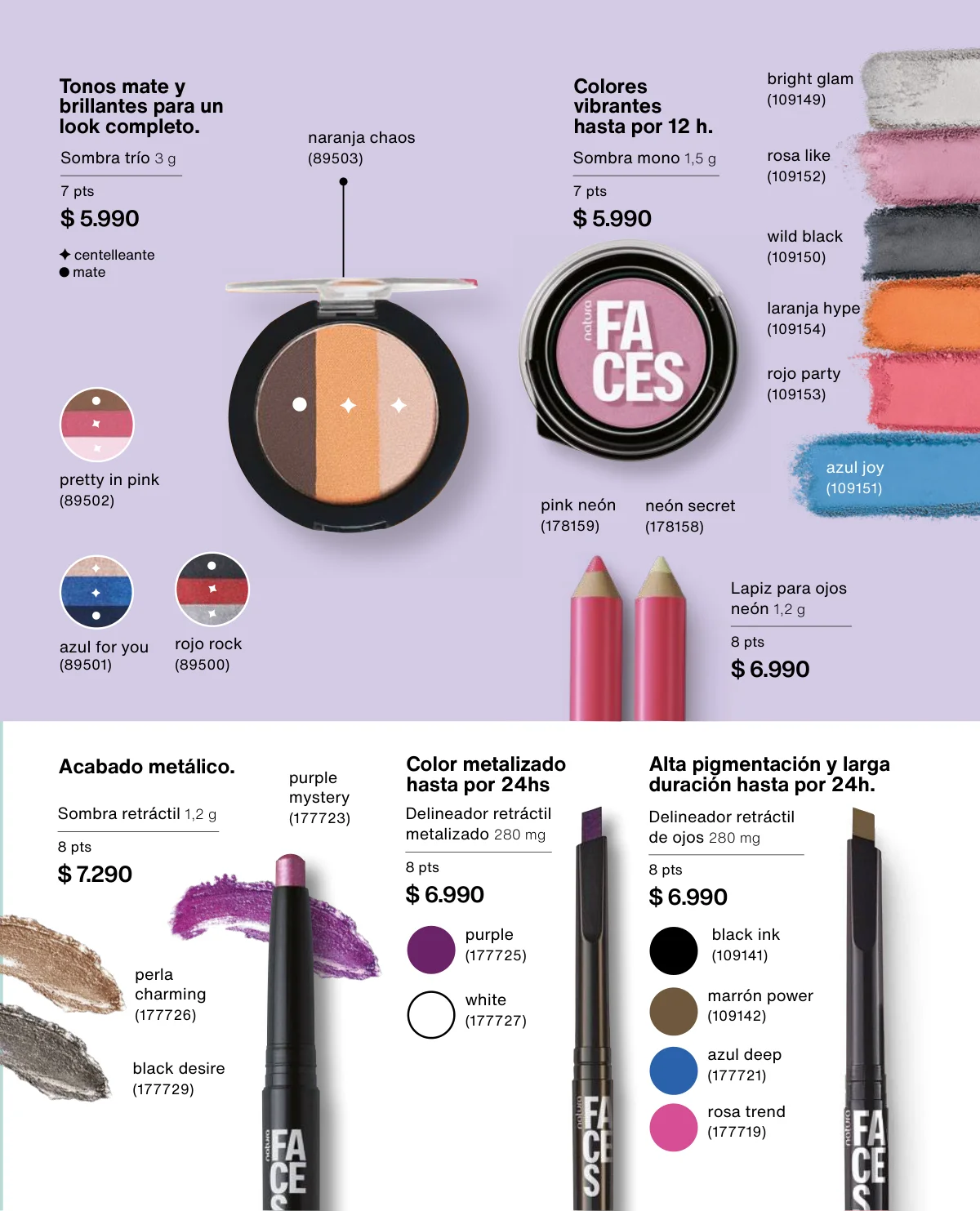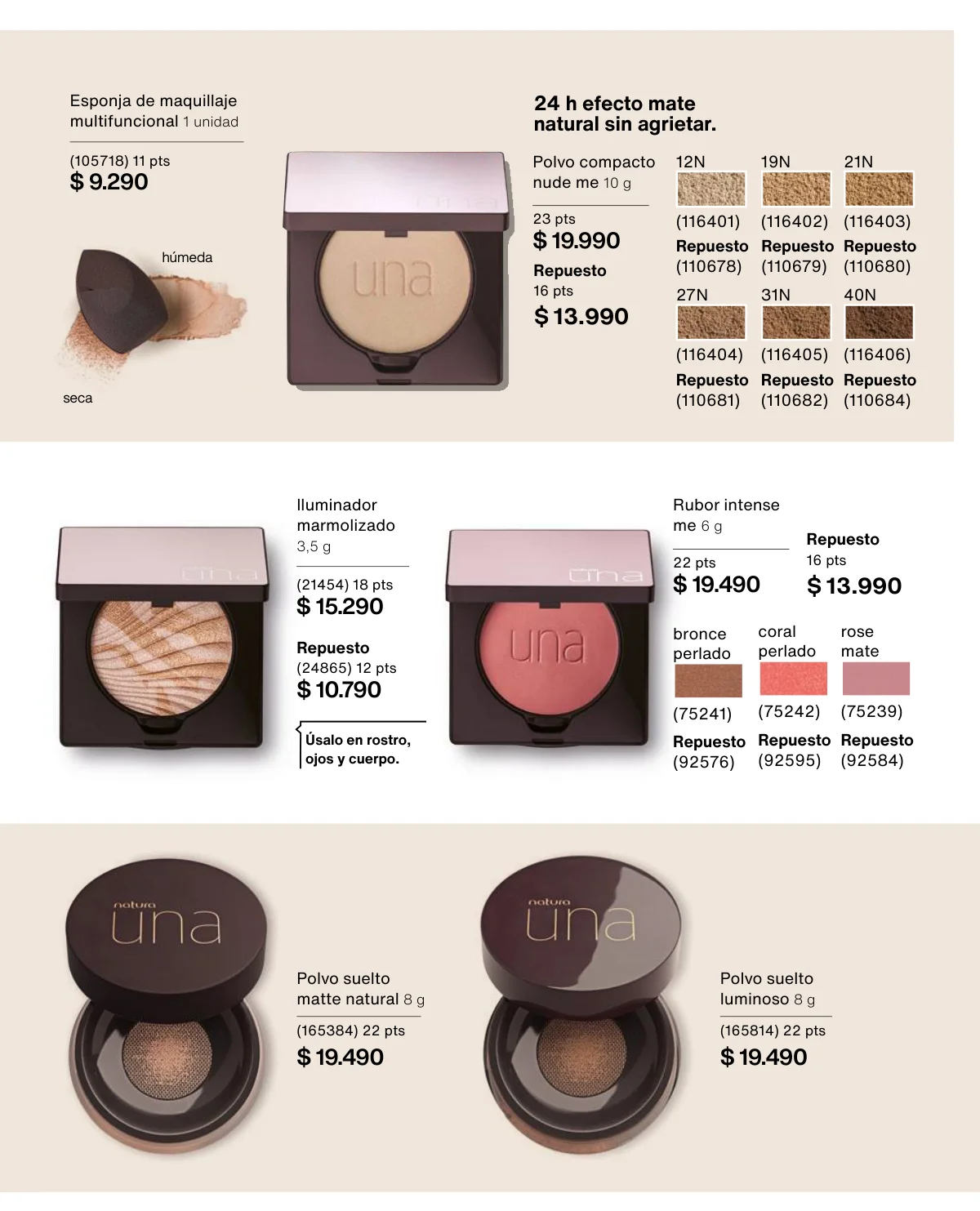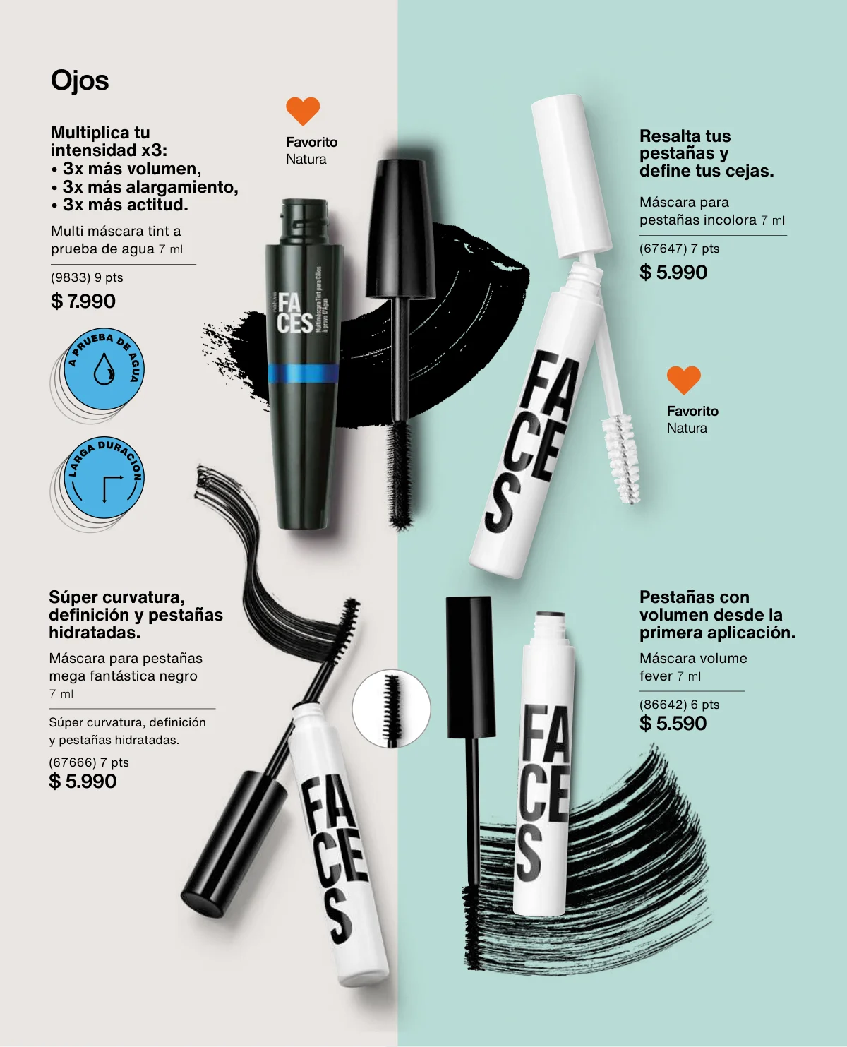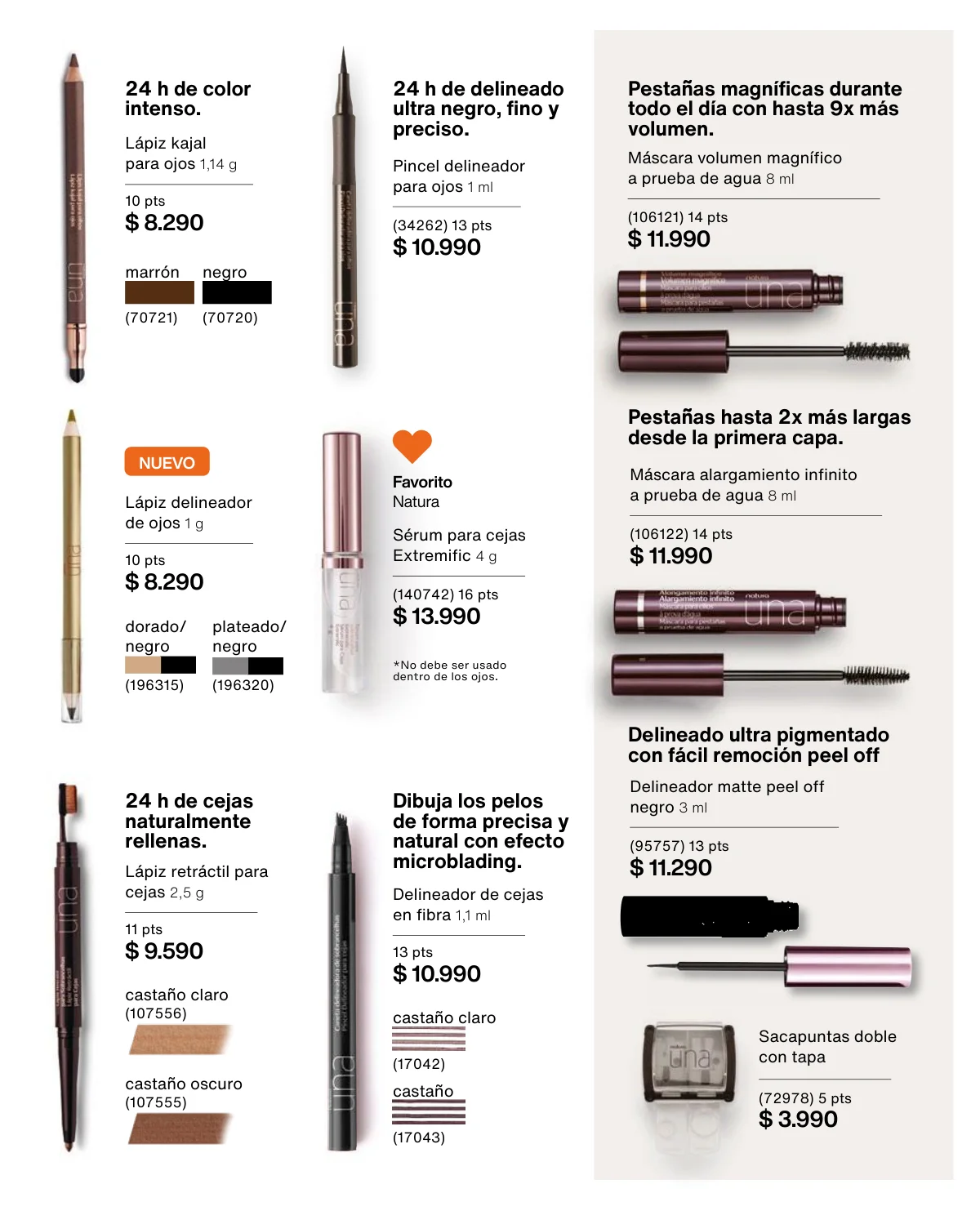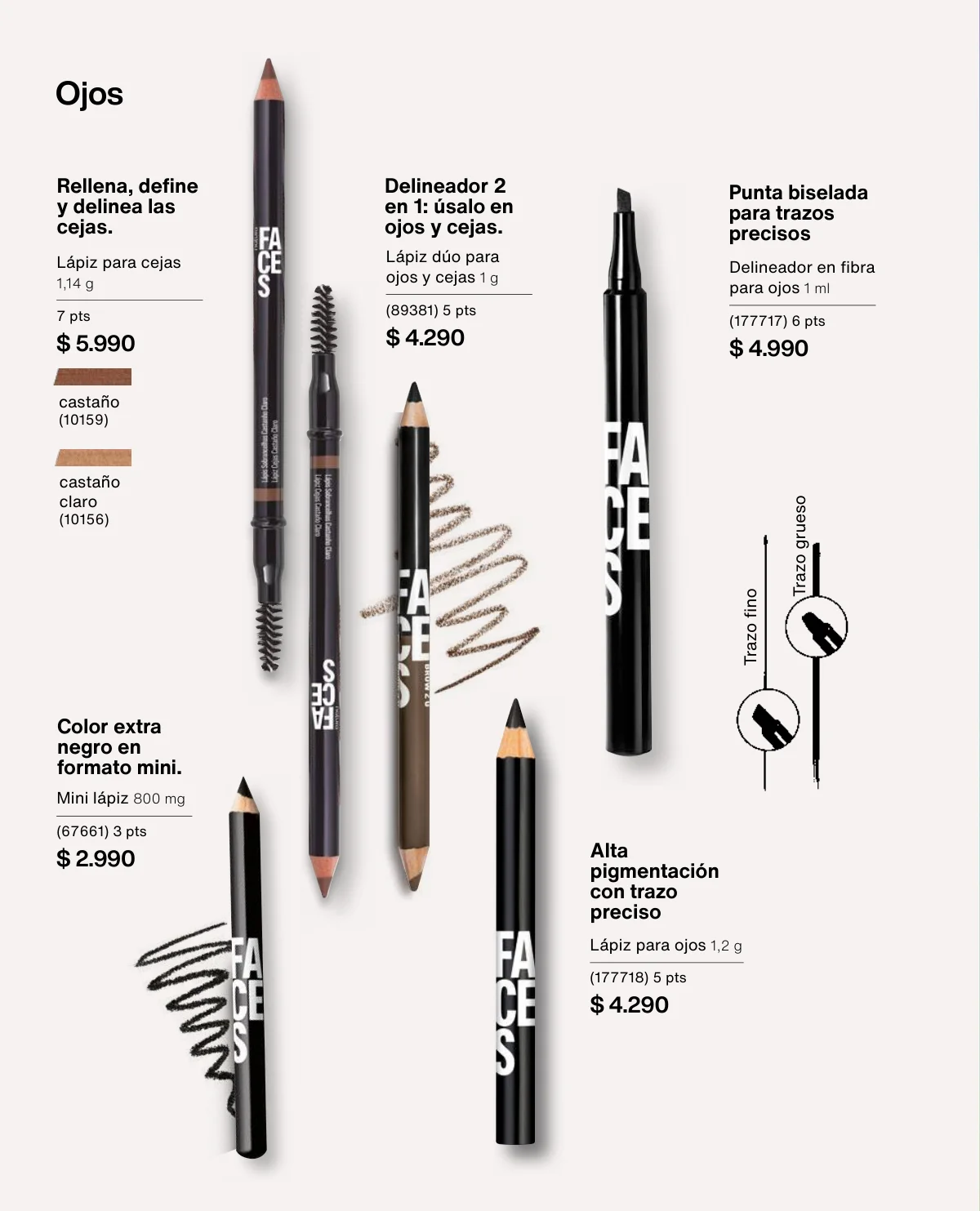Y para un maquillaje de impacto, las líneas UNA y Faces (página 65 en adelante) tiene las muestras más variadas de Primers UNA (productos para hacer durar el maquillaje), bases y rubores, sérum labial UNA o las llamativas paletas de sombras Faces o los labiales de hidratación 24 horas.